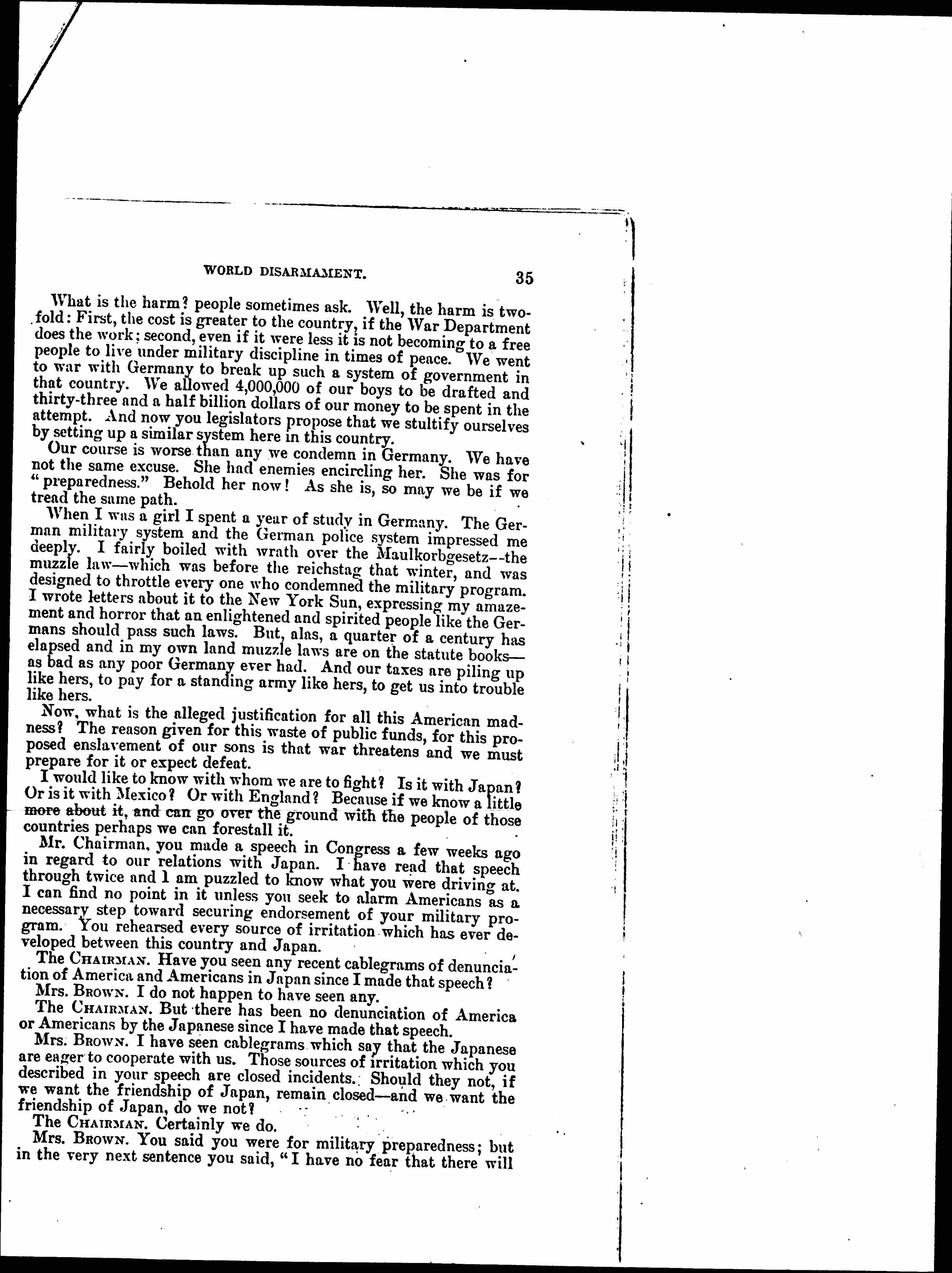 Mrs. BROWN. You said you were for military preparedness; but in the very next sentence you said, "I have no fear that there will [page 8] be war between Japan and the United States in my lifetime, nor even in the lifetime of my sons." And that is just how we women of the Women's International League for Peace and Freedom feel about it; we feel that there is no immediate nor even remote fear of war with Japan. For how is Japan going to attack us if we stay at home and mind our own business? Of course, if she sees us building great dreadnaughts, she grows alarmed and feverish and begins to build also.