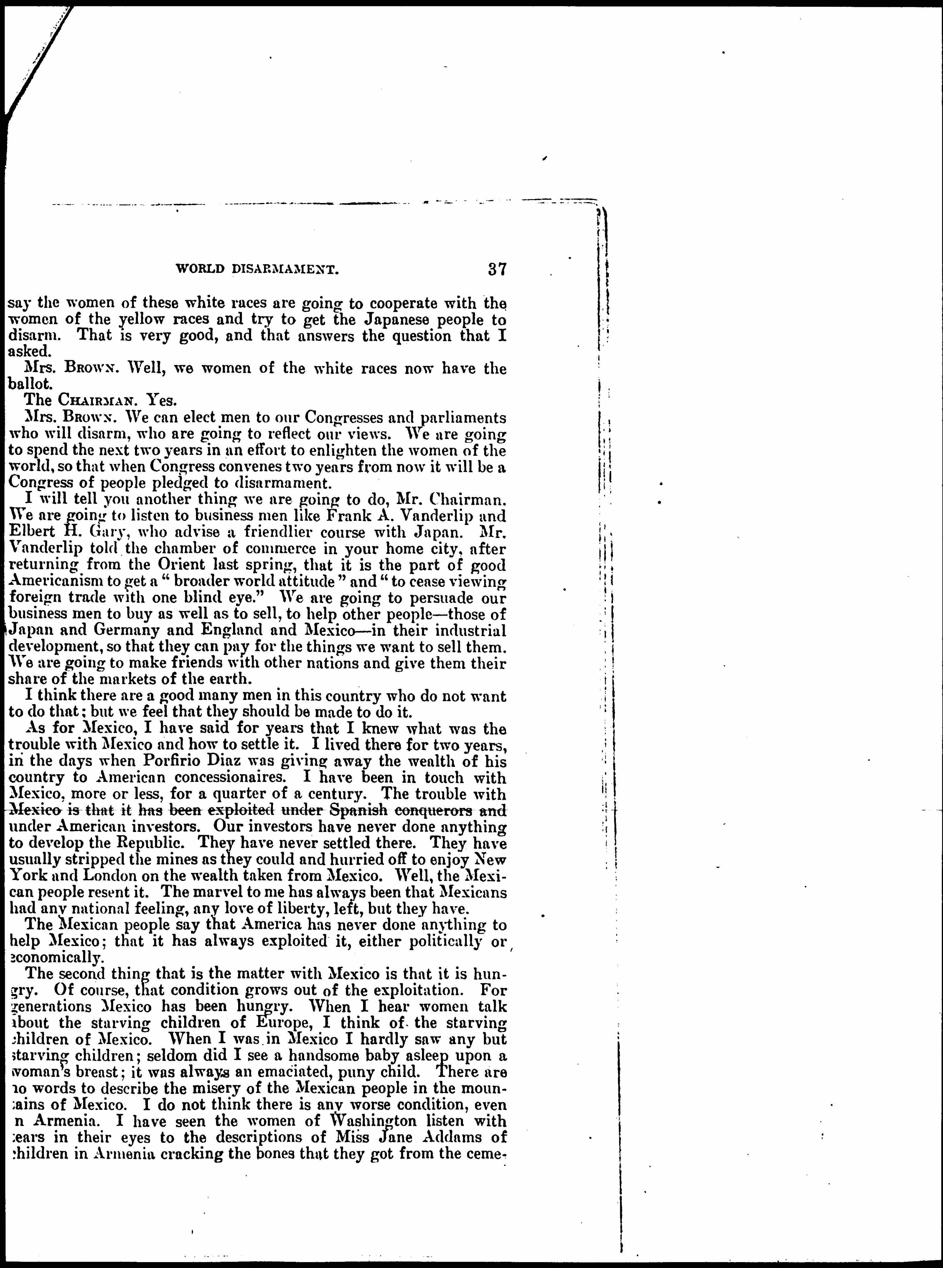 The second thing that is the matter with Mexico is that it is hungry. Of course, that condition grows out of the exploitation. For generations Mexico has been hungry. When I hear women talk about the starving children of Europe, I think of the starving children of Mexico. When I was in Mexico I hardly saw any but starving children; seldom did I see a handsome baby asleep upon a woman's breast; it was always an emaciated, puny child. There are no words to describe the misery of the Mexican people in the mountains of Mexico. I do not think there is any worse condition, even in Armenia. I have seen the women of Washington listen with tears in their eyes to the descriptions of Miss Jane Addams of children in Armenia cracking the bones that they got from the cemeteries [page 10] to get something to eat. And yet I am perfectly sure that some of those women who were so moved by Miss Addams were touched with the military spirit and had not thought that if we went to war with Mexico it would mean turning our machine guns on women and children who were suffering just as are the women and children of Armenia. We do not seem to see clearly so close at home.