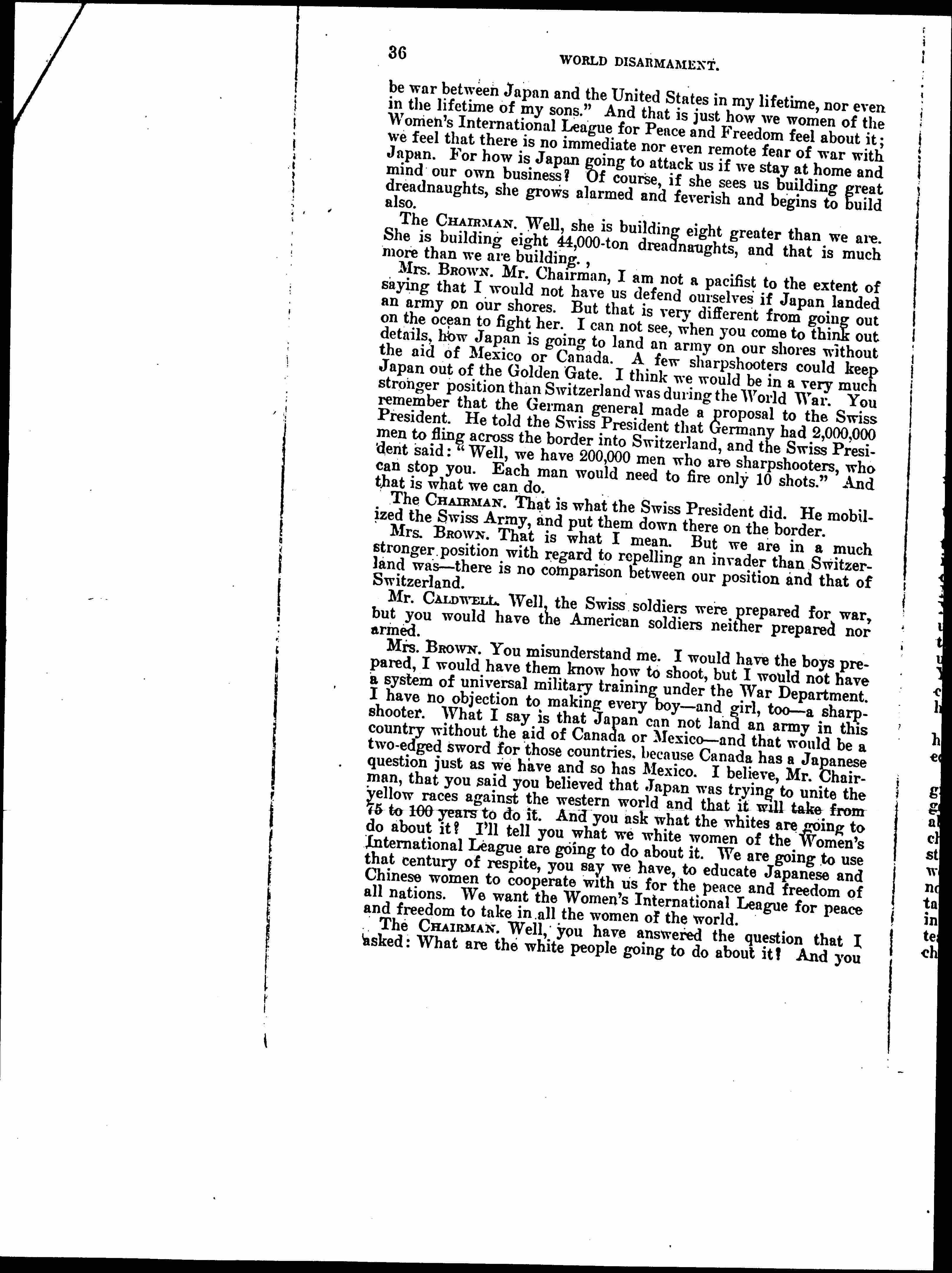 Mrs. BROWN. You misunderstand me. I would have the boys prepared, I would have them know how to shoot, but I would not have a system of universal military training under the War Department. I have no objection to making every boy -- and girl, too -- a sharpshooter. What I say is that Japan can not land an army in this country without the aid of Canada or Mexico -- and that would be a two-edged sword for those countries, because Canada has a Japanese question just as we have and so has Mexico. I believe, Mr. Chairman, that you said you believed that Japan was trying to unite the yellow races against the western world and that it will take from 75 to 100 years to do it. And you ask what the whites are going to do about it? I'll tell you what we white women of the Women's International League are going to do about it. We are going to use that century of respite, you say we have, to educate Japanese and Chinese women to cooperate with us for the peace and freedom of all nations. We want the Women's International League for Peace and Freedom to take in all the women of the world.