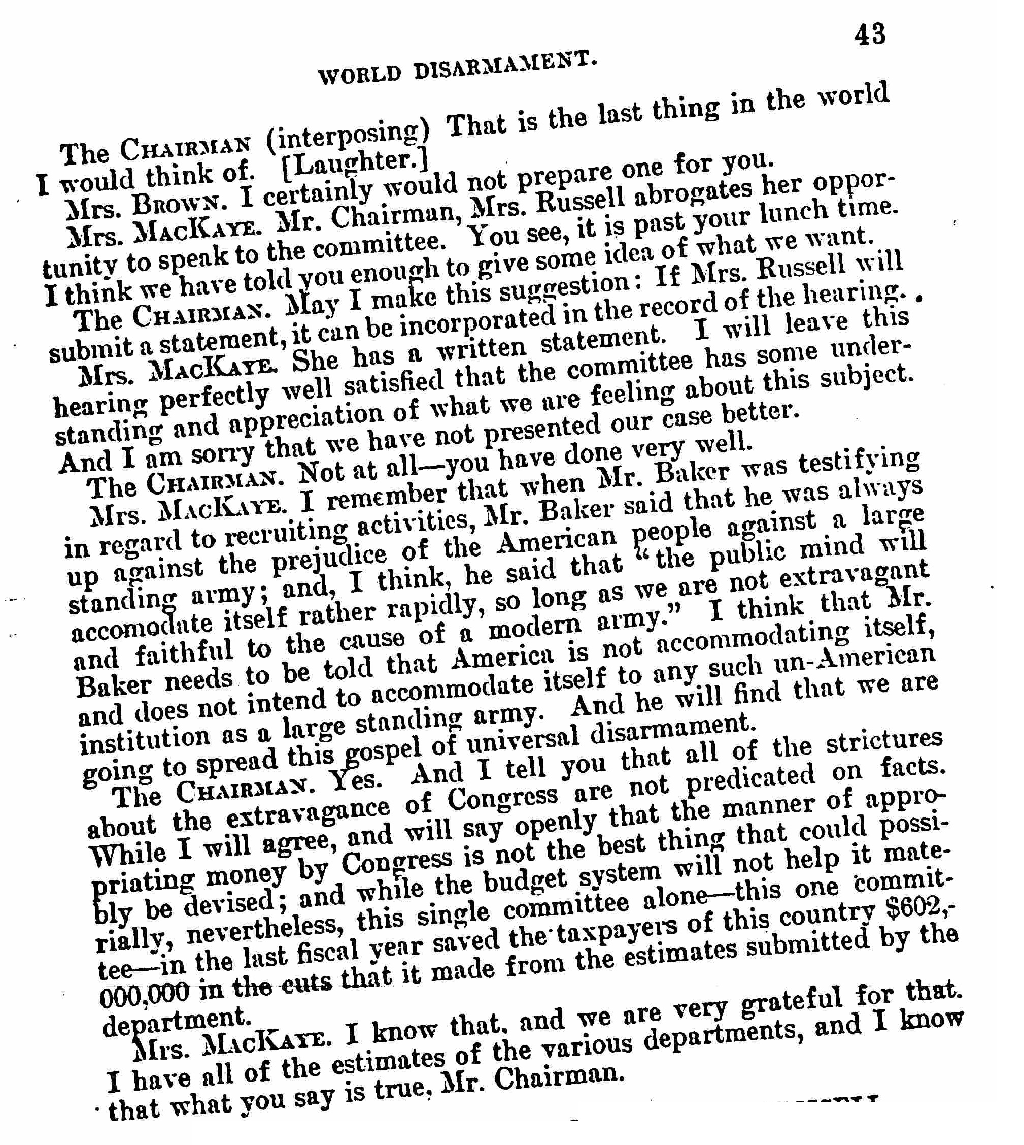 Mrs. MACKAYE. I remember that when Mr. Baker was testifying in regard to recruiting activities, Mr. Baker said that he was always up against the prejudice of the American people against a large standing army; and, I think, he said that "the public mind will accommodate itself rather rapidly, so long as we are not extravagant and faithful to the cause of a modern army." I think that Mr. Baker needs to be told that America is not accommodating itself, and does not intend to accommodate itself to any such un-American institution as a large standing army. And he will find that we are going to spread this gospel of universal disarmament.