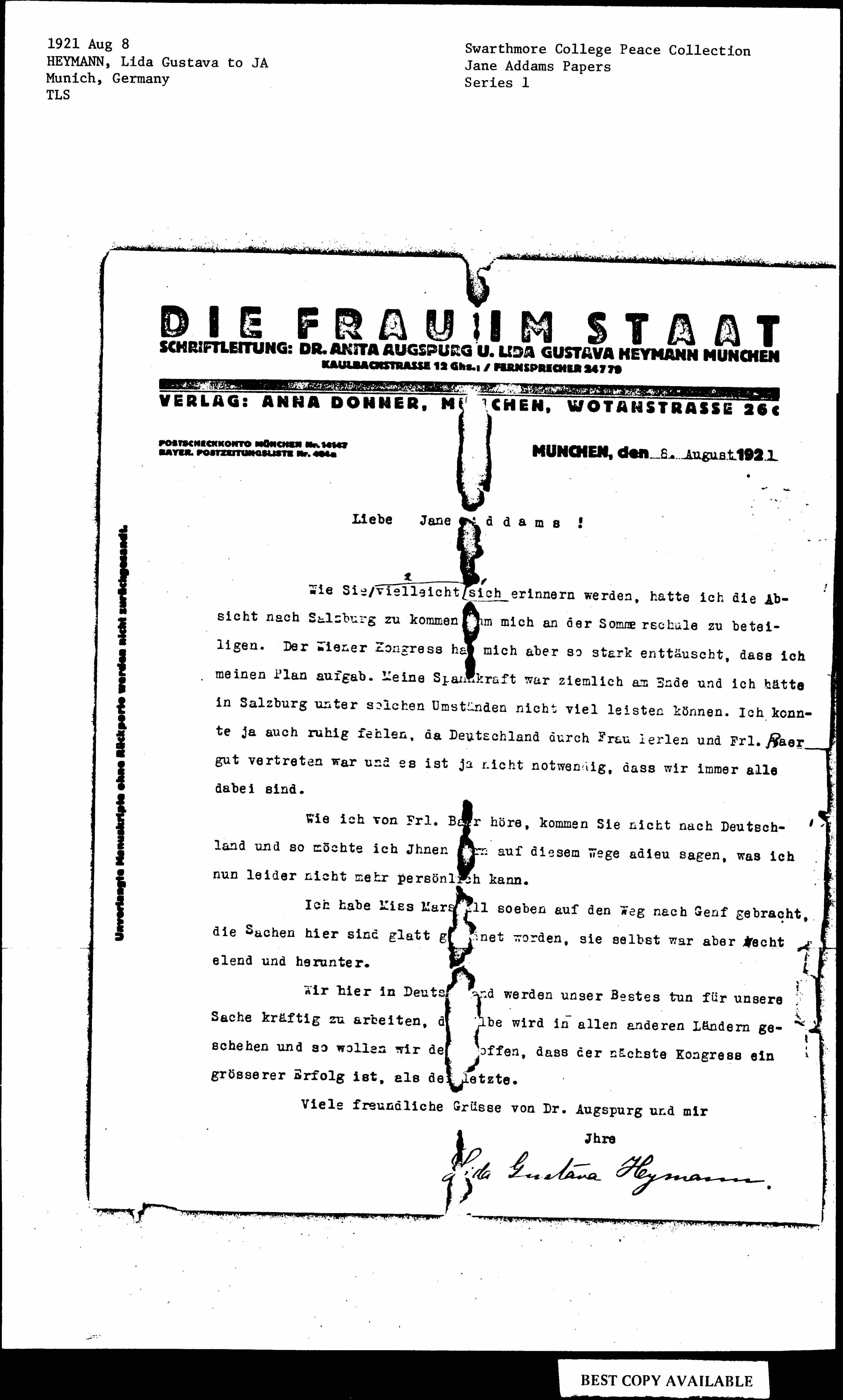 As you ↑perhaps↓ may remember, I had the intention to come to Salzburg [illegible word] to take part in the summer school. But the Vienna Congress disappointed me so much that I abandoned my plan. My resilience was almost gone, and I couldn’t have accomplished much in Salzburg under such circumstances. I could quite possibly be absent since Germany was well represented through Ms. [Perlen?] and Ms. Baer and it is not necessary for all of us to always be there.