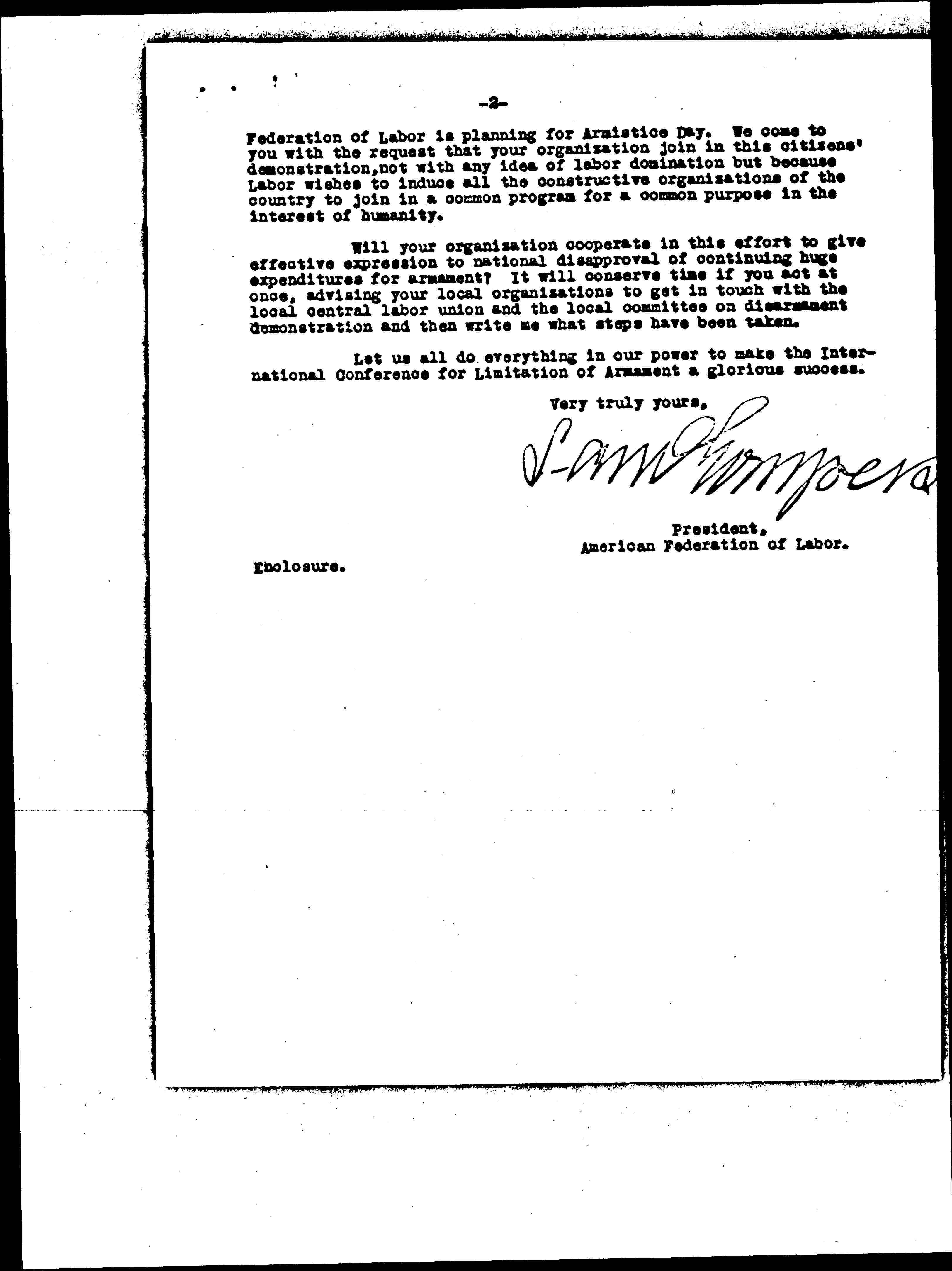 The enclosed letter will show you what the American [page 2] Federation of Labor is planning for Armistice Day. We come to you with the request that your organization join in this citizens' demonstration, not with any idea of labor domination but because Labor wishes to induce all the constructive organizations of the country to join in a common program for a common purpiose in the interest of humanity.