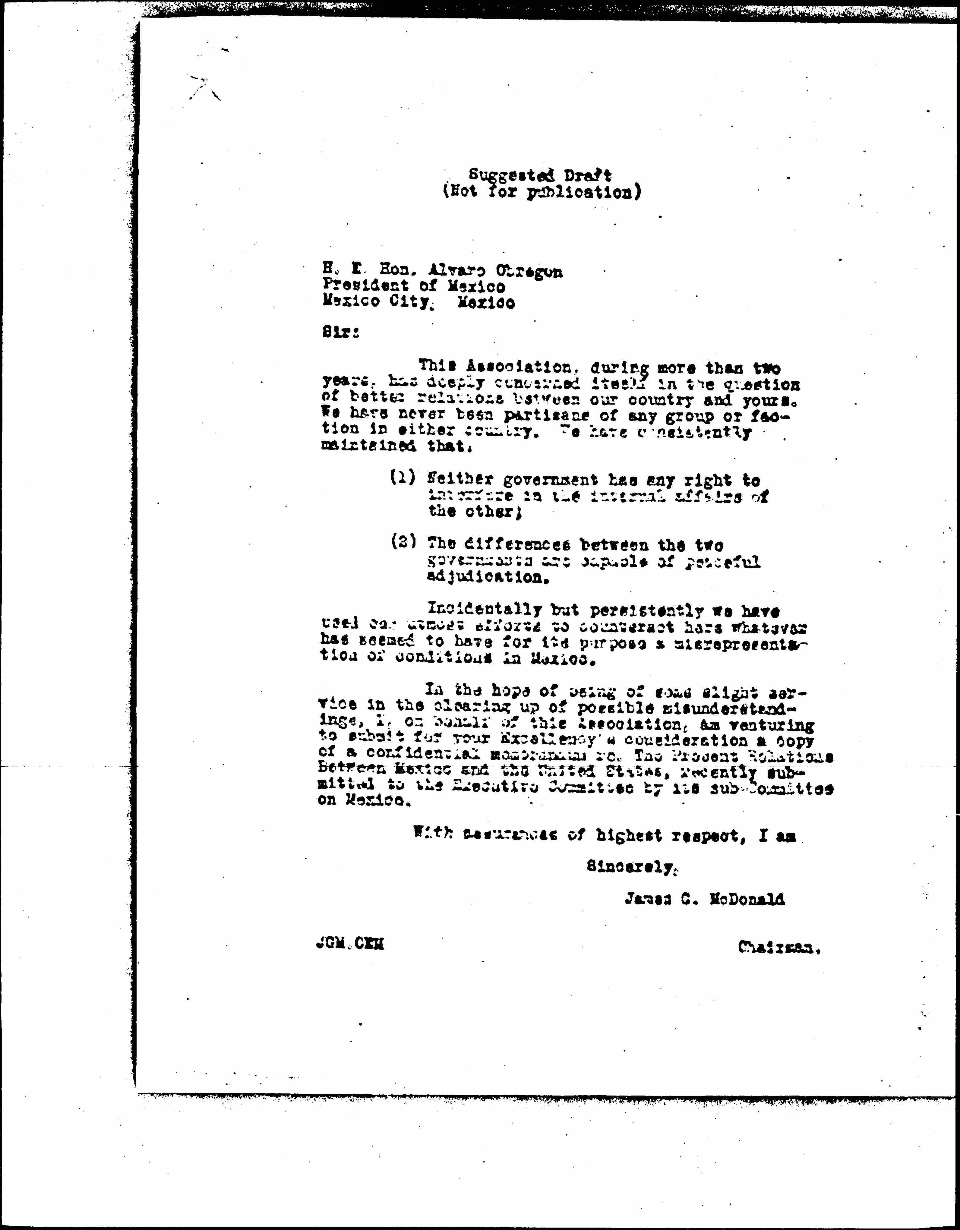 In the hope of being of some slight service in the clearing up of possible misunderstandings, I, on behalf of this Association, am venturing to submit for your Excellency's consideration a copy of a confidential memorandum re: The Present Relations Between Mexico and the United States, recently submitted to the Executive Committee by its sub-Committee on Mexico.
