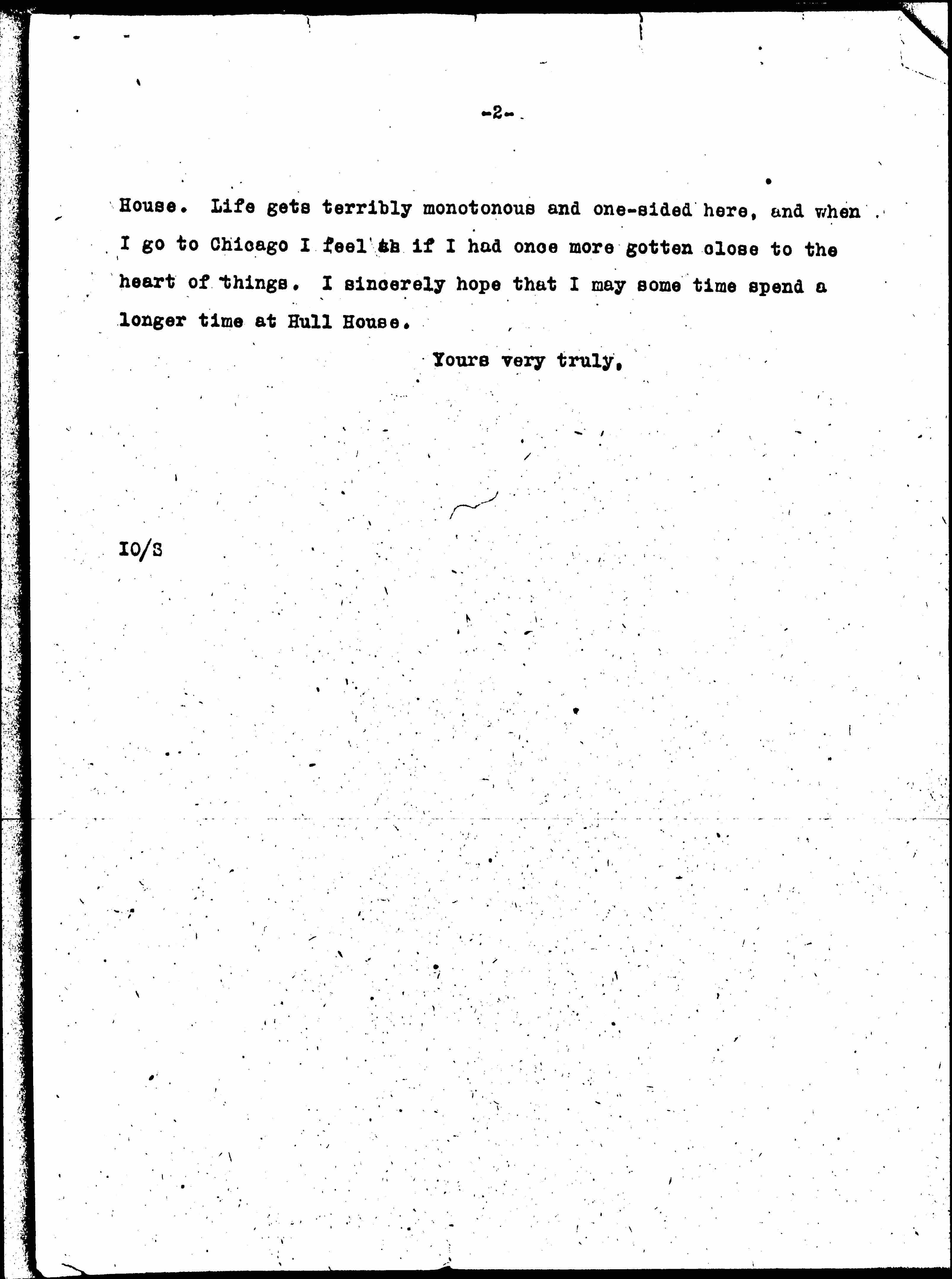 I cannot tell you how much I appreciate stopping at Hull [page 2] House. Life gets terribly monotonous and one-sided here, and when I go to Chicago I feel as if I had once more gotten close to the heart of things. I sincerely hope that I may some time spend a longer time at Hull House.