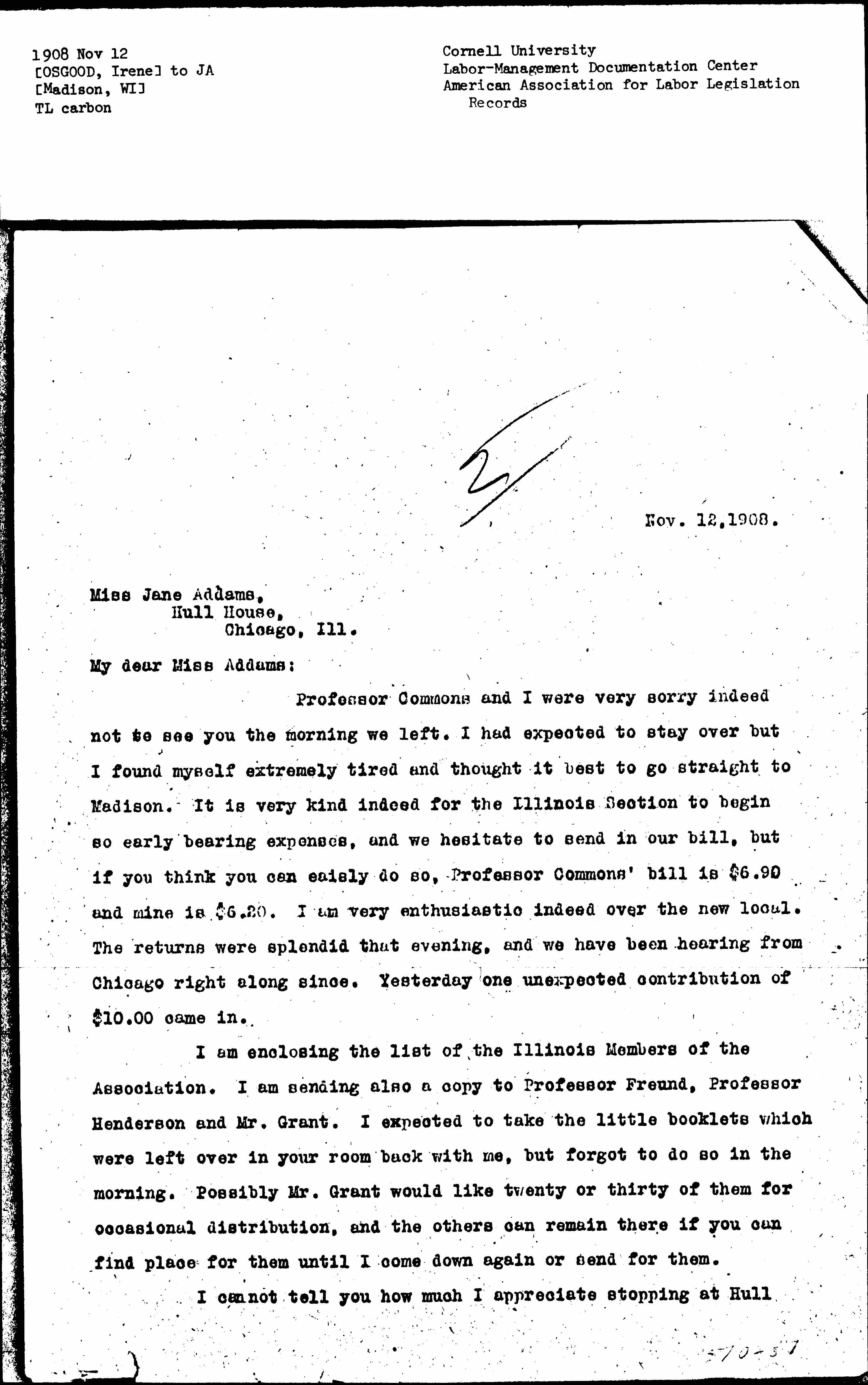 Professor Commons and I were very sorry indeed not to see you the morning we left. I had expected to stay over but I found myself extremely tired and thought it best to go straight to Madison. It is very kind indeed for the Illinois Section to begin so early bearing expenses, and we hesitate to send in our bill, but if you think you can easily do so, Professor Commons' bill is $6.90 and mine is $6.20. I am very enthusiastic indeed over the new local. The returns were splendid that evening, and we have been heading from Chicago right along since. Yesterday one unexpected contribution of $10.00 came in.