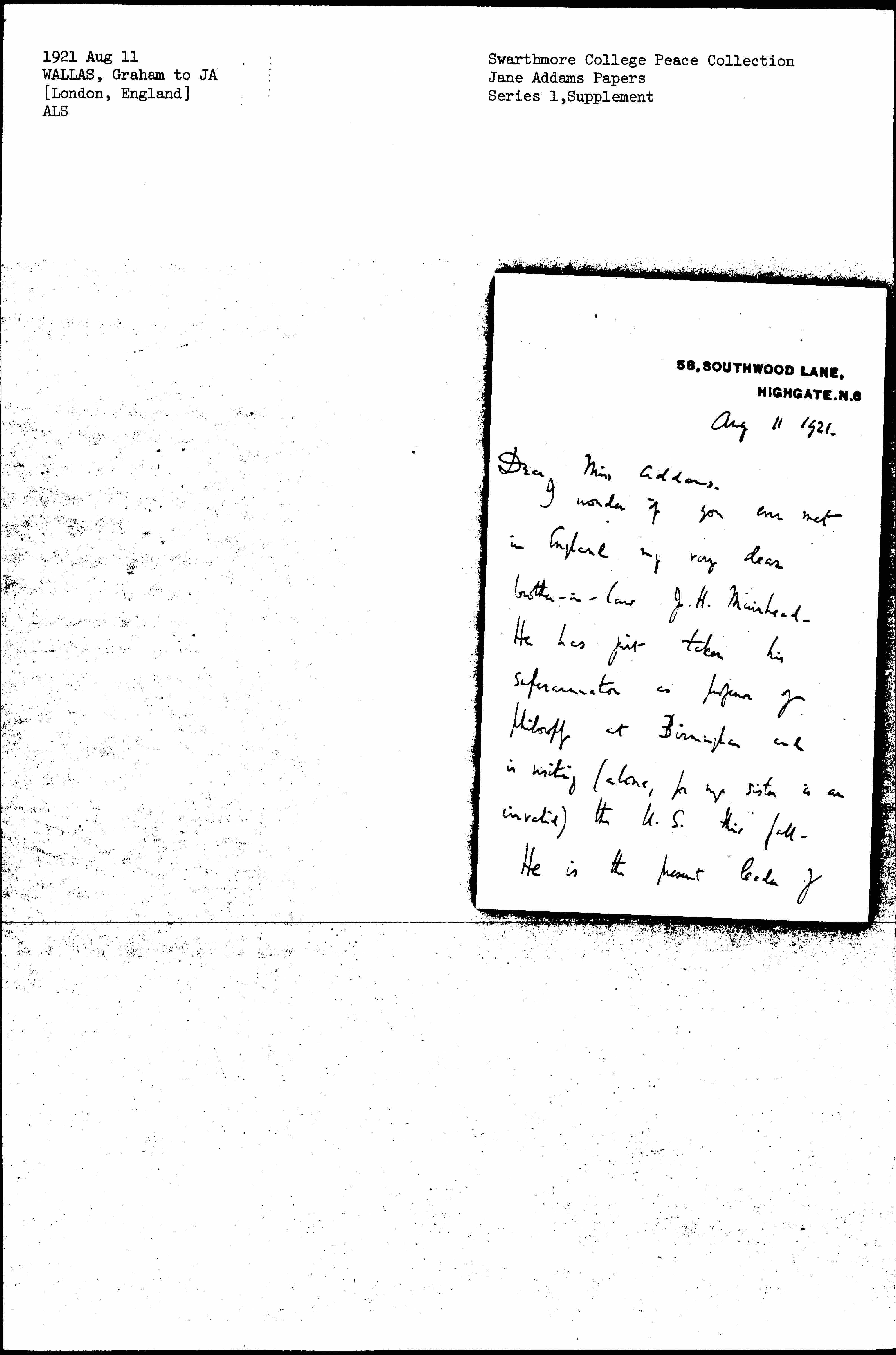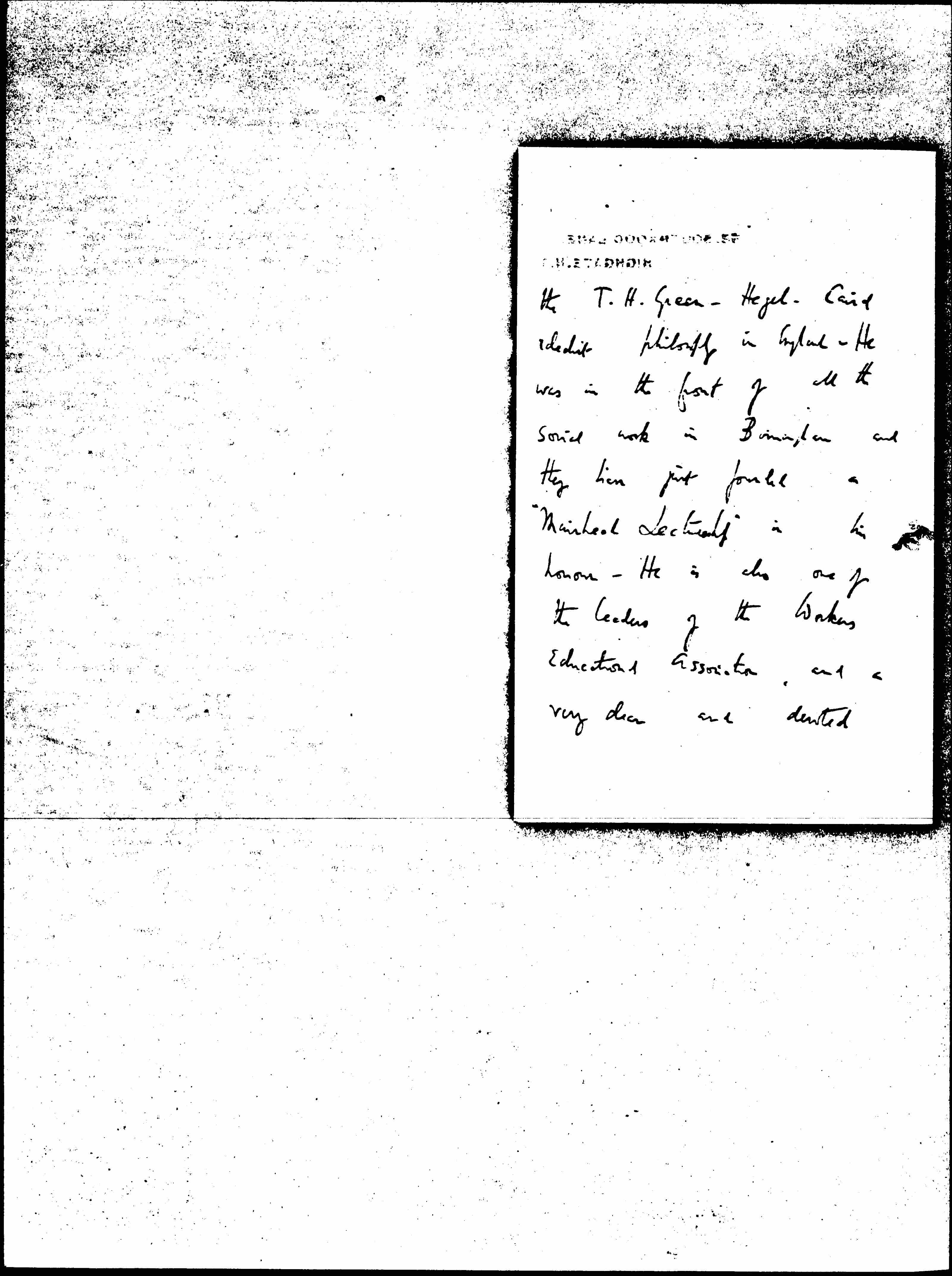 He is the present leader of [page 2] the T. H. Green -- Hegel -- Caird idealist philosophy in England. He was in the front of all the social work in Birmingham and they just founded a "Muirhead lectureship" in his [honor]. He is also one of the leaders of the Workers Educational Association, and a very dear and devoted [page 3] friend of man.