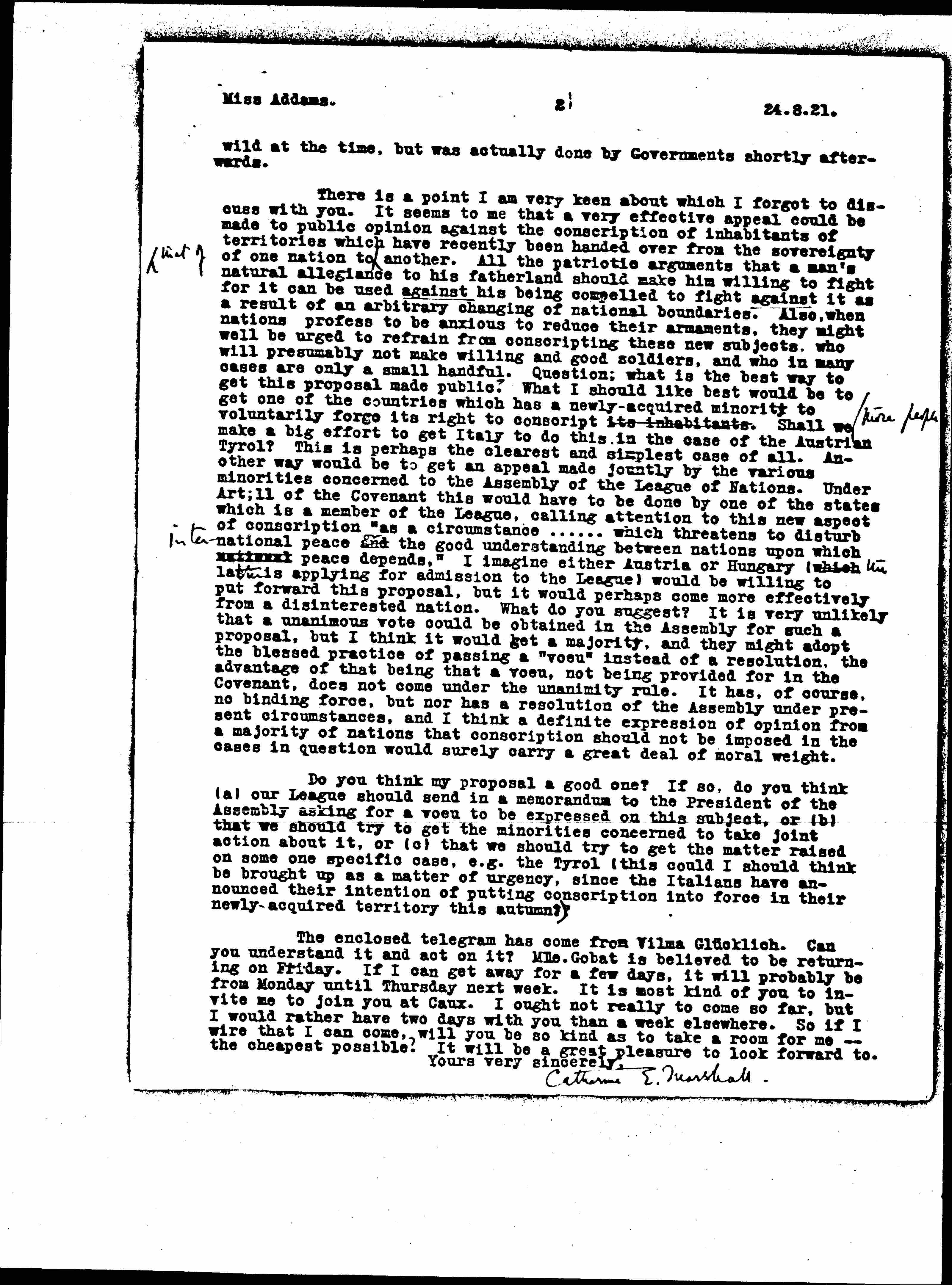 There is a point I am very keen about which I forgot to discuss with you. It seems to me that a very effective appeal could be made to public opinion against the conscription of inhabitants of territories which have recently been handed over from the sovereignty of one nation to ↑that of↓ another. All the patriotic arguments that a man's natural allegiance to his fatherland should make him willing to fight for it can be used against his being compelled to fight against it as a result of an arbitrary changing of national boundaries. Also, when nations profess to be anxious to reduce their armaments, they might well be urged to refrain from conscripting these new subjects, who will presumably not make willing and good soldiers, and who in many cases are only a small handful. Question: what is the best way to get this proposal made public? What I should like best would be to get one of the countries which has a newly-acquired minority to voluntarily forge its right to conscript its inhabitants ↑[illegible] people↓. Shall we make a big effort to get Italy to do this in the case of the Austrian Tyrol? This is perhaps the clearest and simplest case of all. Another way would be to get an appeal made jointly by the various minorities concerned to the Assembly of the League of Nations. Under Art. 11 of the Covenant this would have to be done by one of the states which is a member of the League, calling attention to this new aspect of conscription "as a circumstance … which threatens to disturb [international] peace and ↑or↓ the good understanding between nations upon which [illegible] peace depends." I imagine either Austria or Hungary (which ↑the↓ latter is applying for admission to the League) would be willing to put forward this proposal, but it would perhaps come more effectively from a disinterested nation. What do you suggest? It is very unlikely that a unanimous vote could be obtained in the Assembly for such a proposal, but I think it would get a majority, and they might adopt the blessed practice of passing a "voeu" instead of a resolution, the advantage of that being a voeu, not being provided for in the Covenant, does not come under the unanimity rule. It has, of course, no binding force, but nor has a resolution of the Assembly under present circumstances, and I think a definite expression of opinion from a majority of nations that conscription should not be imposed in the cases in question would surely carry a great deal of moral weight.