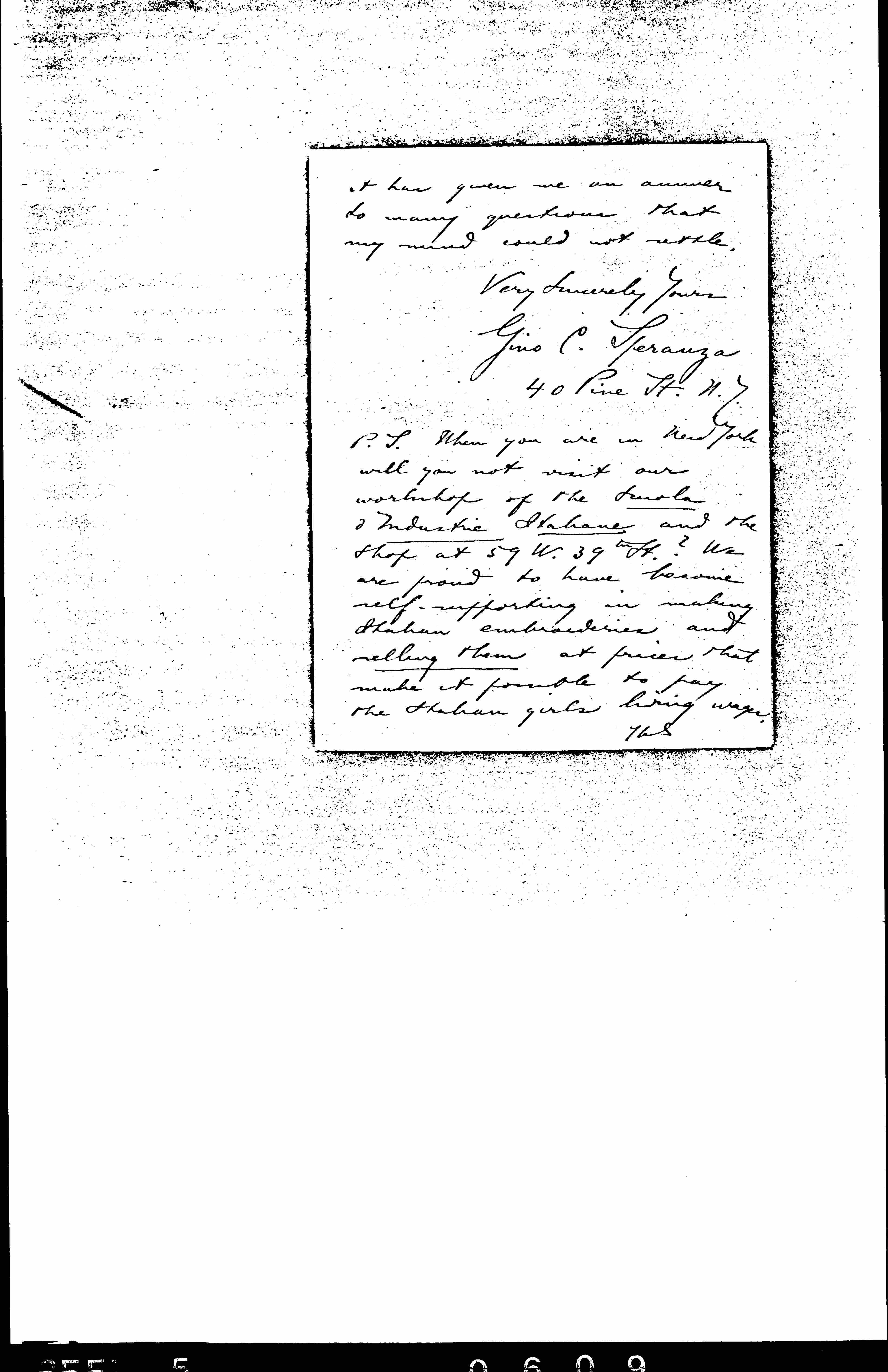 P.S. When you are in New York will you not visit our workshop of the Scuola d'Industrie Italiane and the shop at 59 W. 39th St.? We are proud to have become self-supporting in making Italian embroideries and selling them at prices that make it possible to pay the Italian girls living wages.
