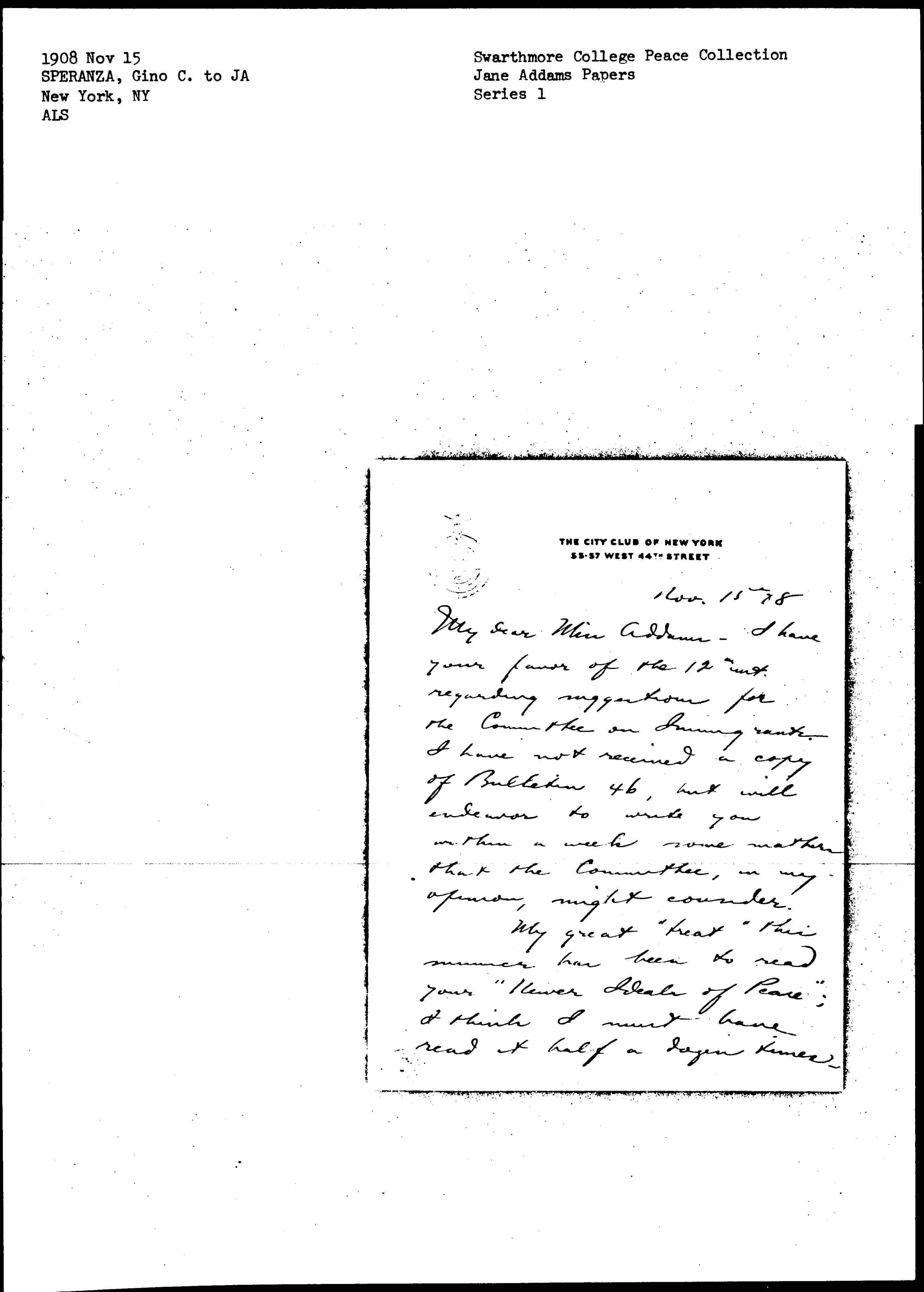 My dear Miss Addams -- I have your favor of the 12th int. regarding suggestions for the Committee on Immigration. I have not received a copy of Bulletin 46, but will endeavor to write you within a week some matters that the Committee, in my opinion, might consider.