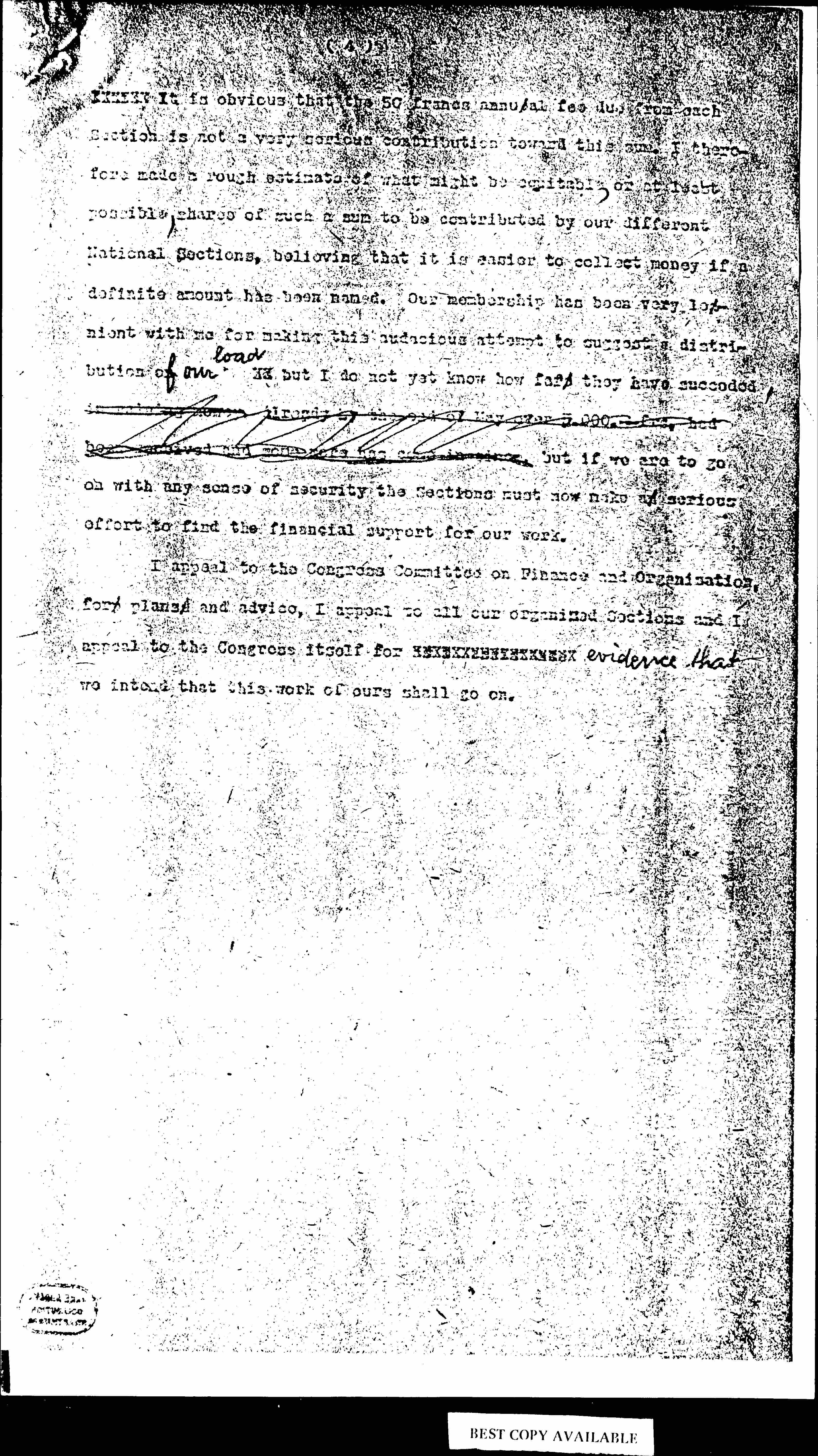 I appeal to the Congress Committee on Finance and Organization, [for plans] and advice, I appeal to all our organized Sections and I appeal to the Congress itself for [illegible] ↑evidence that↓ we intend that this work of ours shall go on.
