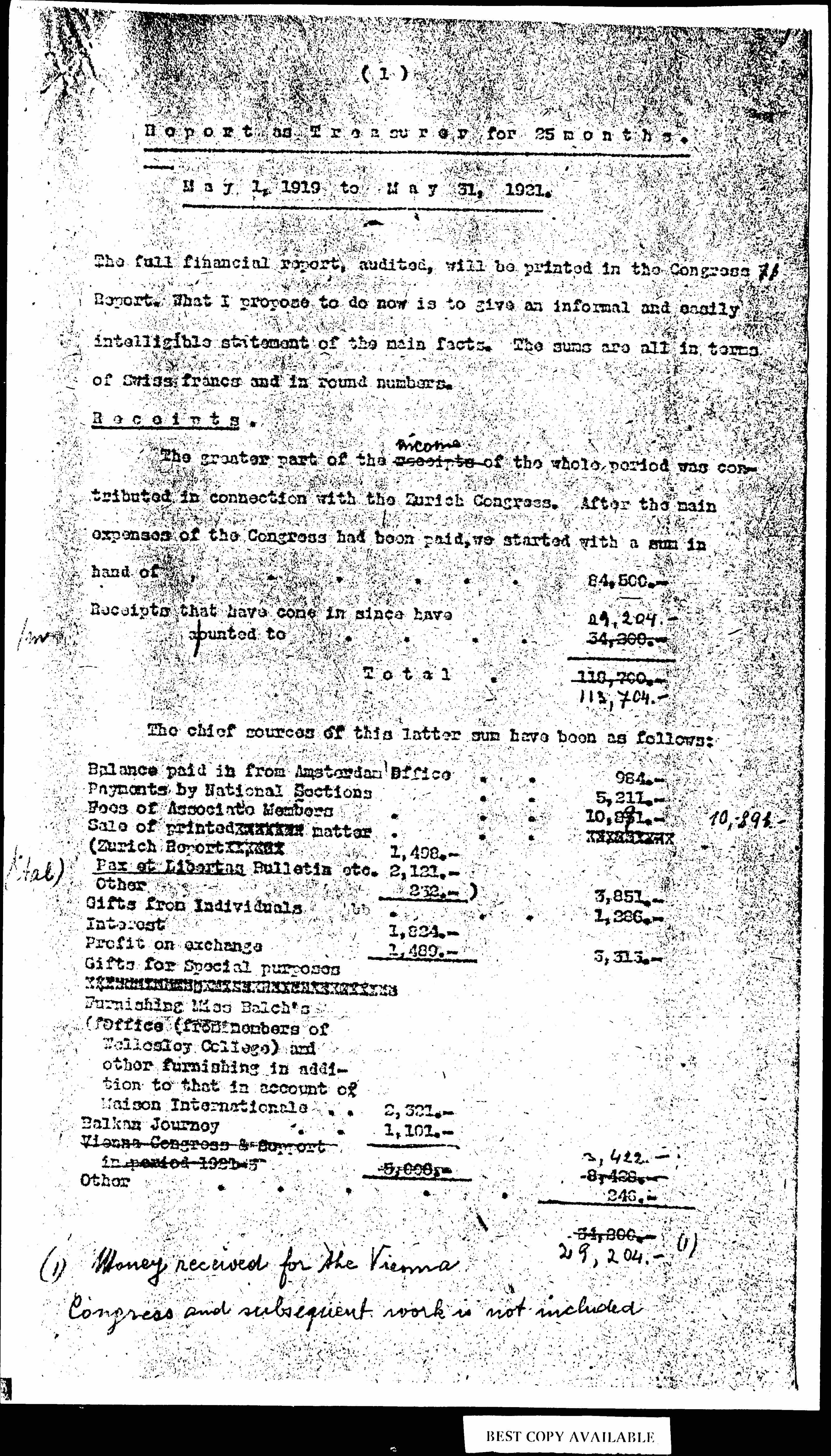 [illegible] It is obvious that the 50 francs annual fee due from each Section is not a very serious contribution toward this sum. I therefore made a rough estimate of what might be equitable, or at least possible, shares of such a sum to be contributed by our different National Sections, believing that it is easier to collect money if a definite amount has been named. Our membership has been very [lenient] with me for making this audacious attempt to suggest distribution ↑of our load↓ [illegible] but I do not yet know how far they have succeeded, [in] [illegible] already by the end of May over 5,000. frs. had been [illegible] and more has come in [illegible] but if we are to go on with any sense of security the Sections must now make a serious effort to find the financial support for our work.