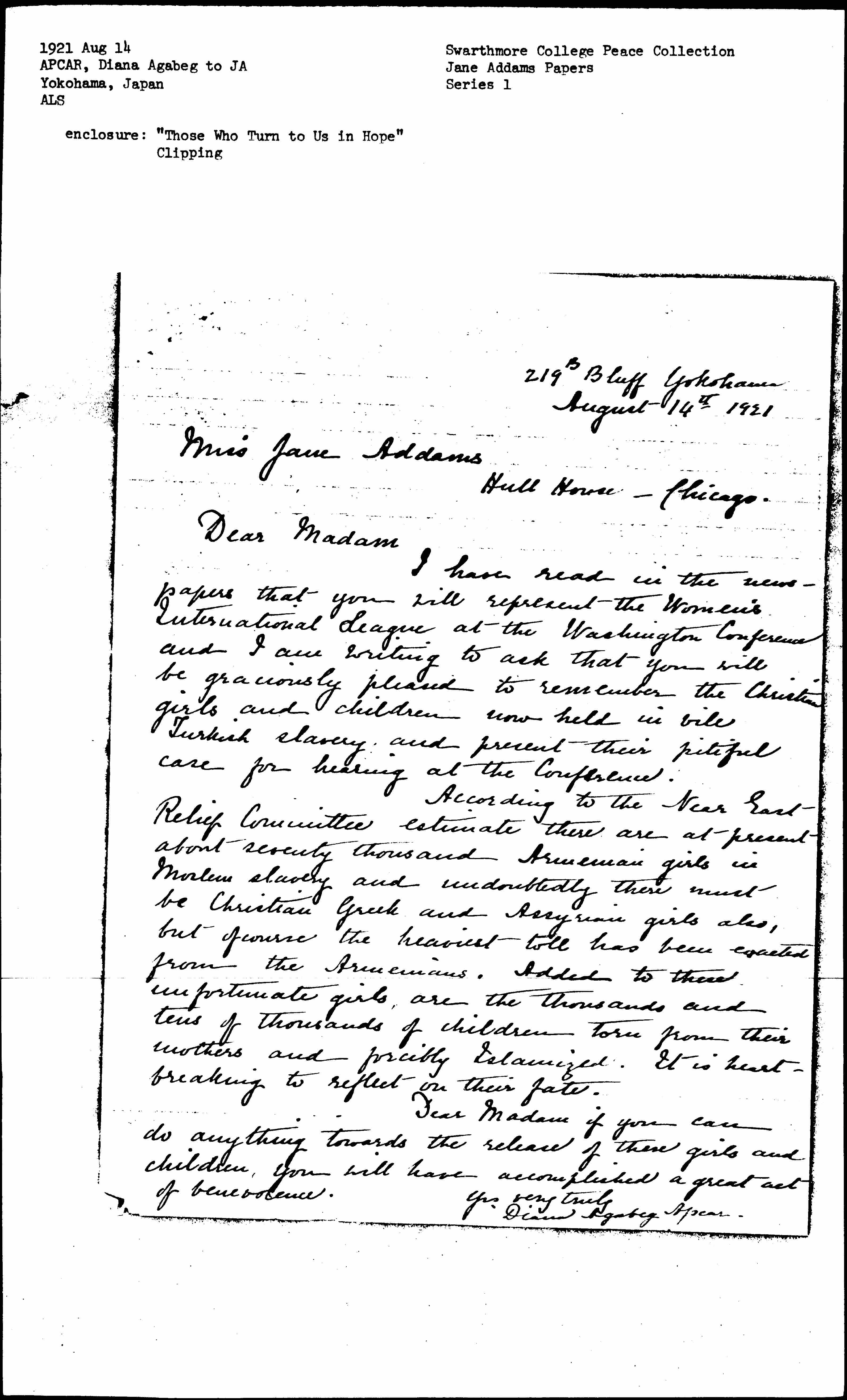 I have read in the newspapers that you will represent the Women's International League at the Washington Conference and I am writing to ask that you will be graciously pleased to remember the Christian girls and children now held in vile Turkish slavery and present their pitiful case for hearing at the Conference.