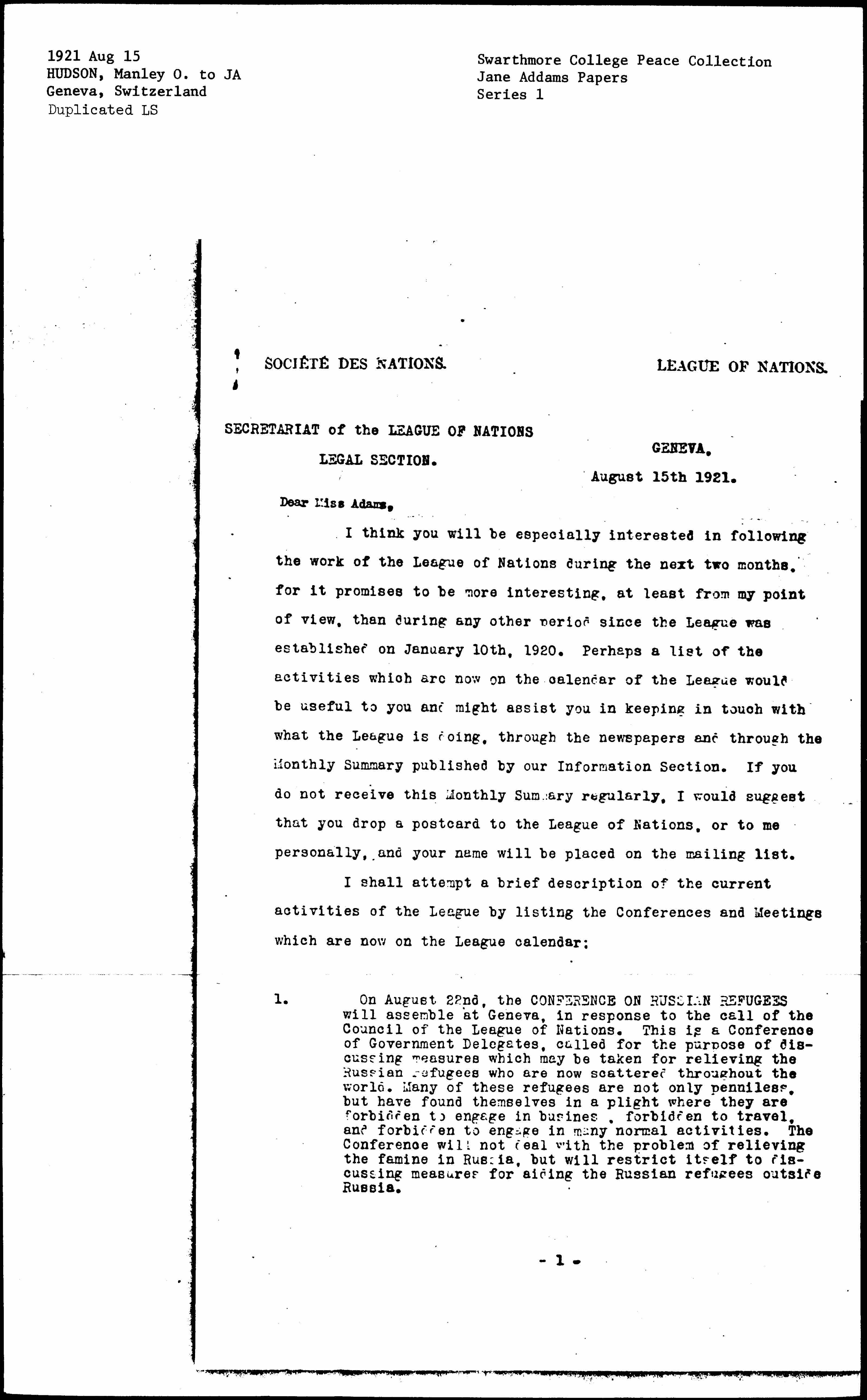 I think you will be especially interested in following the work of the League of Nations during the next two months, for it promises to be more interesting, at least from my point of view, than during any other period since the League was established on January 10th, 1920. Perhaps a list of the activities which are now on the calendar of the League would be useful to you and might assist you in keeping in touch with what the League is doing, through the newspapers and through the Monthly Summary published by our Information Section. If you do not receive this Monthly Summary regularly, I would suggest that you drop a postcard to the League of Nations, or to me personally, and your name will be placed on the mailing list.