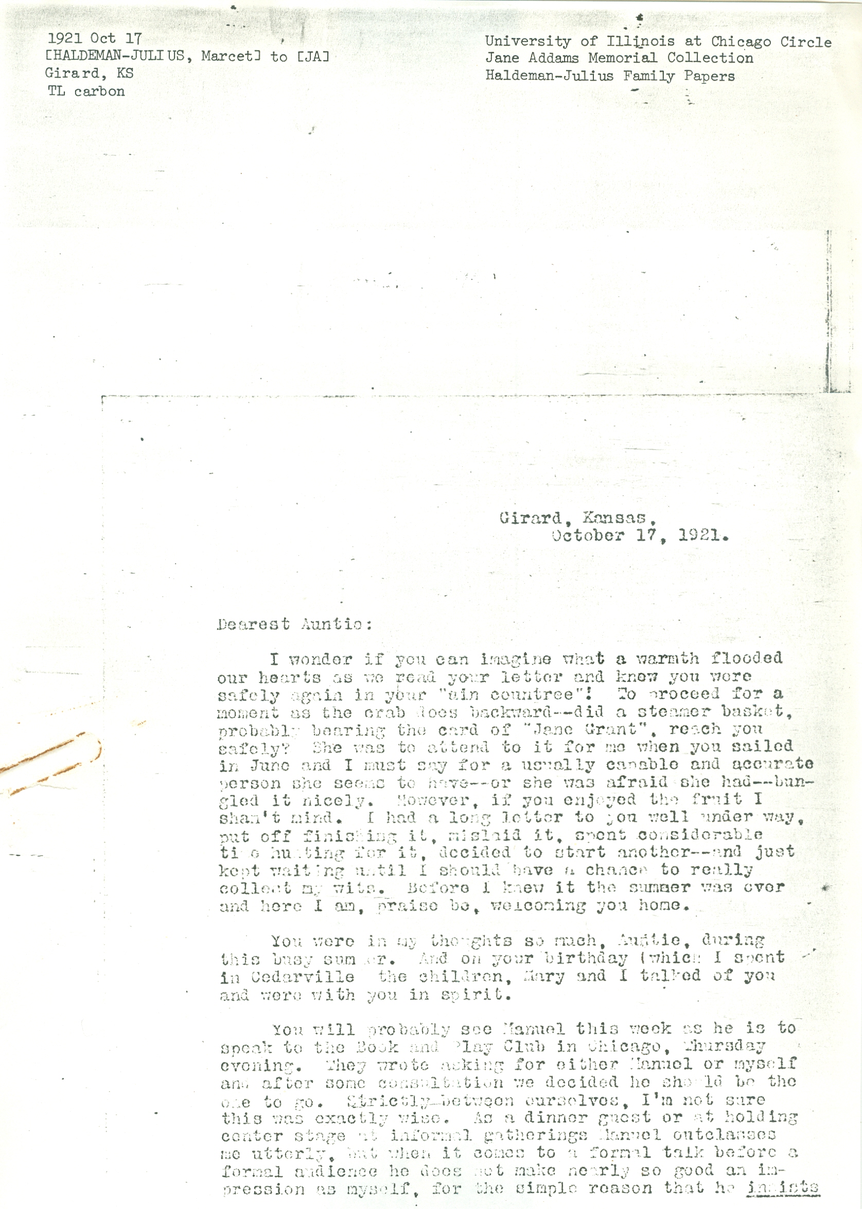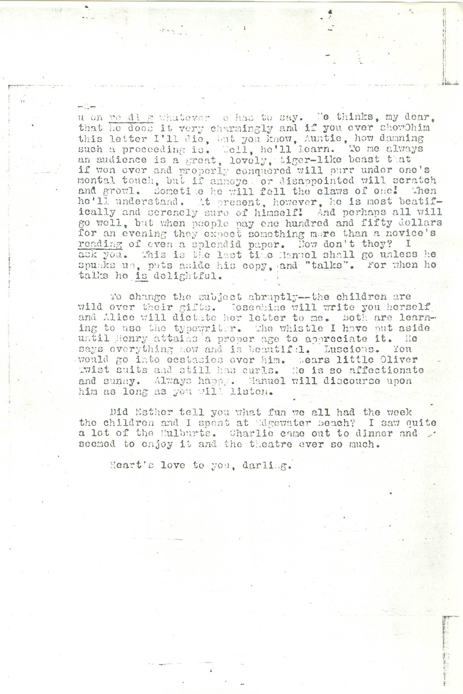 You will probably see Manuel this week as he is to speak to the Book and Play Club in Chicago, Thursday evening. They wrote asking for either Manuel or myself and after some consultation we decided he should be the one to go. Strictly between ourselves, I'm not sure this was exactly wise. As a dinner guest or at holding center stage at informal gatherings Manuel outclasses me utterly, but when it comes to a formal talk before a formal audience he does not make nearly so good an impression as myself, for the simple reason that he insists [page 2] upon reading whatever [he] has to say. He thinks, my dear, that he does it very charmingly and if you ever show him this letter I'll die, but you know, Auntie, how damning such a proceeding is. Well, he'll learn. To me always an audience is a great, lovely, tiger-like beast that if won over and properly conquered will purr under one's mental touch, but if [annoyed] or disappointed will scratch and growl. Sometime he will [feel] the claws of one! Then he'll understand. At present, however, he is most beatifically and serenely sure of himself! And perhaps all will go well, but when people pay one hundred and fifty dollars for an evening they expect something more than a novice's reading of even a splendid paper. Now don't they? I ask you. This is the last time Manuel shall go unless he spunks up, puts aside his copy, and "talks". For when he talks he is delightful.