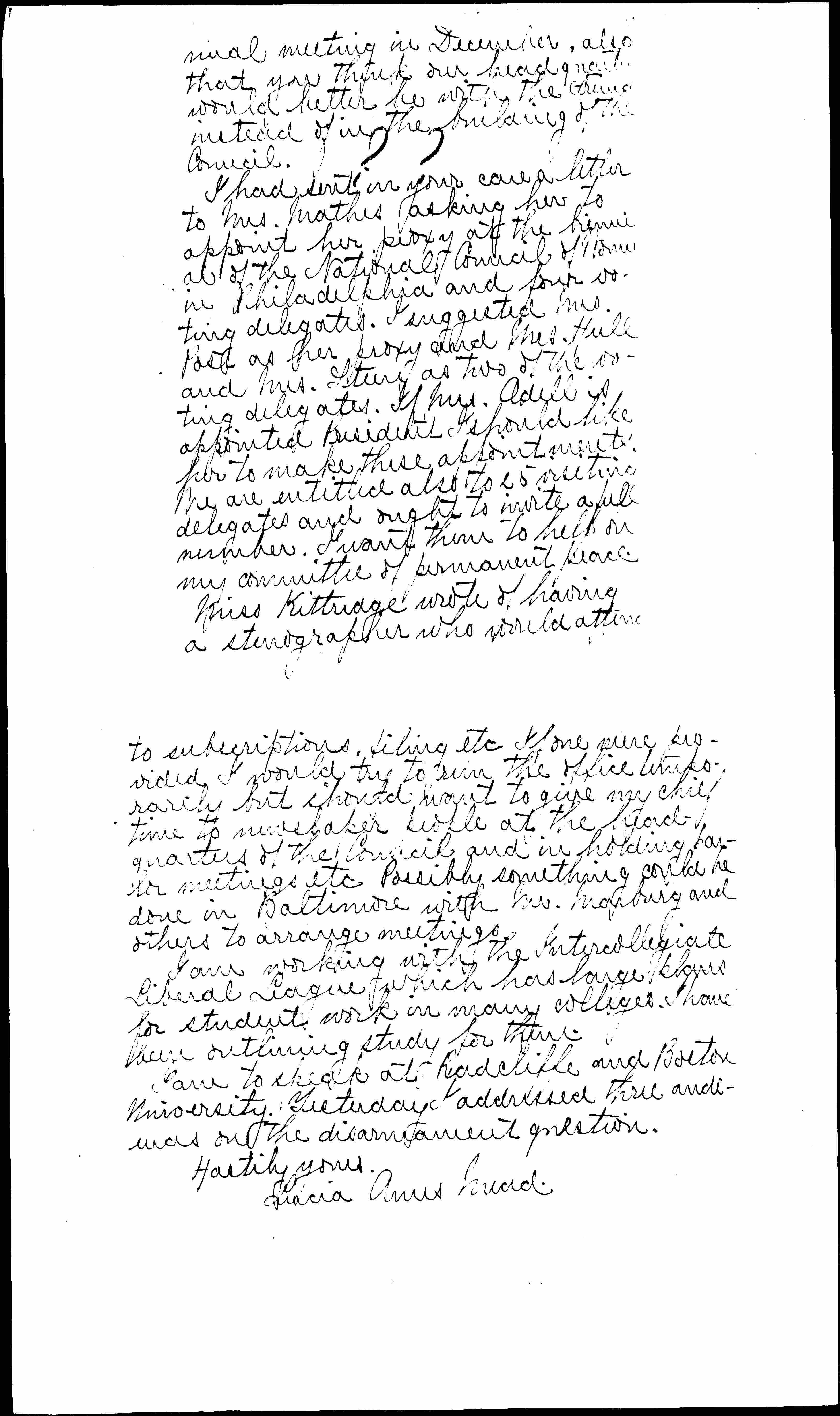 I had sent in your care a letter to Mrs. Mathes asking her to appoint her proxy at the biennial of the National Council of [Women] in Philadelphia and four voting delegates. I suggested Mrs. Post as her proxy and Mrs. Hull and Mrs. [illegible name] as two of the voting delegates. If Mrs. Odell is appointed President I should like her to make these appointments. We are entitled also to 25 visiting delegates and ought to invite a full number. I want them to help on my committee of permanent peace.