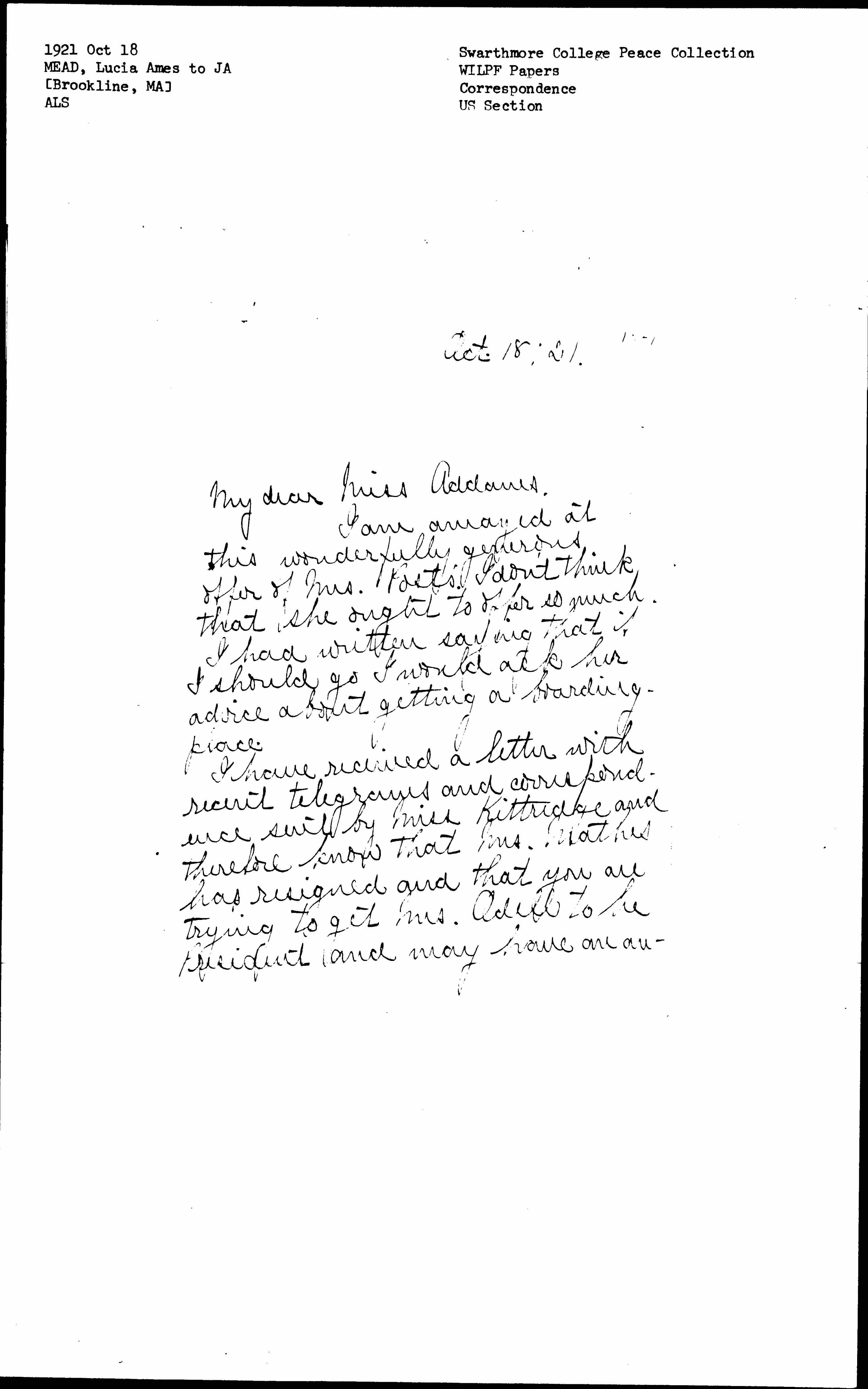 I have received a letter with recent telegrams and correspondence sent by Miss Kittredge and therefore know that Mrs. Mathes has resigned and that you are trying to get Mrs. Odell to be President and may have an annual [page 2] meeting in December, also that you think our [headquarters] would better be with the [Friends?] instead of in the building of the Council.