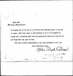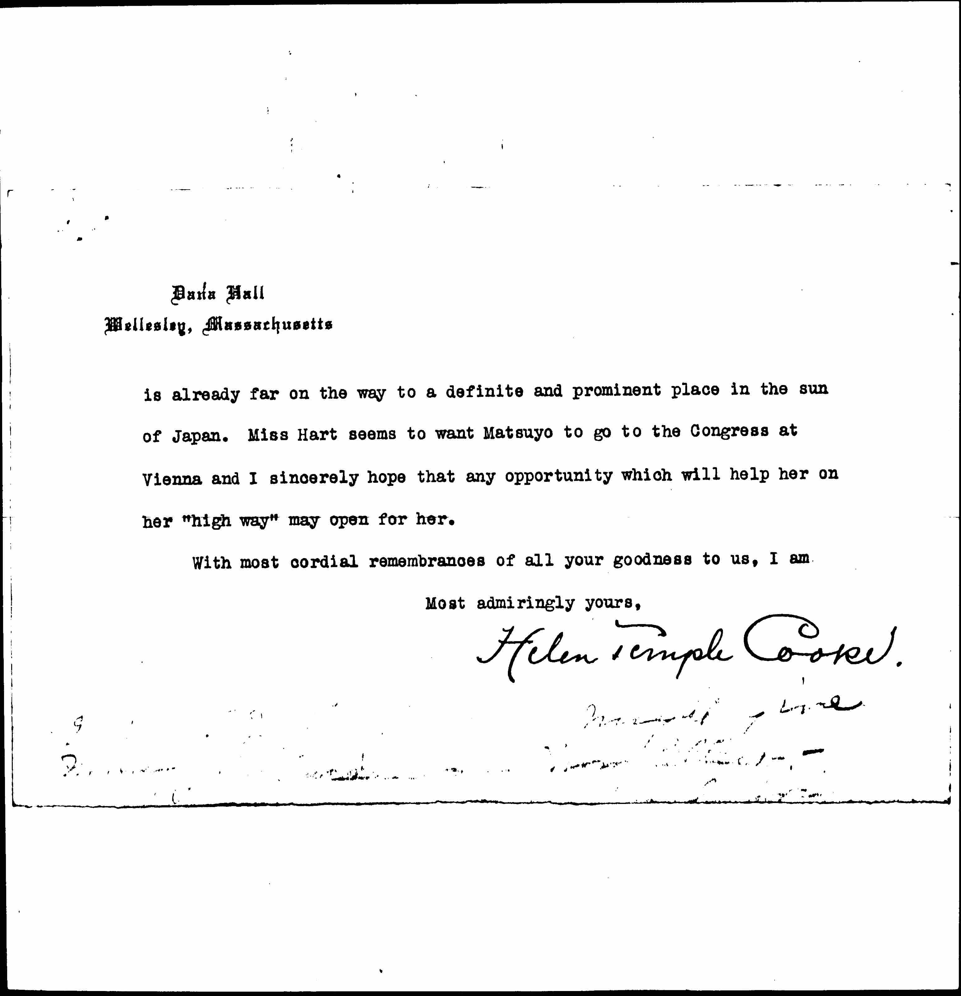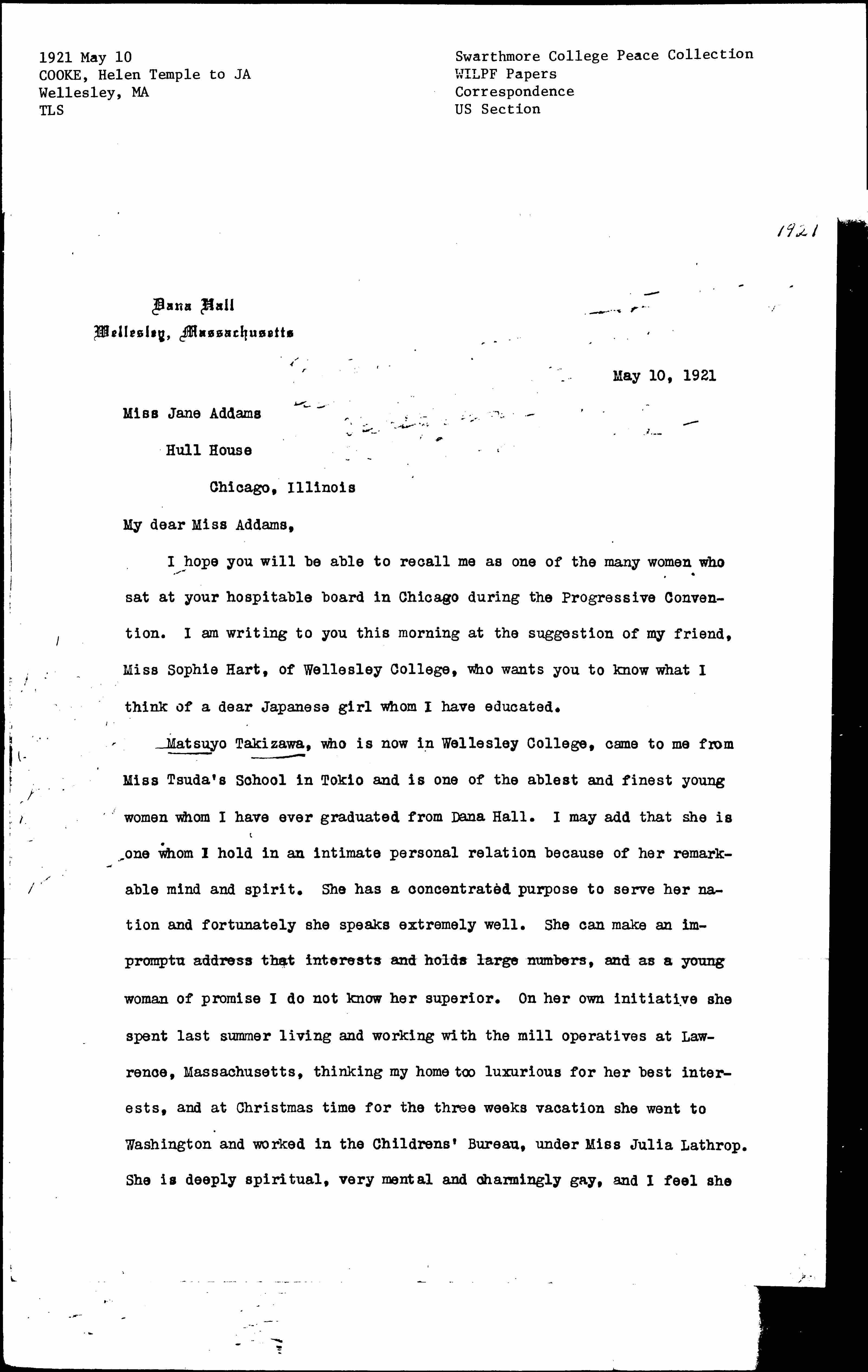 Matsuyo Takizawa, who is now in Wellesley College, came to me from Miss Tsuda's school in [Tokyo] and is one of the ablest and finest young women whom I have ever graduated from Dana Hall. I may add that she is one whom I hold in an intimate personal relation because of her remarkable mind and spirit. She has a concentrated purpose to serve her nation and fortunately she speaks extremely well. She can make an impromptu address that interests and holds large numbers, and as a young woman of promise I do not know her superior. On her own initiative she spent last summer living and working with the mill operatives at Lawrence, Massachusetts, thinking my home too luxurious for her best interests, and at Christmas time for the three weeks vacation she went to Washington and worked in the Children's Bureau, under Miss Julia Lathrop. She is deeply spiritual, very mental and charmingly gay, and I feel she [page 2] is already far on the way to a definite and prominent place in the sun of Japan. Miss Hart seems to want Matsuyo to go to the Congress at Vienna and I sincerely hope that any opportunity which will help her on her "high way" may open for her.