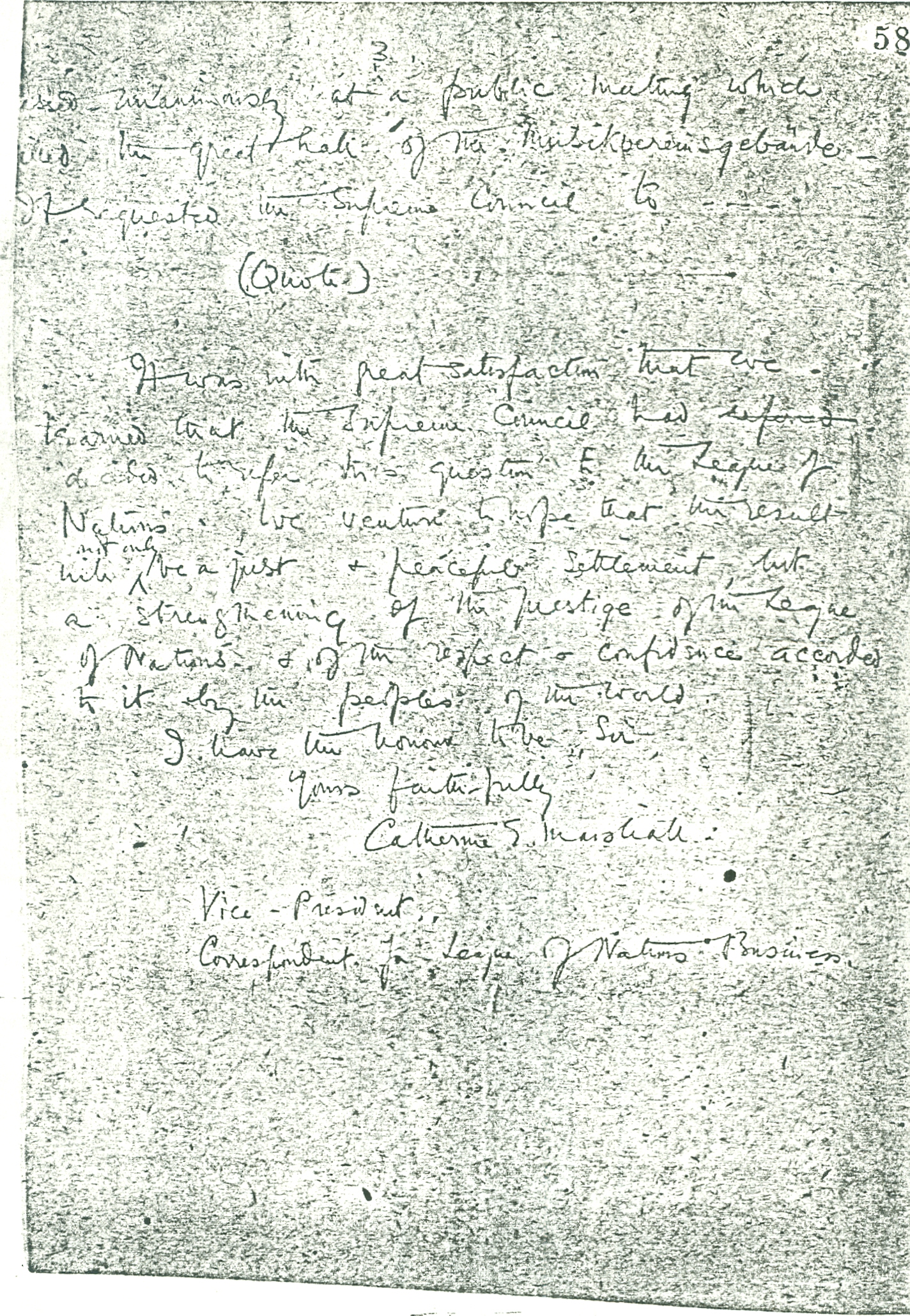 It was with great satisfaction that we learned that the Supreme Council had referred decided to refer this question to the League of Nations. We venture to hope that the result will ↑not only↓ be a just & peaceful settlement, but a strengthening of the prestige of the League of Nations, & of the respect & confidence accorded to it by the peoples of the world.