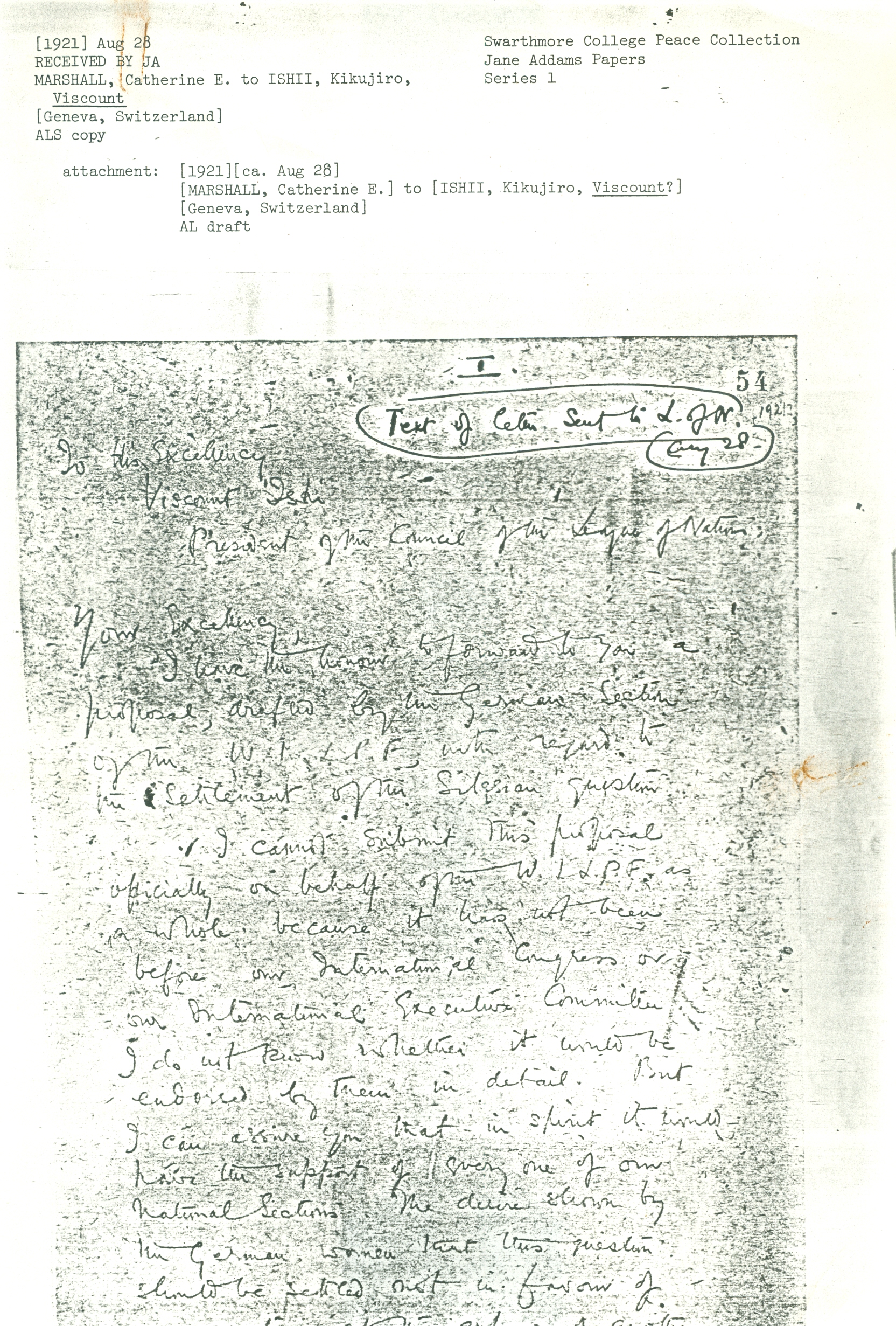 At the Int. Congress of the W.I.L.P.F. held in Vienna last July month a Resolution on the Silesian question was passed and telegraphed to the Supreme Council then sitting in Paris. The Resolution, brought forward on the joint initiative of the Polish & the German delegates present, was [page 3] [passed] unanimously at a public meeting which [packed?] the great hall of the Musikvereinsgebäude -- [&] requested the Supreme Council to ...