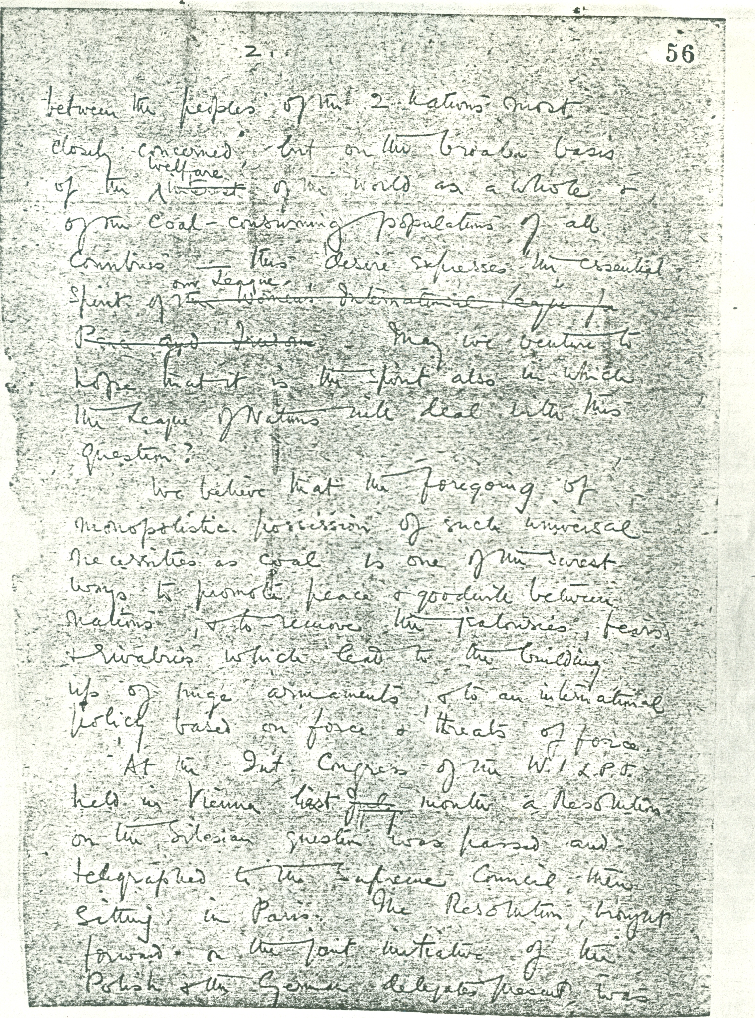 I cannot submit this proposal officially on behalf of the W.I.L.P.F. as a whole because it has not been before our International Congress or our International Executive Committee. I do not know whether it would be endorsed by them in detail. But I can assure you that in spirit it would have the support of every one of our National Sections. The desire shown by the German women that this question should be settled not in [favor] of one country at the expense of another [and even] solely on a basis of justice [page 2] between the peoples of the 2 nations most closely concerned, but on the broader basis of the ↑welfare↓ interest of the world as a whole & of the coal-consuming populations of all countries -- this desire expresses the essential spirit of the Women's International League for Peace and Freedom ↑our League.↓ May we venture to hope that it is the spirit also in which the League of Nations will deal with this question?