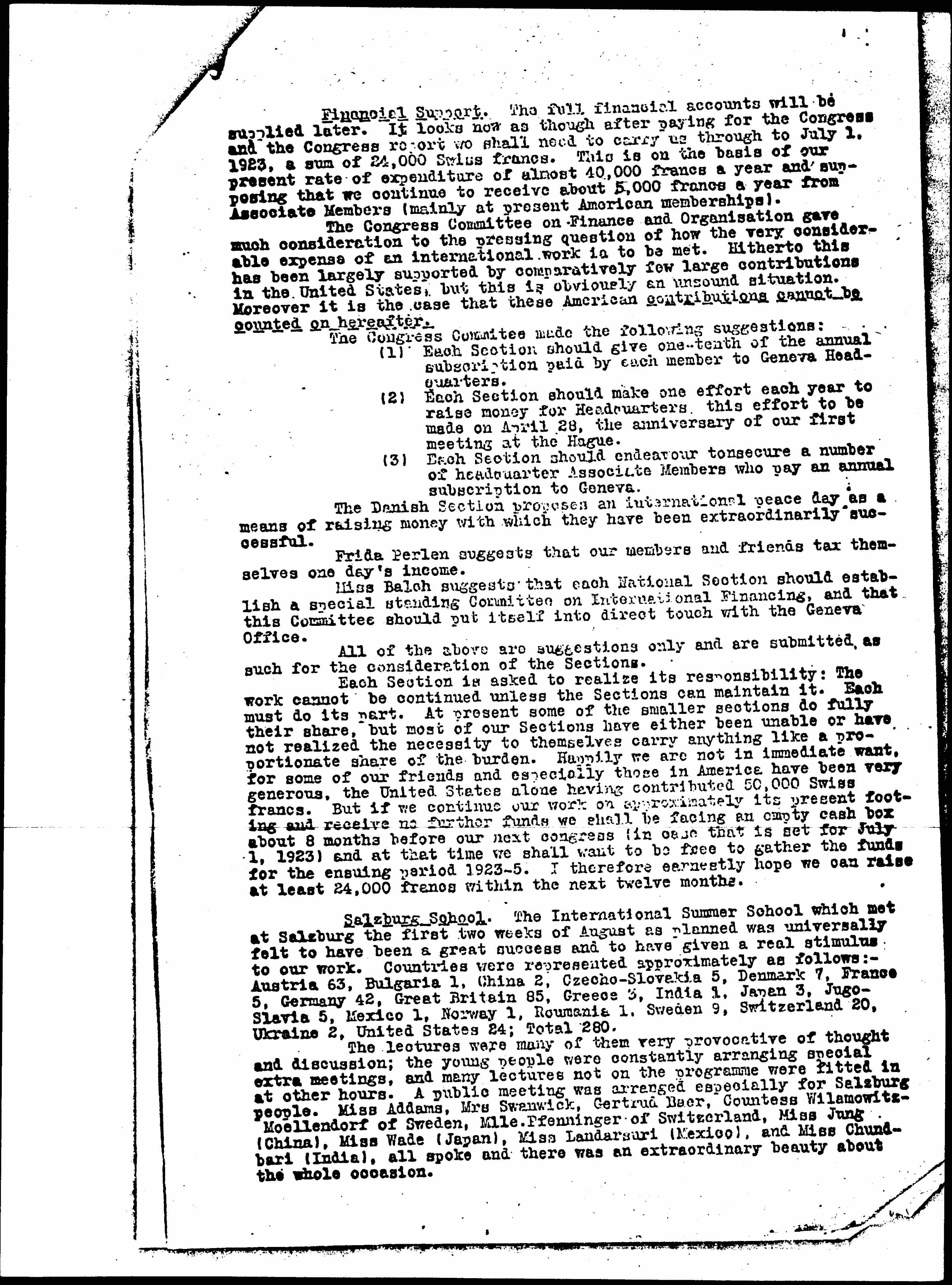 Each Section is asked to realize its responsibility. The work cannot be continued unless the Sections can maintain it. Each must do its part. At present some of the smaller sections do fully their share, but most of our Sections have either been unable or have not realized the necessity to themselves carry anything like a proportionate share of the burden. Happily we are not in immediate want, for some of our friends and especially those in America have been very generous, the United States alone having contributed 50,000 Swiss francs. But if we continue our work on approximately its present footing and receive no further funds we shall be facing an empty cash box about 8 months before our next congress (in case that is set for July 1, 1923) and at that time we shall want to be free to gather the funds for the ensuing period 1923-5. I therefore earnestly hope we can raise at least 24,000 francs within the next twelve months.