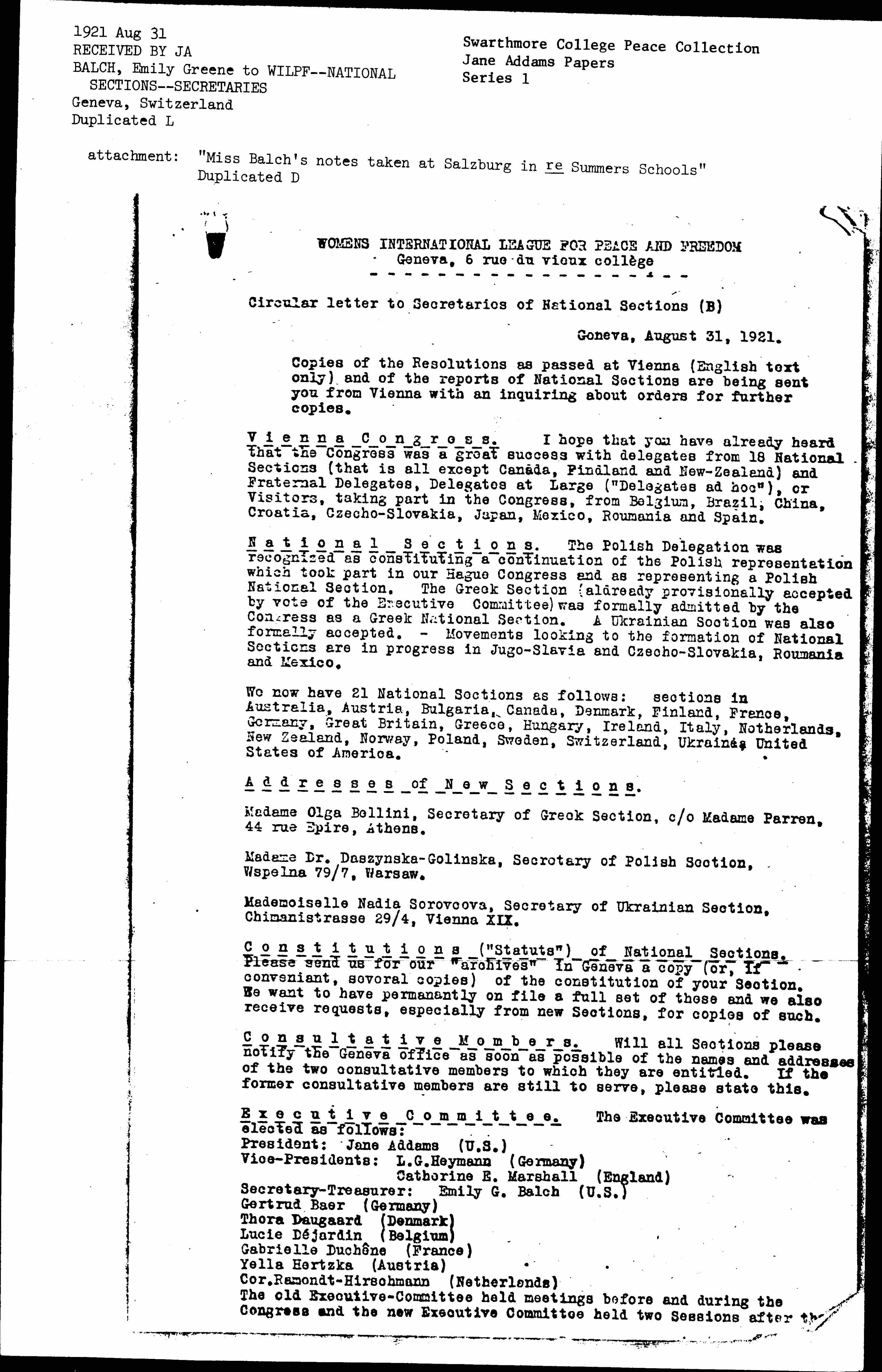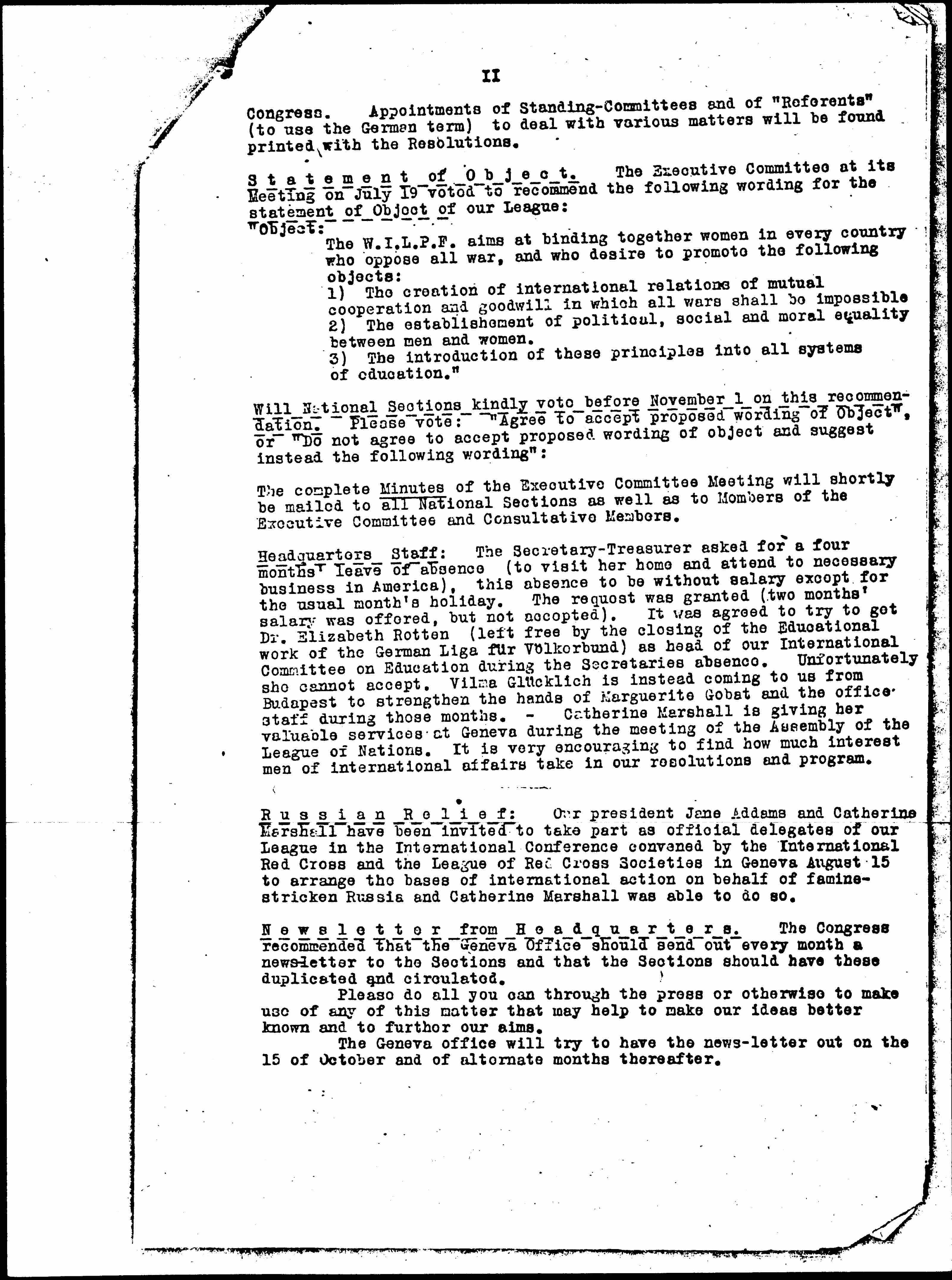 Headquarters Staff: The Secretary-Treasurer asked for a four months' leave of absence (to visit her home and attend to necessary business in America), this absence to be without salary except for the usual month's holiday. The request was granted (two months' salary was offered, but not accepted). It was agreed to try to get Dr. [Elisabeth] Rotten (left free by the closing of the Educational work of the German Liga für Völkerbund) as head of our International Committee on Education during the Secretaries absence. Unfortunately she cannot accept. Vilma Glücklich is instead coming to us from Budapest to strengthen the hands of Marguerite Gobat and the office staff during those months. -- Catherine Marshall is giving her valuable services at Geneva during the meeting of the Assembly of the League of Nations. It is very encouraging to find how much interest men of international affairs take in our resolutions and program.