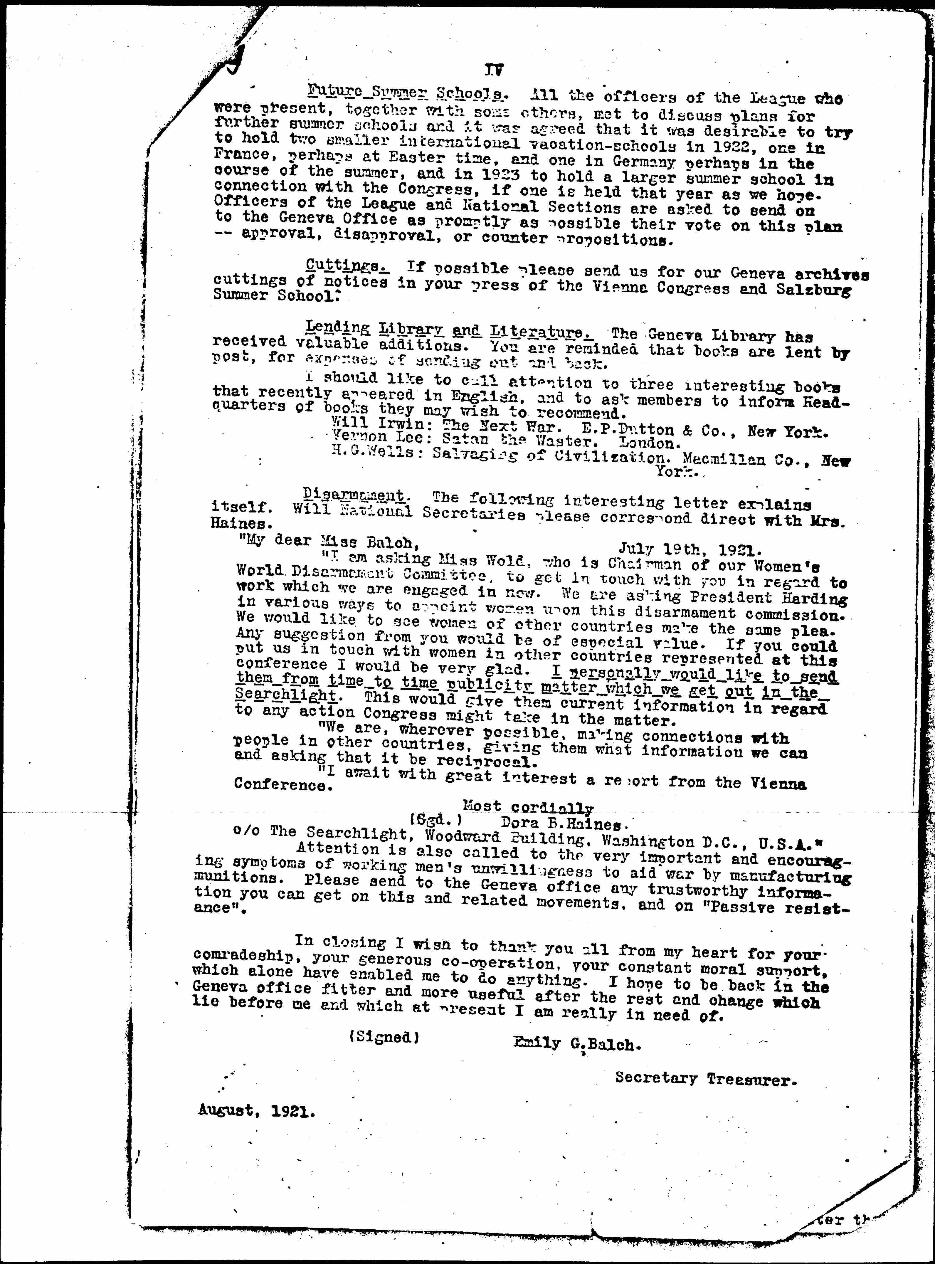 "I am asking Miss Wold, who is Chairman of our Women's World Disarmament Committee, to get in touch with you in regard to work which we are engaged in now. We are asking President Harding in various ways to appoint women upon this disarmament commission. We would like to see women of other countries make the same plea. Any suggestion from you would be of especial value. If you could put us in touch with women in other countries represented at this conference I would be very glad. I personally would like to send them from time to time publicity matter which we get out in the Searchlight. This would give them current information in regard to any action Congress might take in the matter.