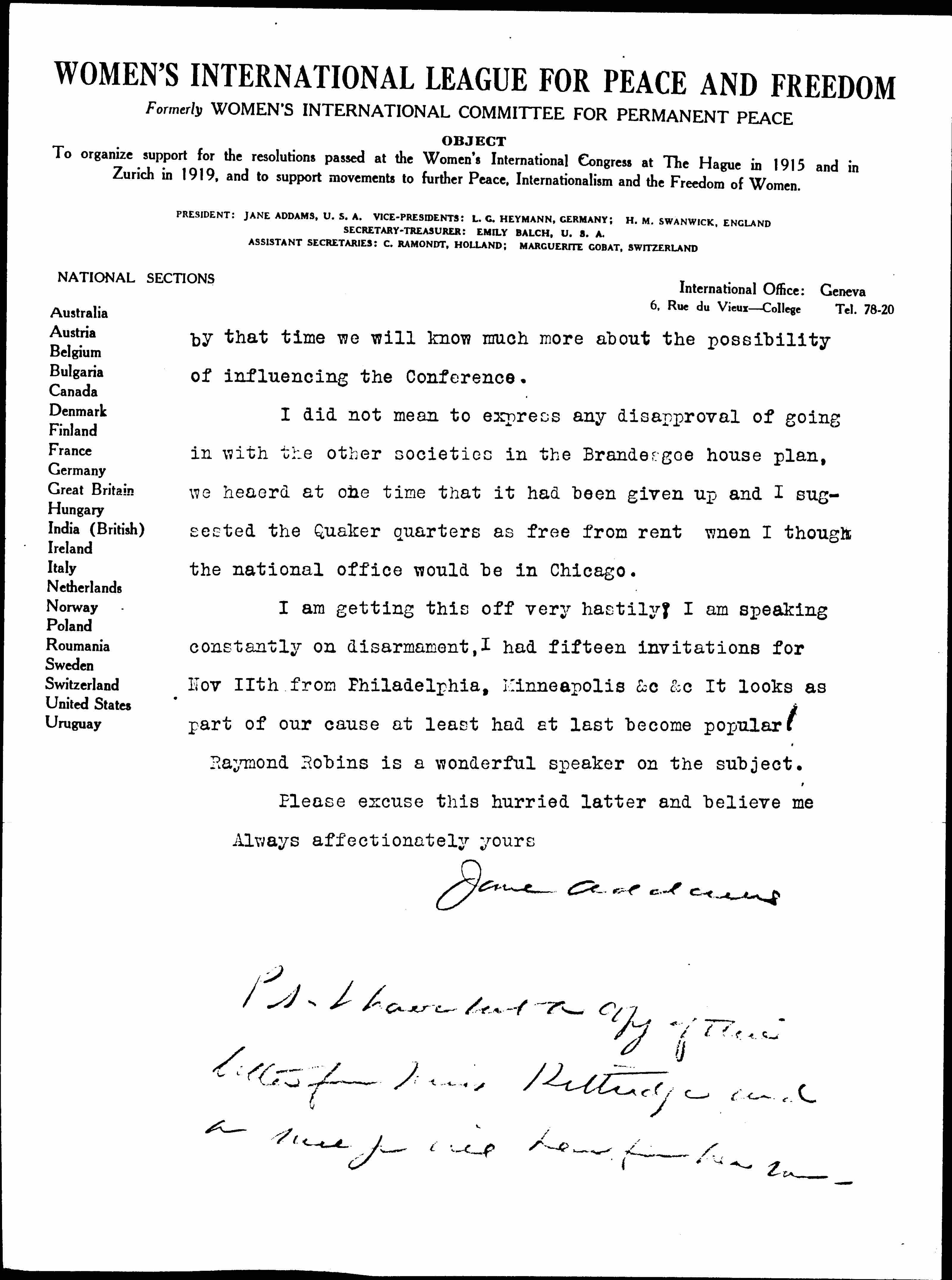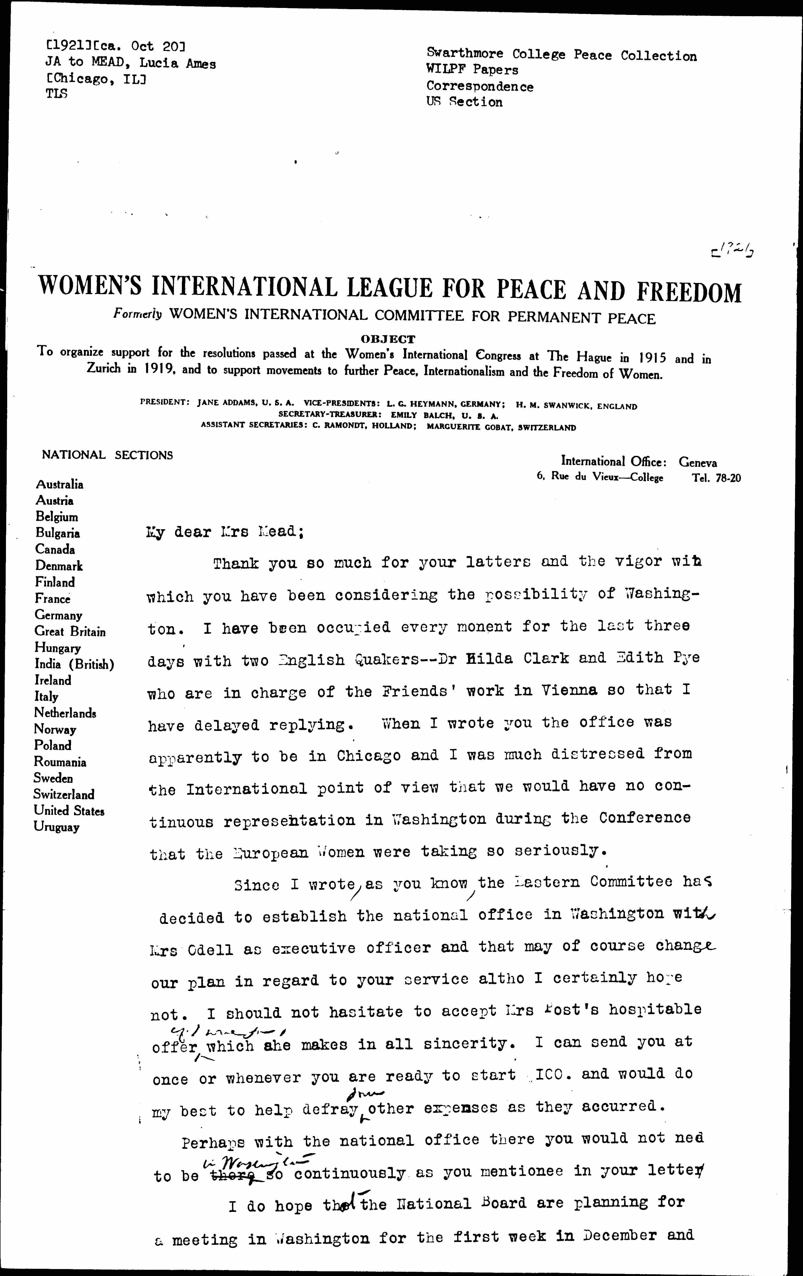 Thank you so much for your letters and the vigor with which you have been considering the possibility of Washington. I have been occupied every moment for the last three days with two English Quakers -- Dr Hilda Clark and Edith Pye who are in charge of the Friends' work in Vienna so that I have delayed replying. When I wrote you the office was apparently to be in Chicago and I was much distressed from the International point of view that we would have no continuous representation in Washington during the Conference that the European Women were taking so seriously.