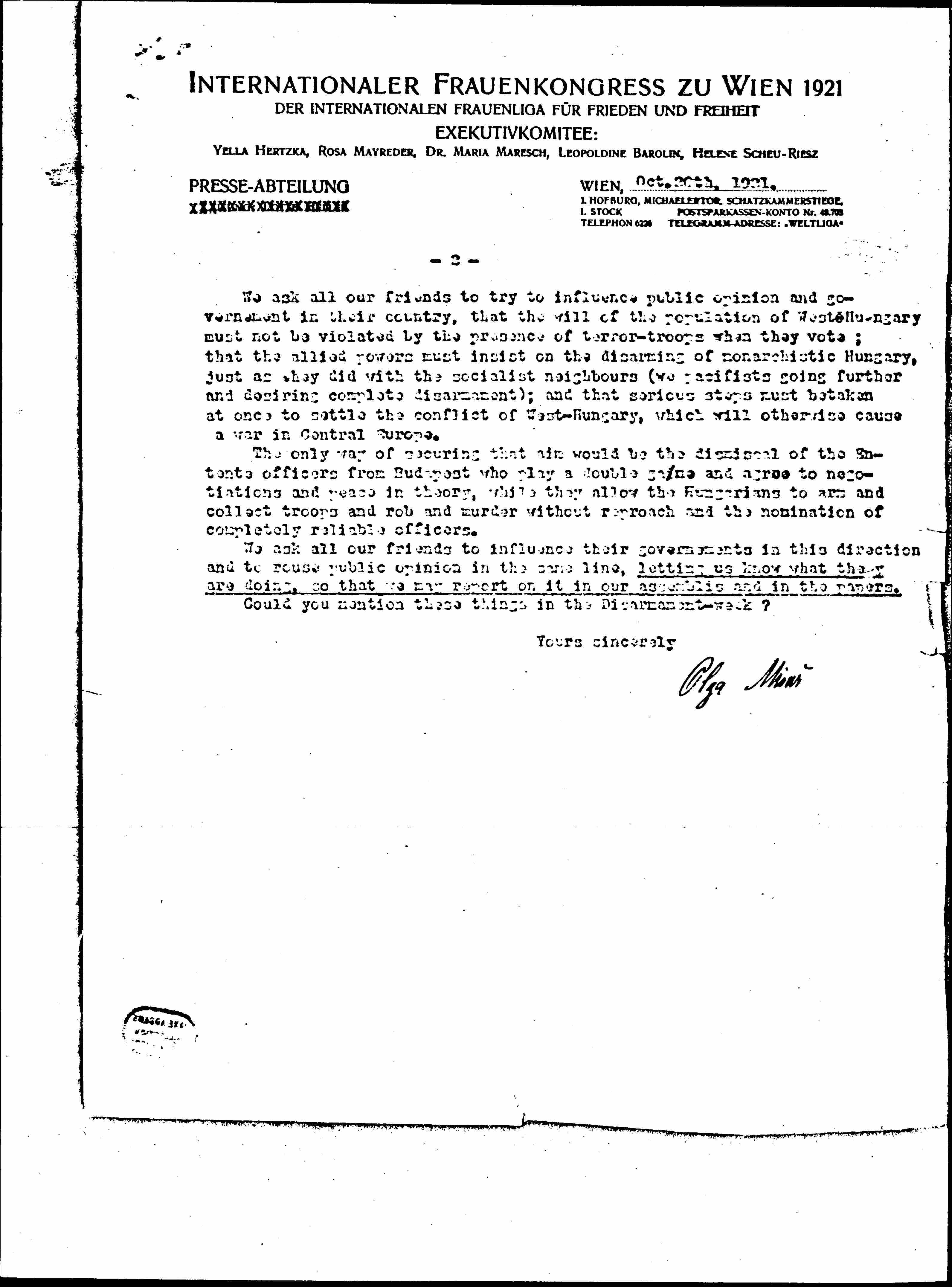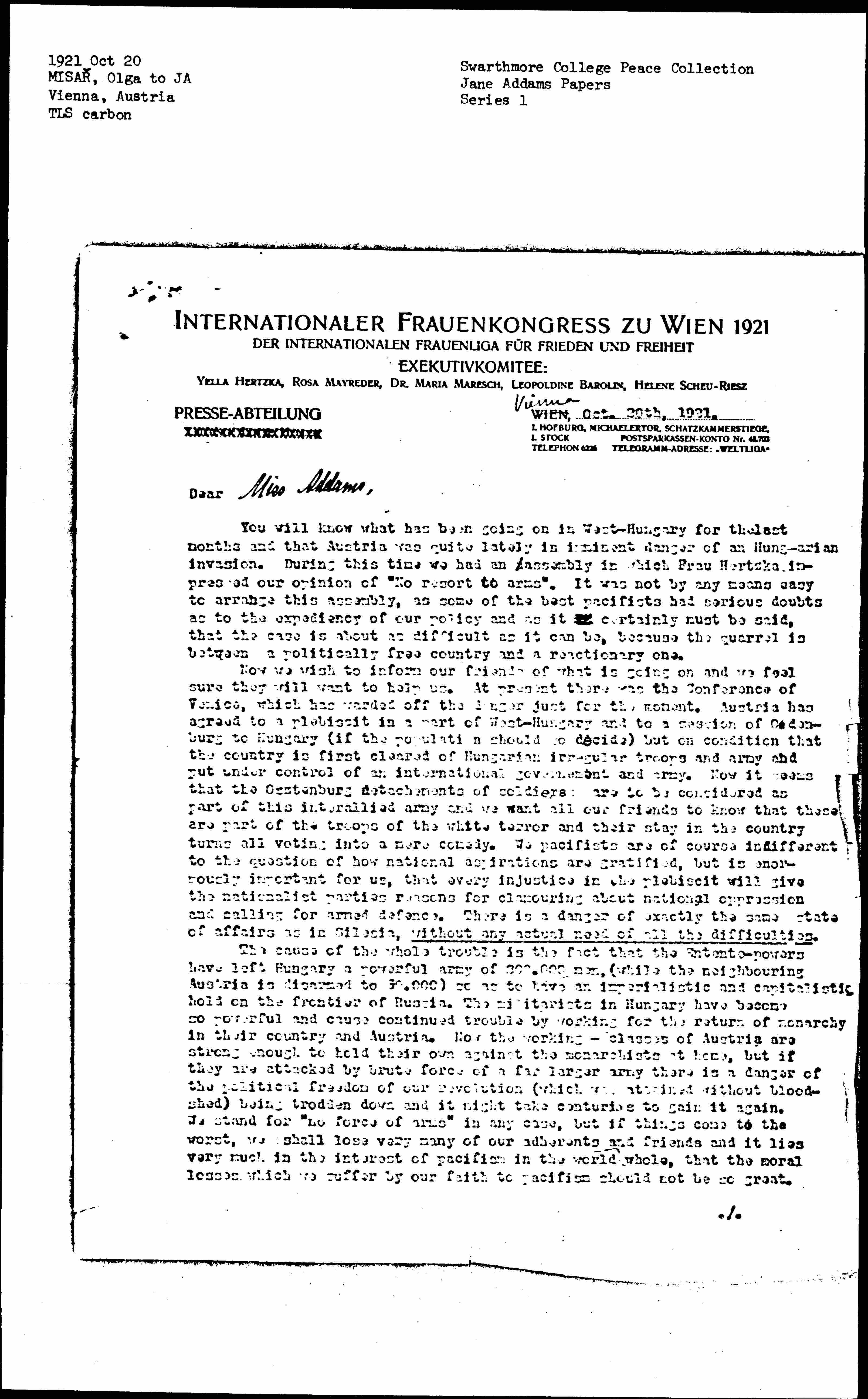 Now we wish to inform our friends of what is going on and we feel sure they will want to help us. At present there was the Conference of Venice, which has warded off the [danger] just for the moment. Austria has agreed to a [plebiscite] in a part of West-Hungary and to a session of Oedonburg to Hungary (if the population should so decide) but on condition that the country is first cleared of Hungarian irregular troops and army and put under control of an international government and army. Now it seems that the [Oostenburg?] detachments of soldiers: are to be considered as part of this [inter-allied] army and we want all our friends to know that these are part of the troops of the white terror and their stay in the country turns all voting into a mere comedy. We pacifists are of course indifferent to the question of how national aspirations are gratified, but is enormously important for us, that every injustice in the [plebiscite] will give the nationalist parties reasons for [clamoring] about national oppression and calling for armed [defense]. There is a danger of exactly the same state of affairs as in Silesia, without any actual need of all difficulties.