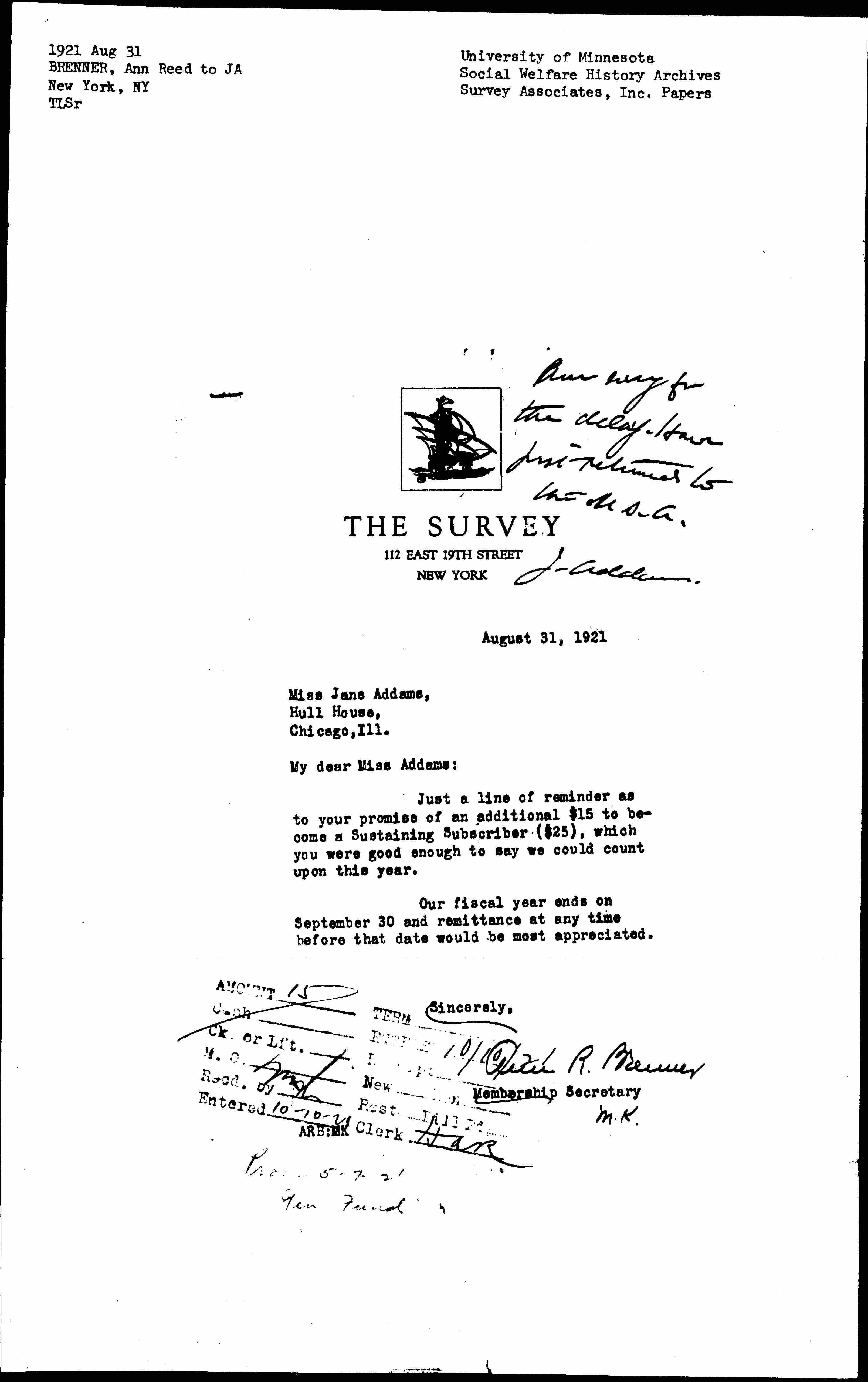 Just a line of reminder as to your promise of an additional $15 to become a Sustaining Subscriber ($25), which you were good enough to say we could count upon this year.