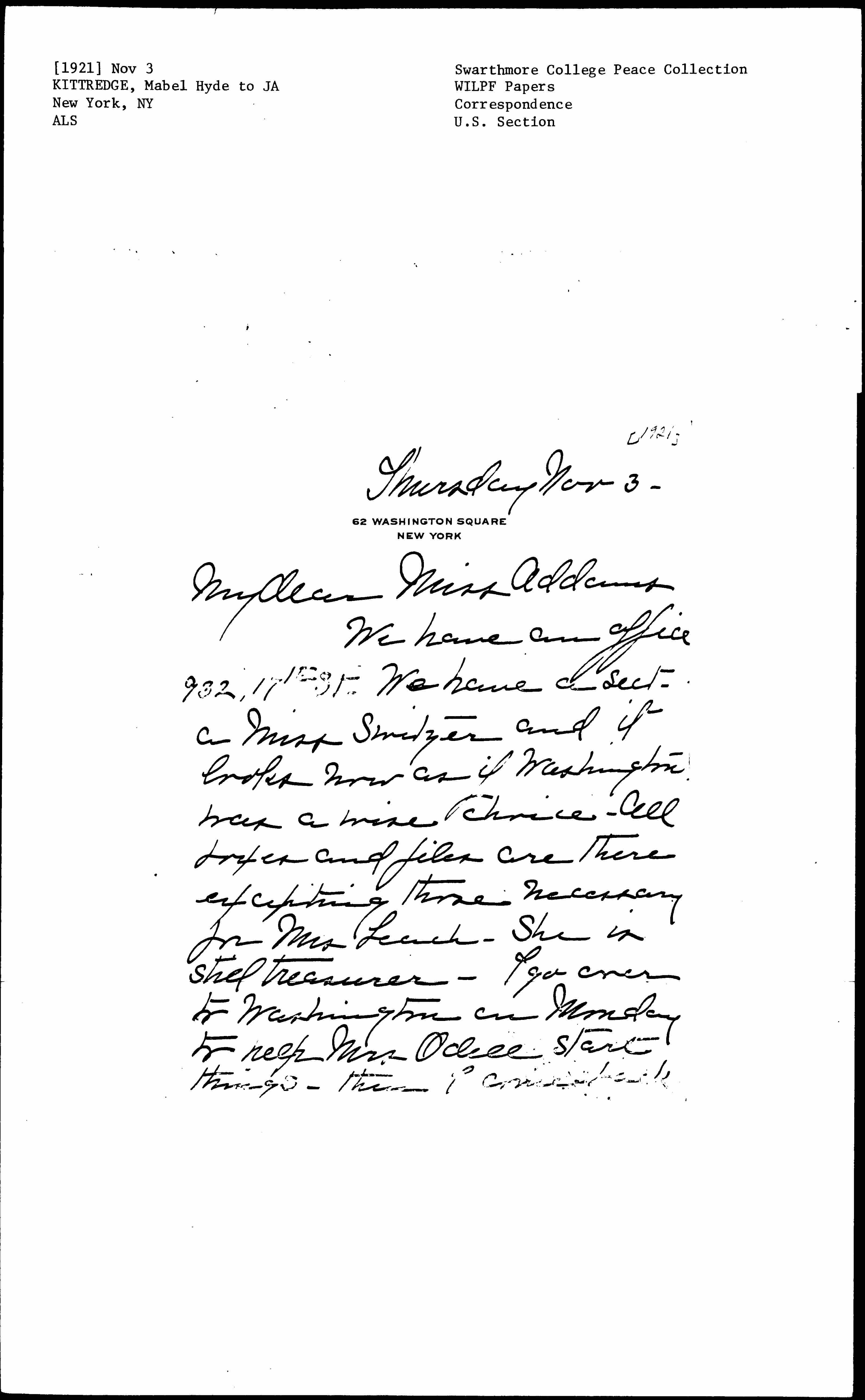 We have an office 932, 17th St. We have a sect. a Miss Switzer and it looks now as if Washington was a wise choice. All boxes and files are there excepting those necessary for Mrs Leach. She is still treasurer. I go over to Washington on Monday to help Mrs Odell start things -- then of course back [page 2] here Monday night with all W.I.L. responsibility gone. I think I'll miss it for a while.