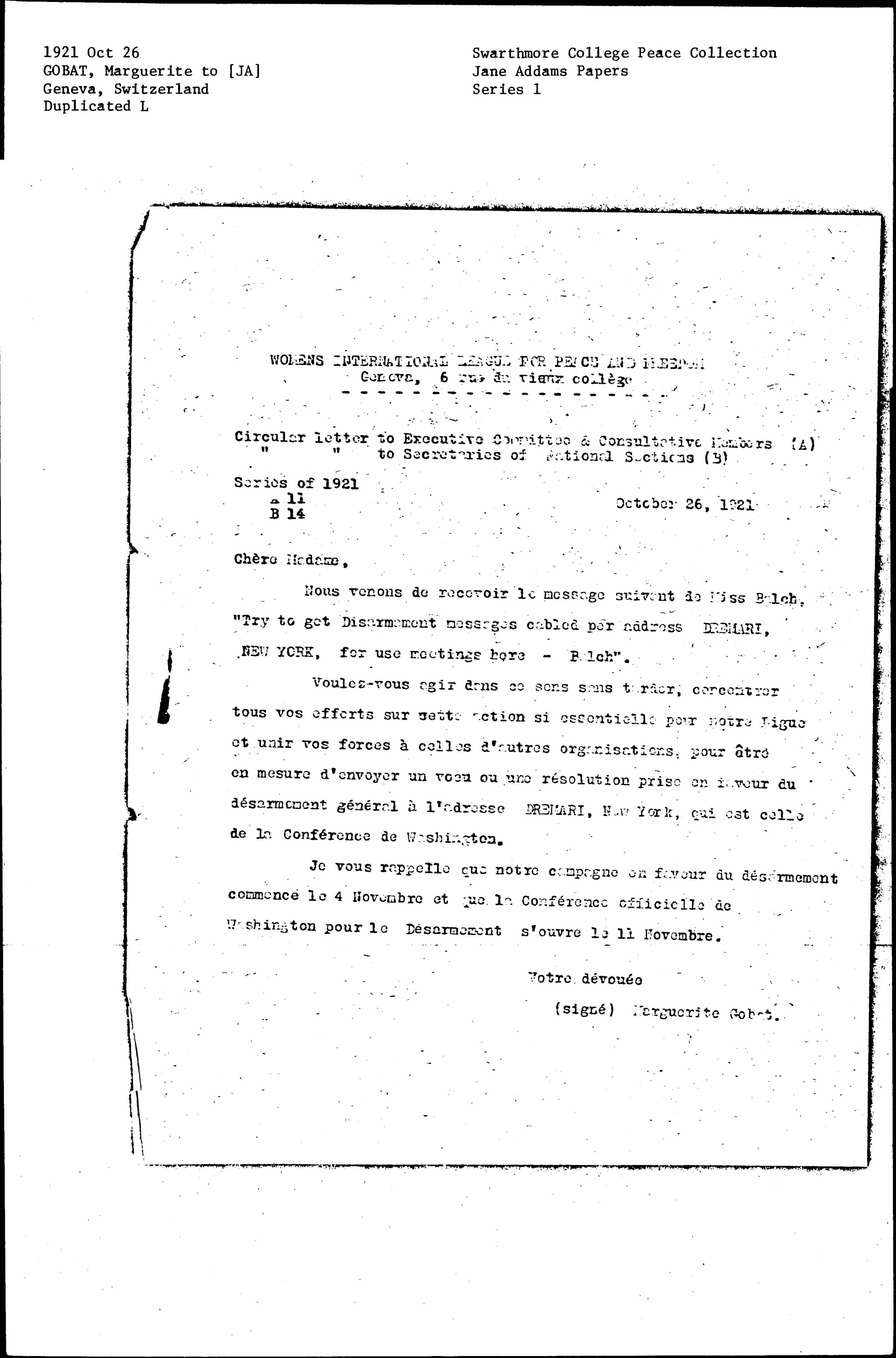 We just received the following message from Miss Balch, “Try to get Disarmament messages cabled per address [DREMARI], NEW YORK, for use meetings here - Balch”.