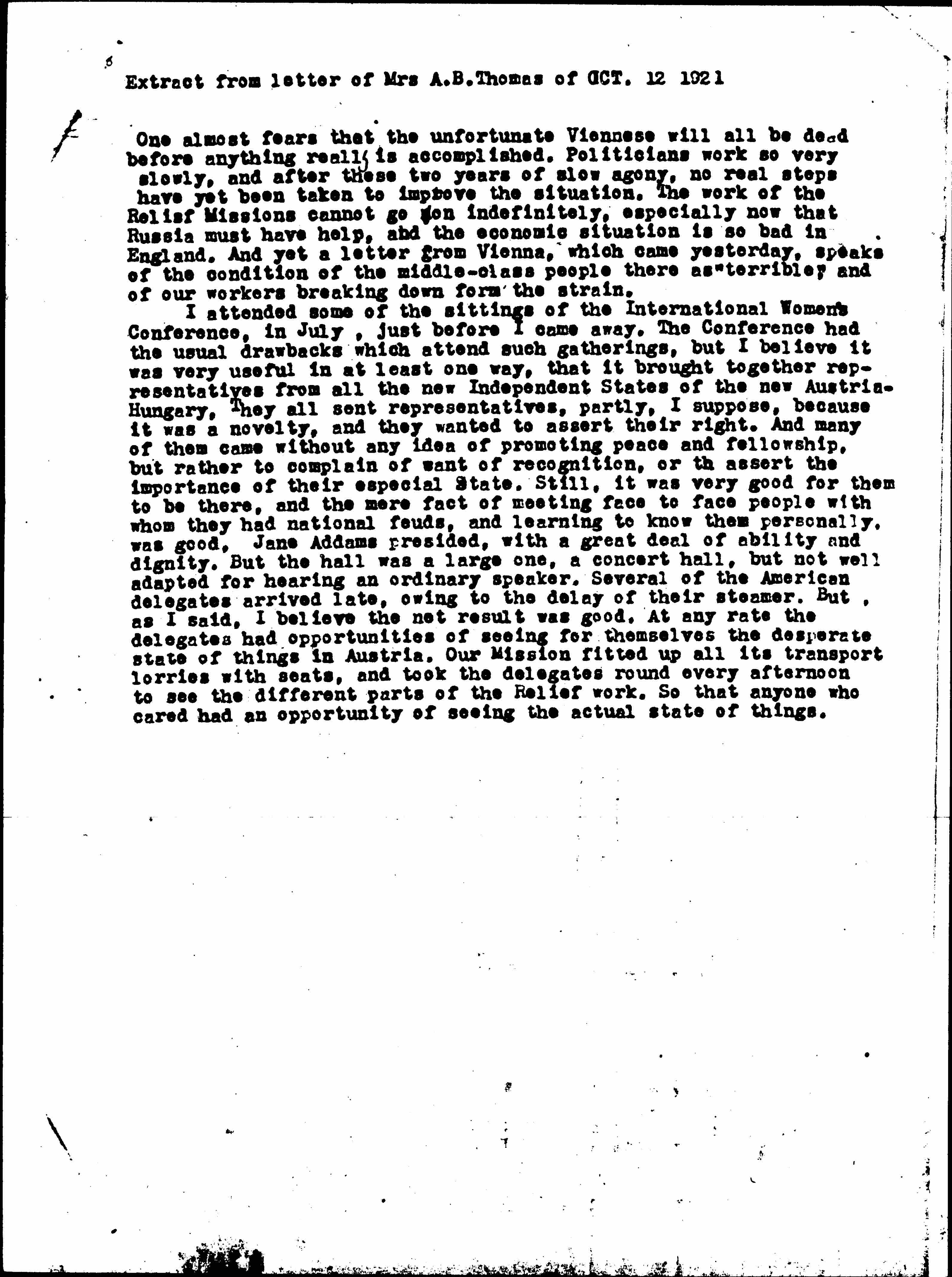 I attended some of the sittings of the International Women's Conference, in July, just before I came away. The Conference had the usual drawbacks which attend such gatherings, but I believe it was very useful in at least one way, that it brought together representatives from all the new Independent States of the new Austria-Hungary. They all sent representatives, partly, I suppose, because it was a novelty, and they wanted to assert their right. And many of them came without any idea of promoting peace and fellowship, but rather to complain of want of recognition, or [to] assert the importance of their especial State. Still, it was very good for them to be there, and the mere fact of meeting face to face people with whom they had national feuds, and learning to know them personally, was good. Jane Addams presided, with a great deal of ability and dignity. But the hall was a large one, a concert hall, but not well adapted for hearing an ordinary speaker. Several of the American delegates arrived late, owing to the delay of their steamer. But, as I said, I believe the net result was good. At any rate the delegates had opportunities of seeing for themselves the desperate state of things in Austria. Our Mission fitted up all its transport lorries with seats, and took the delegates round every afternoon to see the different parts of the Relief work. So that anyone who cared had an opportunity of seeing the actual state of things.