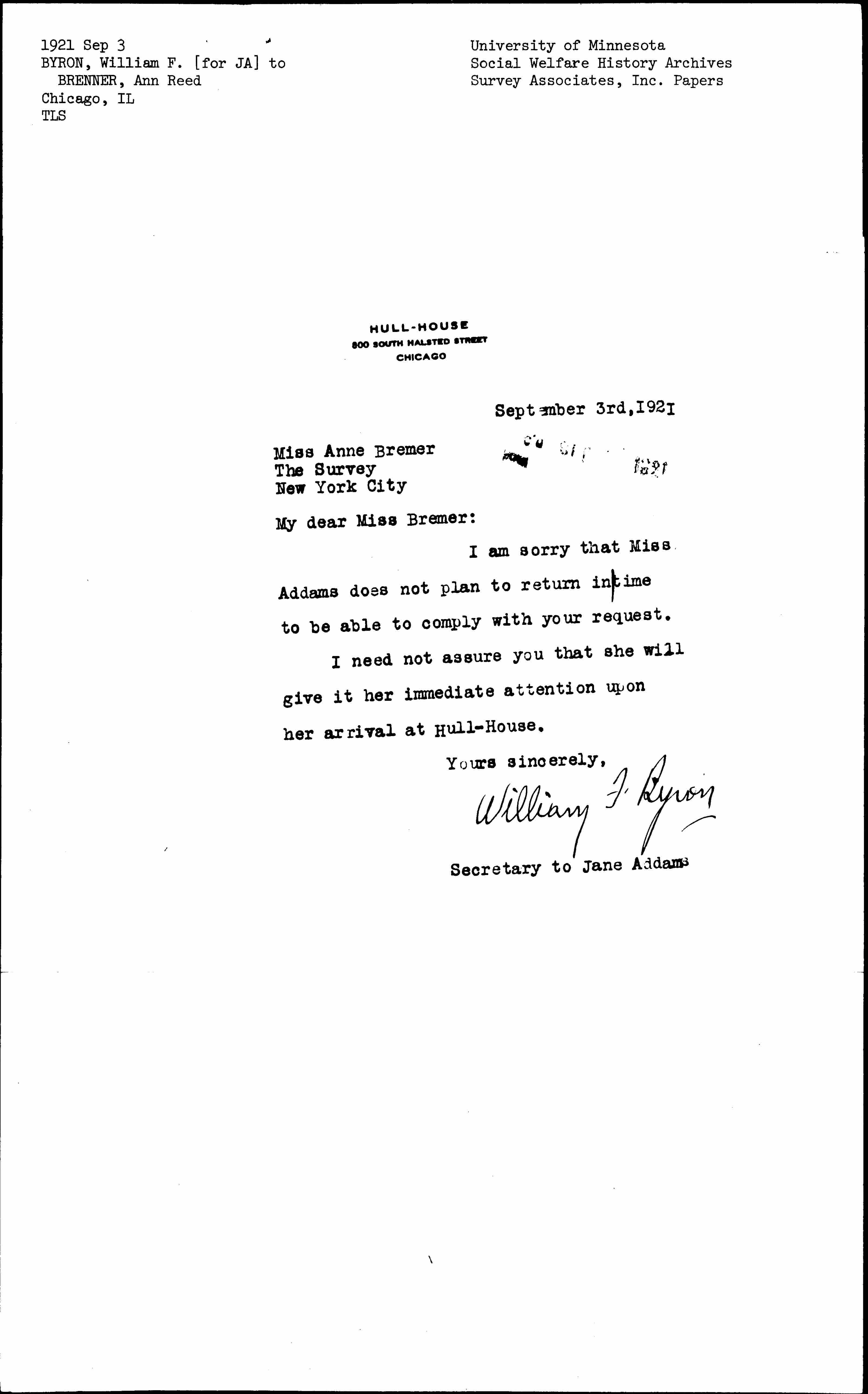I am sorry that Miss Addams does not plan to return in time to able to comply with your request.