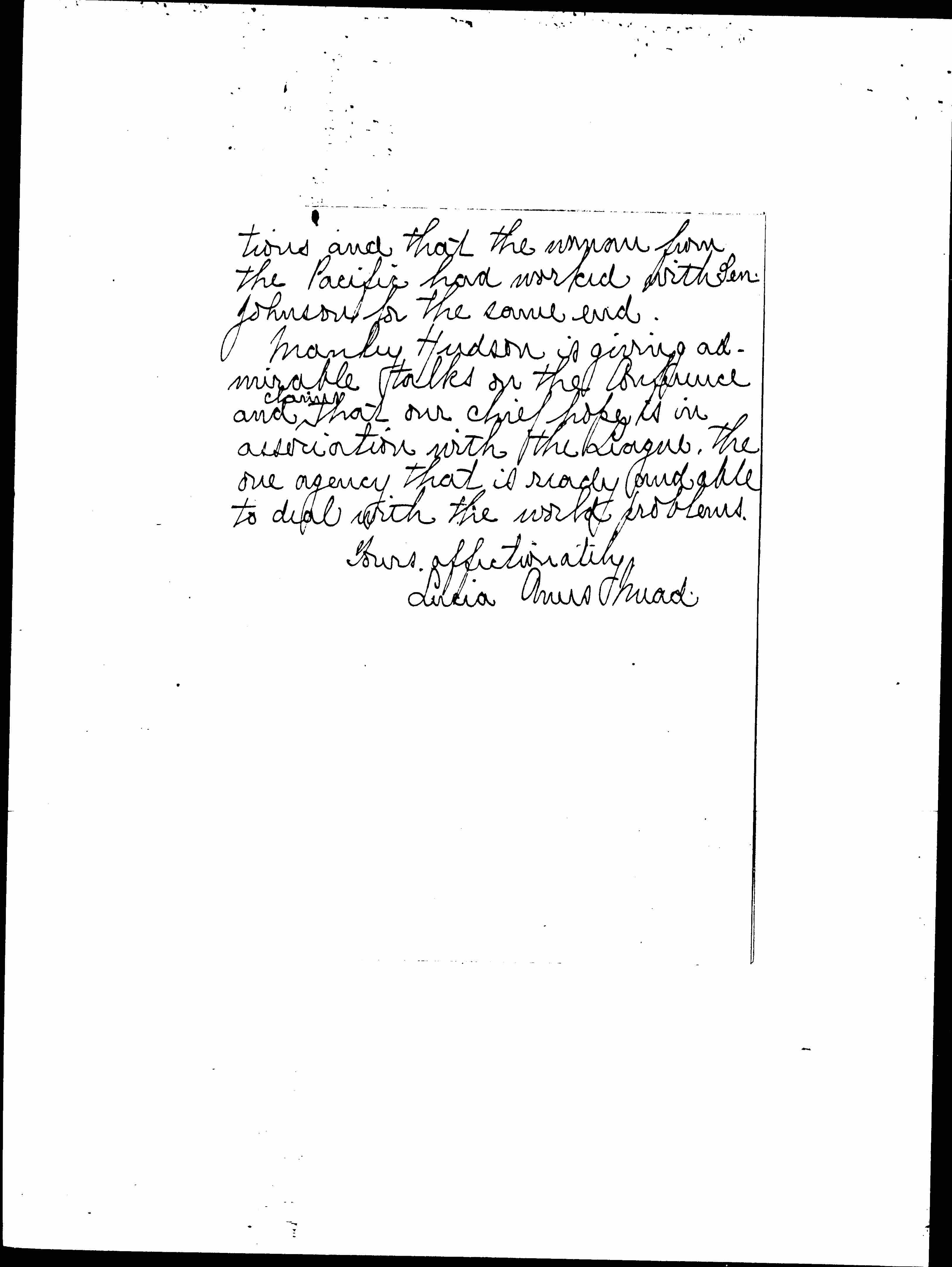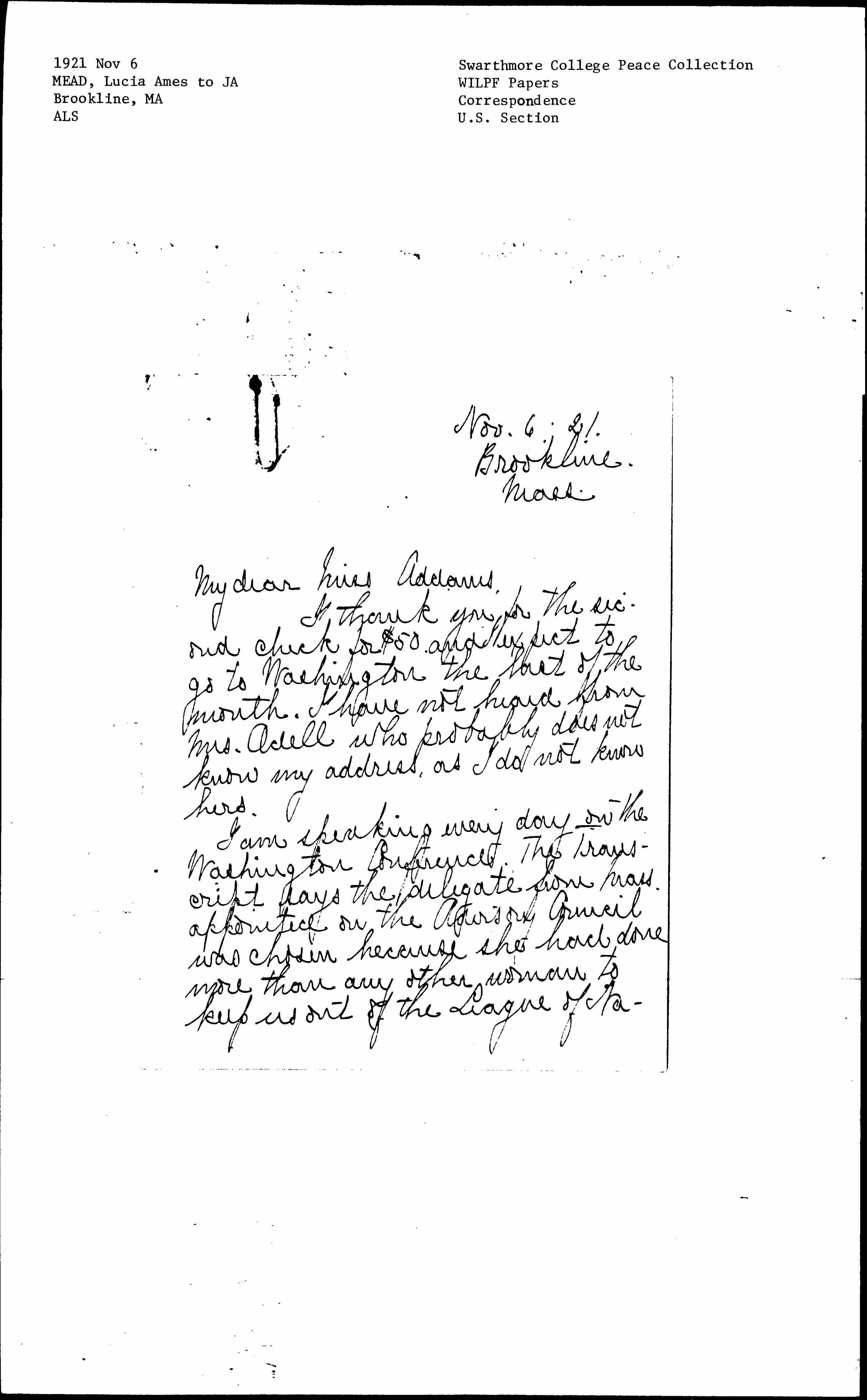 I am speaking every day on the Washington Conference. The Transcript says the delegate from Mass. appointed on the Advisory Council was chosen because she had done more than any other woman to keep us out of the League of Nations [page 2] and that the woman from the Pacific had worked with Sen. Johnson for the same end.