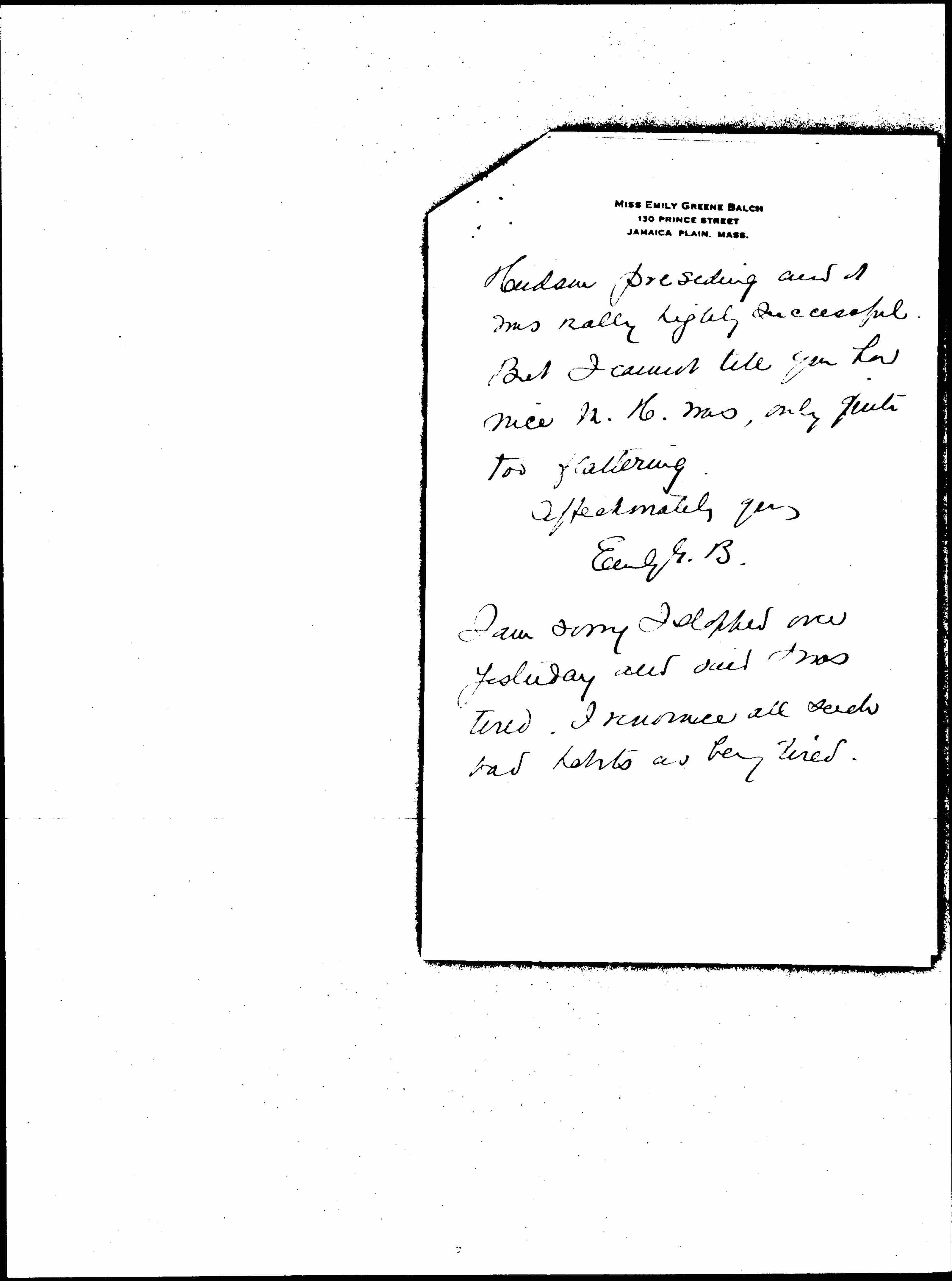 Helen Cheever and I are arranging a big (we hope) parlor meeting for Dr. [Clark] & Miss Pye. I [spoke] here last week at a dinner with Manley [page 3] Hudson presenting and it was really highly successful. But I cannot tell you how nice M. H. was, only quite too flattering.
