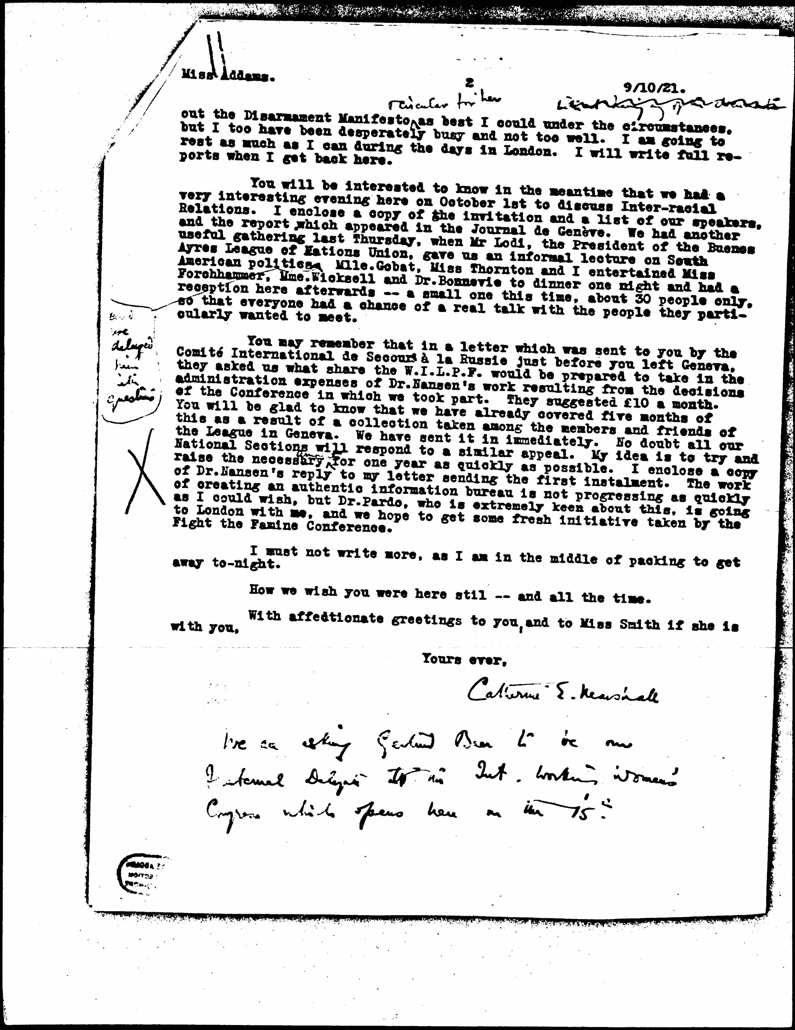 I have just decided, for a mixture of family and other reasons, to go to London [tonight] for a week. This will enable me to attend the International Conference of the Fight the Famine Council, which I will do officially on behalf of our International Headquarters. I shall see my parents, my doctor, and my dentist, and collect some winter clothes, and return here to help Mlle. Gobat until Velma Glücklich or some one else can come and join her. She obviously cannot be left with the whole work of the office on her shoulders. She went to Berne last Sunday for the Swiss National Women’s Congress, knocked up and had to stay away till Friday. I got [page 2] out the Disarmament Manifesto ↑& circular for her↓ as best I could under the circumstances, ↑without having my office [illegible]↓ but I too have been desperately busy and not too well. I am going to rest as much as I can during the days in London. I will write full reports when I get back here.