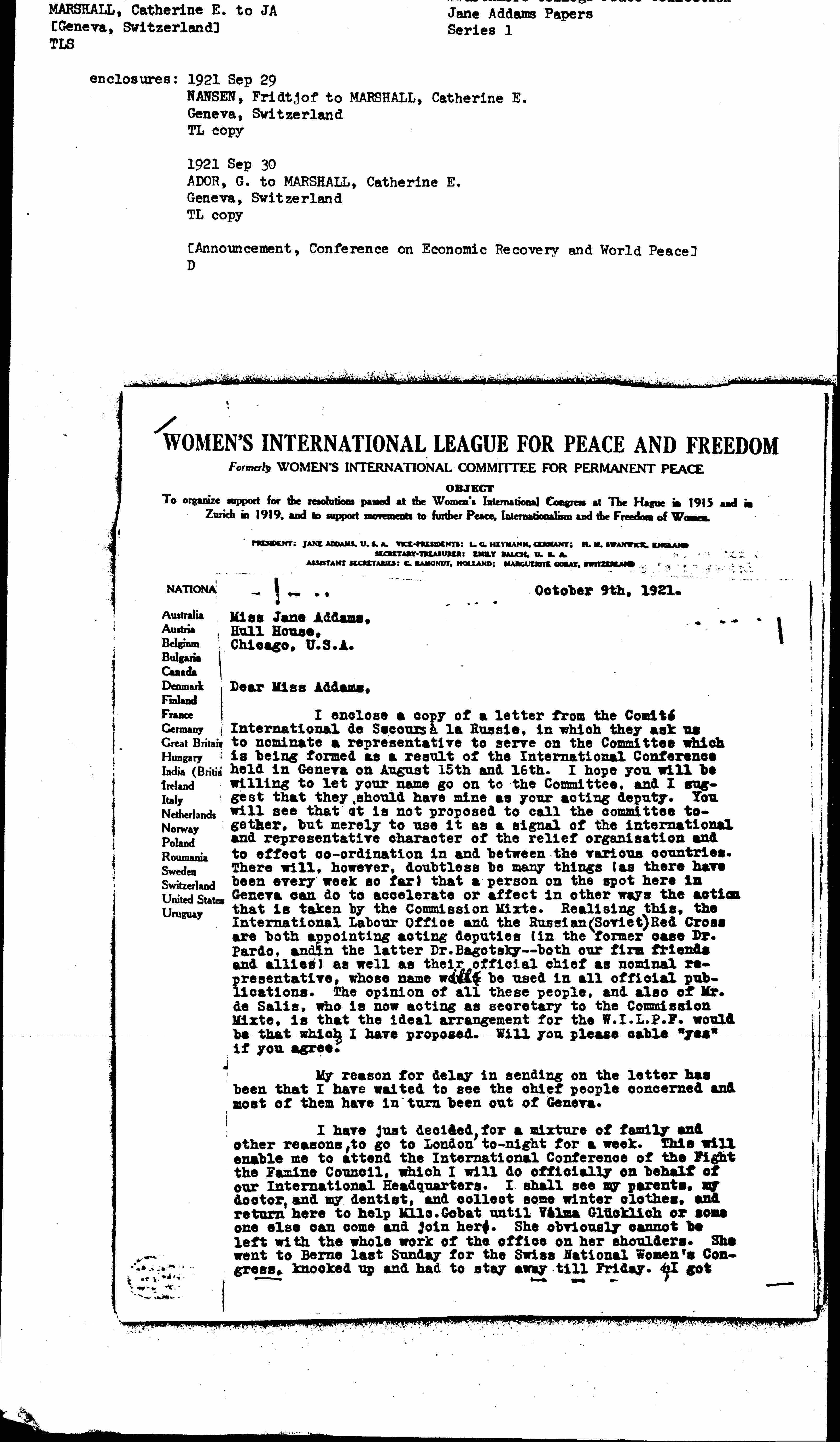 I enclose a copy of a letter from the Comité International de Secours à la Russie, in which they ask us to nominate a representative to serve on the Committee which is being formed as a result of the International Conference held in Geneva on August 15th and 16th. I hope you will be willing to let your name go on to the Committee, and I suggest that they should have mine as your acting deputy. You will see that it is not proposed to call the committee together, but merely to use it as a signal of the international and representative character of the relief [organization] and to effect [coordination] in and between the various countries. There will, however, doubtless be many things (as there have been every week so far) that a person on the spot here in Geneva can do to accelerate or affect in other ways the action that is taken by the Commission Mixte. [Realizing] this, the International Labour Office and the Russian (Soviet) Red Cross are both appointing acting deputies (in the former case Dr. Pardo, and in the latter Dr. Bagotsky -- both our firm friends and allies) as well as their official chief as nominal representative, whose name [will] be used in all official publications. The opinion of all these people, and also of Mr. De Salis, who is now acting as secretary to the Commission Mixte, is that the ideal arrangement for the W.I.L.P.F. would be that which I have proposed. Will you please cable "yes" if you agree.