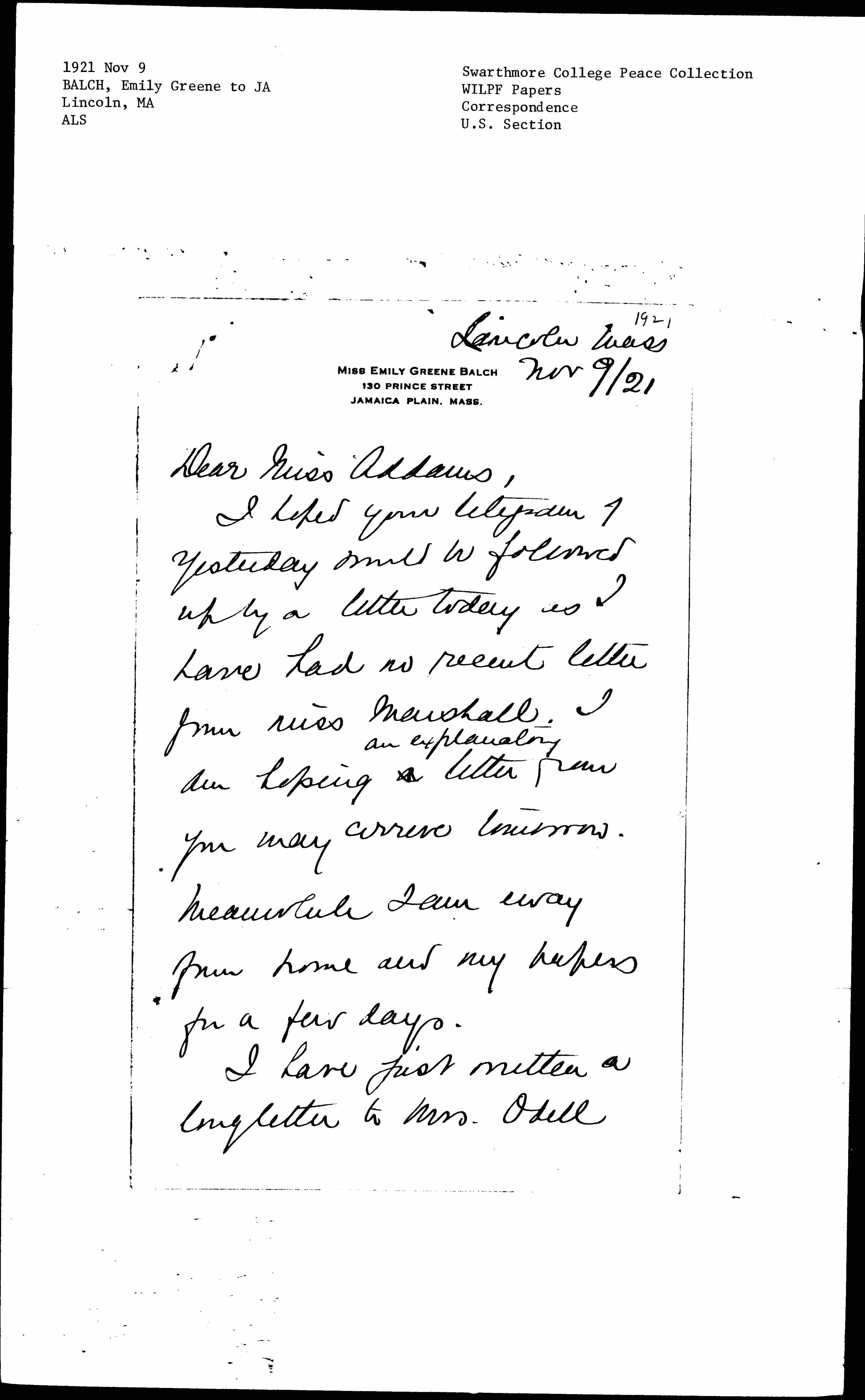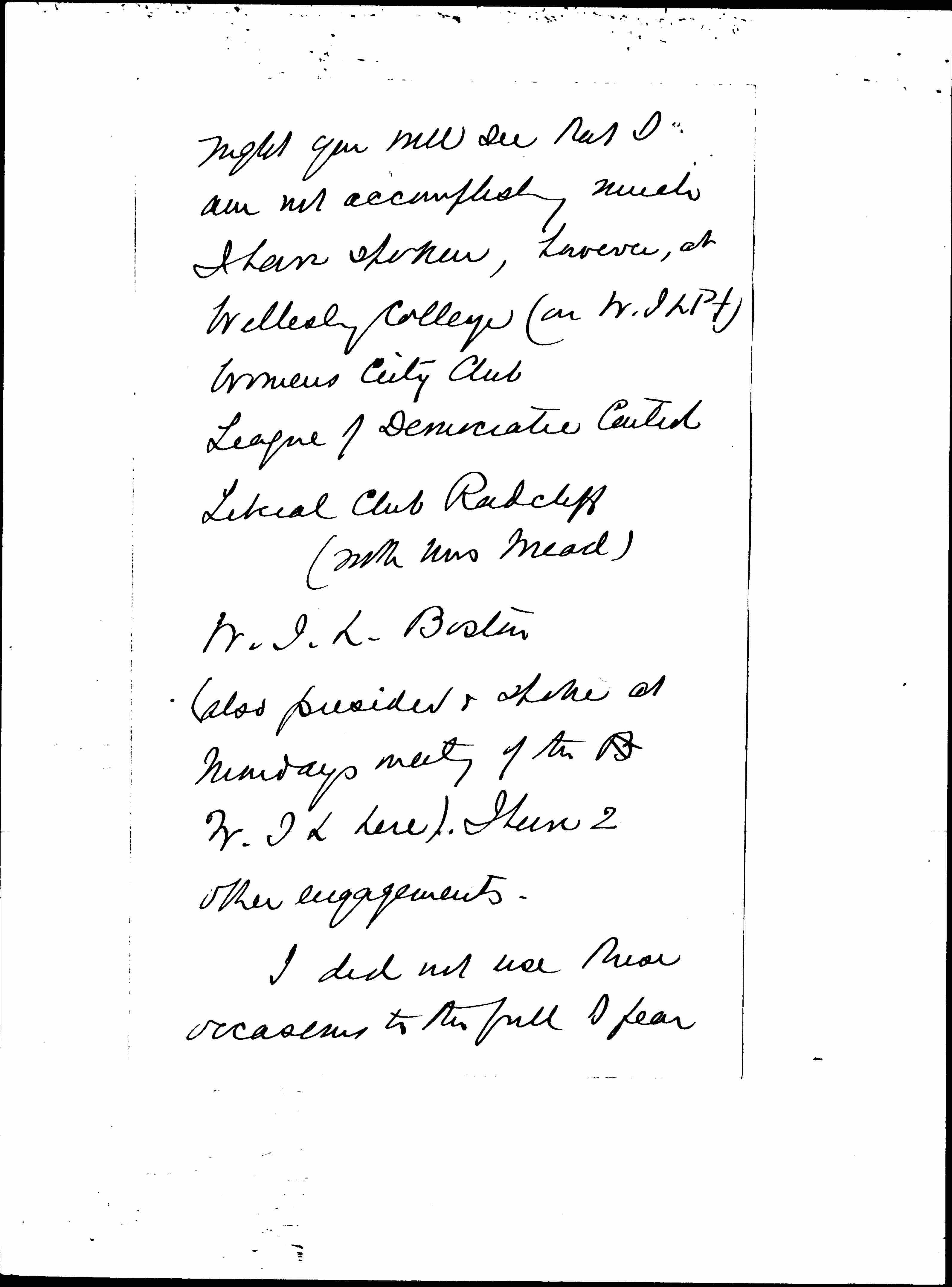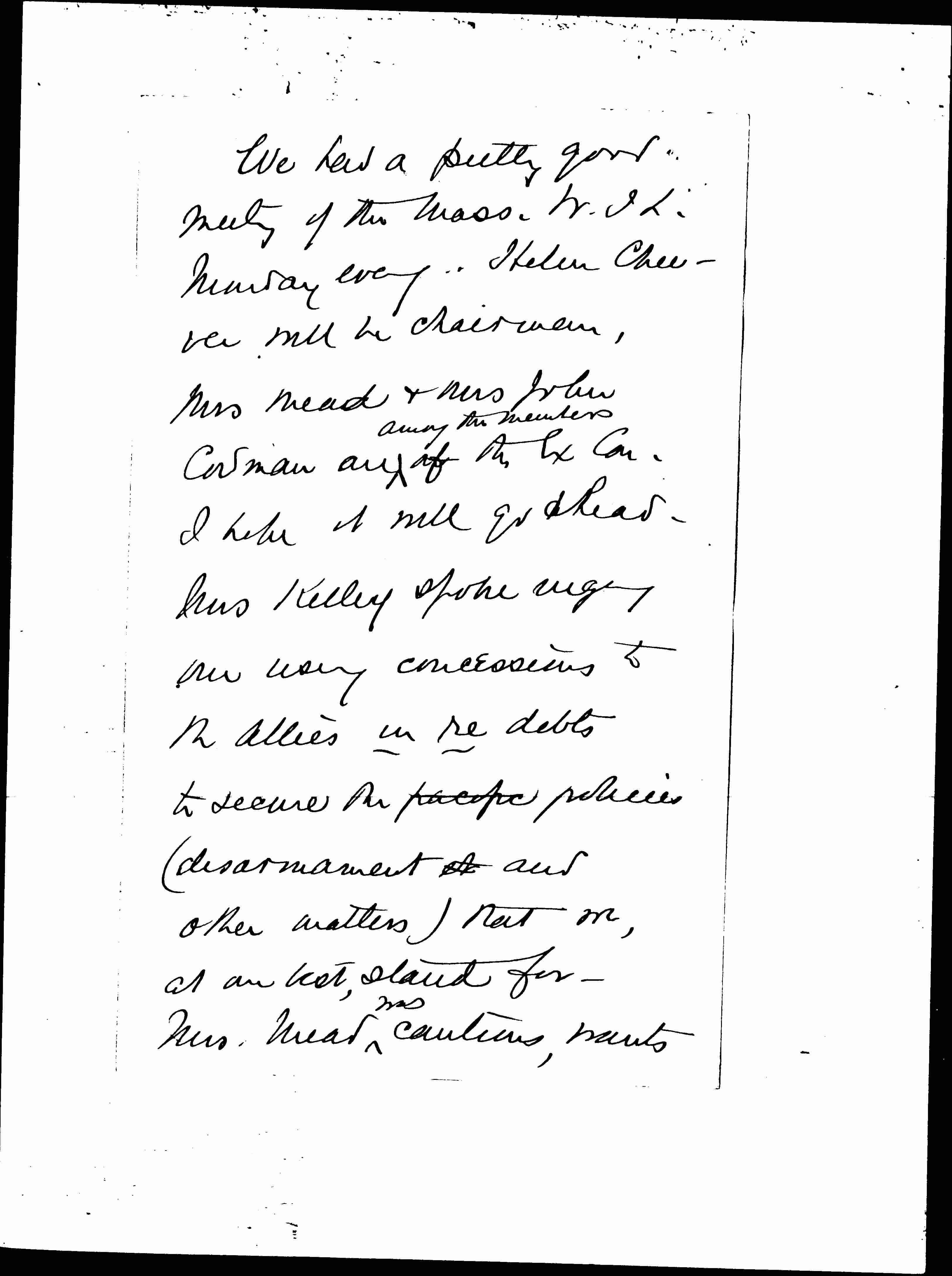 We had a pretty good meeting of the Mass. W. I. L. Monday [evening]. Helen Cheever will be chairman, Mrs Mead & Mrs John Codman are ↑among the members↓ of the Ex Com. I hope it will go ahead. Mrs Kelley spoke [illegible] our using concessions to the Allies in [re] debts to secure the [illegible] policies (disarmament at and other matters) that we, at our best, stand for. Mrs Mead ↑was↓ cautious, wants [page 5] to get more advice, etc.