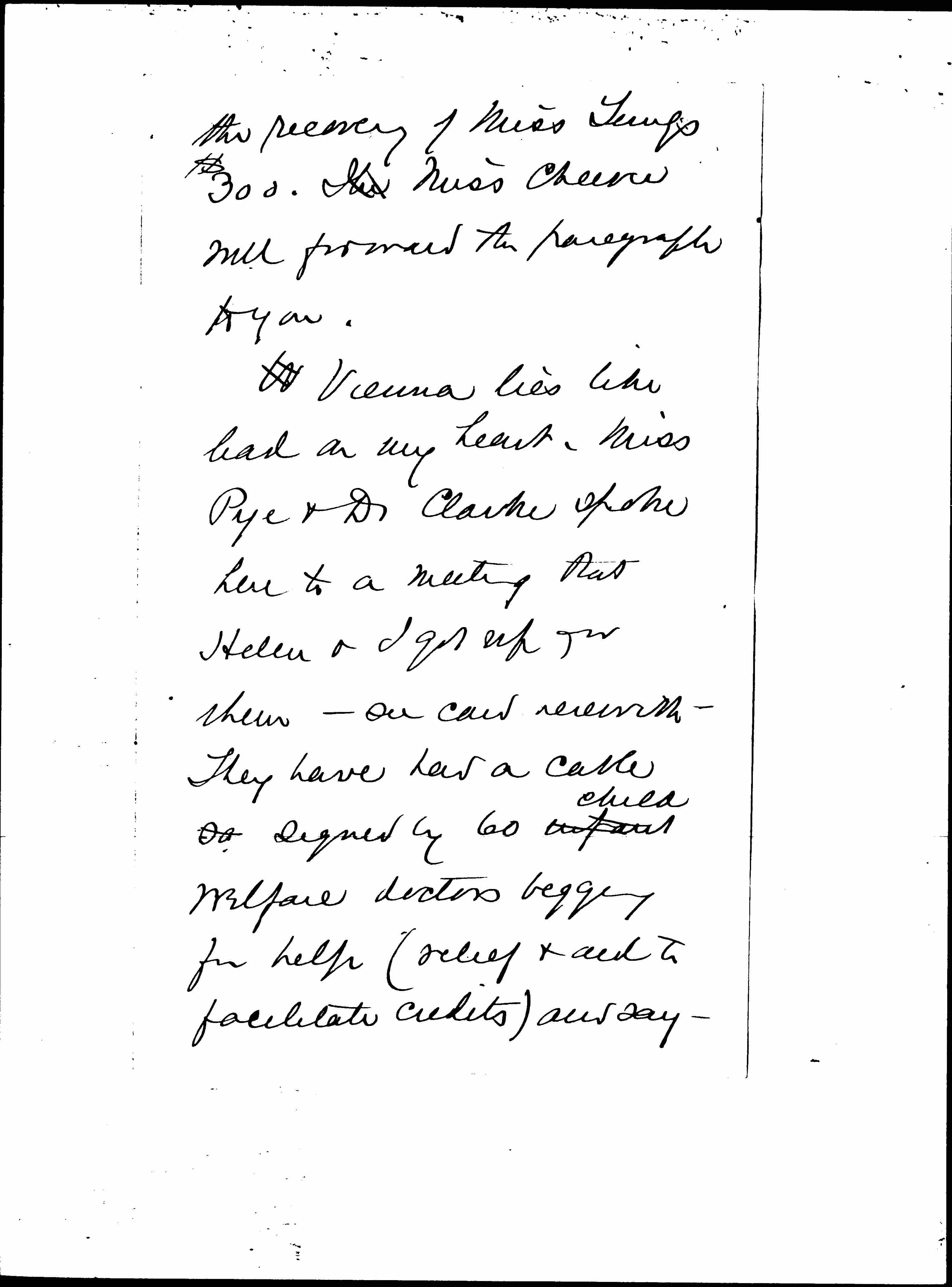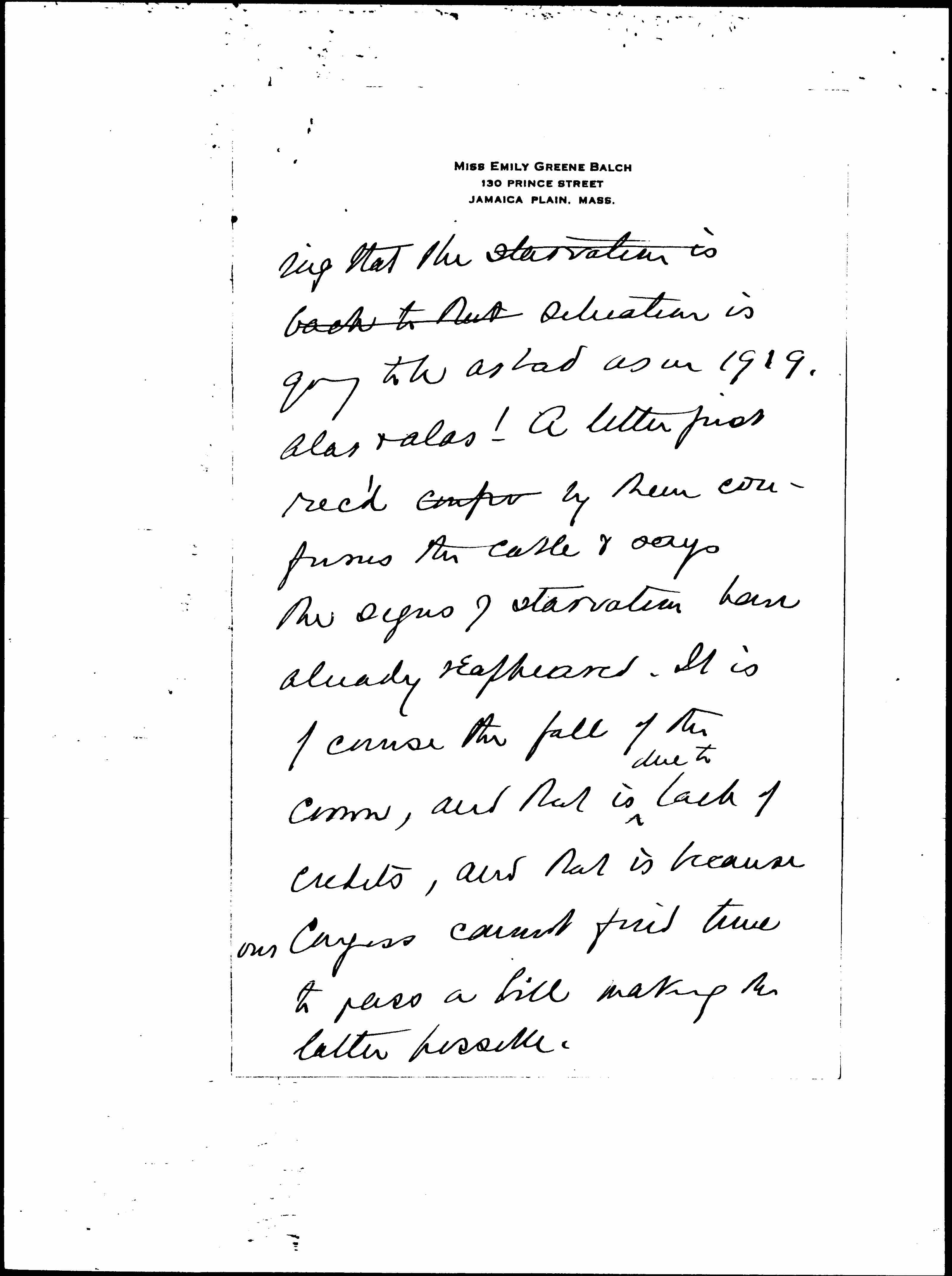 W Vienna lies like lead on my heart. Miss Pye & Dr Clarke spoke here to a meeting that Helen & I got up for them -- see card herewith. They have had a cable signed by 60 infant ↑child↓ welfare doctors begging for help (relief & aid to facilitate credits) and saying [page 9] that the starvation is back to that situation is going to be as bad as 1919. Alas & alas! A letter just rec'd confi by them confirms the cable & says the signs of starvation have already reappeared. It is of course the fall of the crown, and that is ↑due to↓ lack of credits, and that is because ↑our↓ Congress cannot find time to pass a bill making the latter possible. [page 10]
