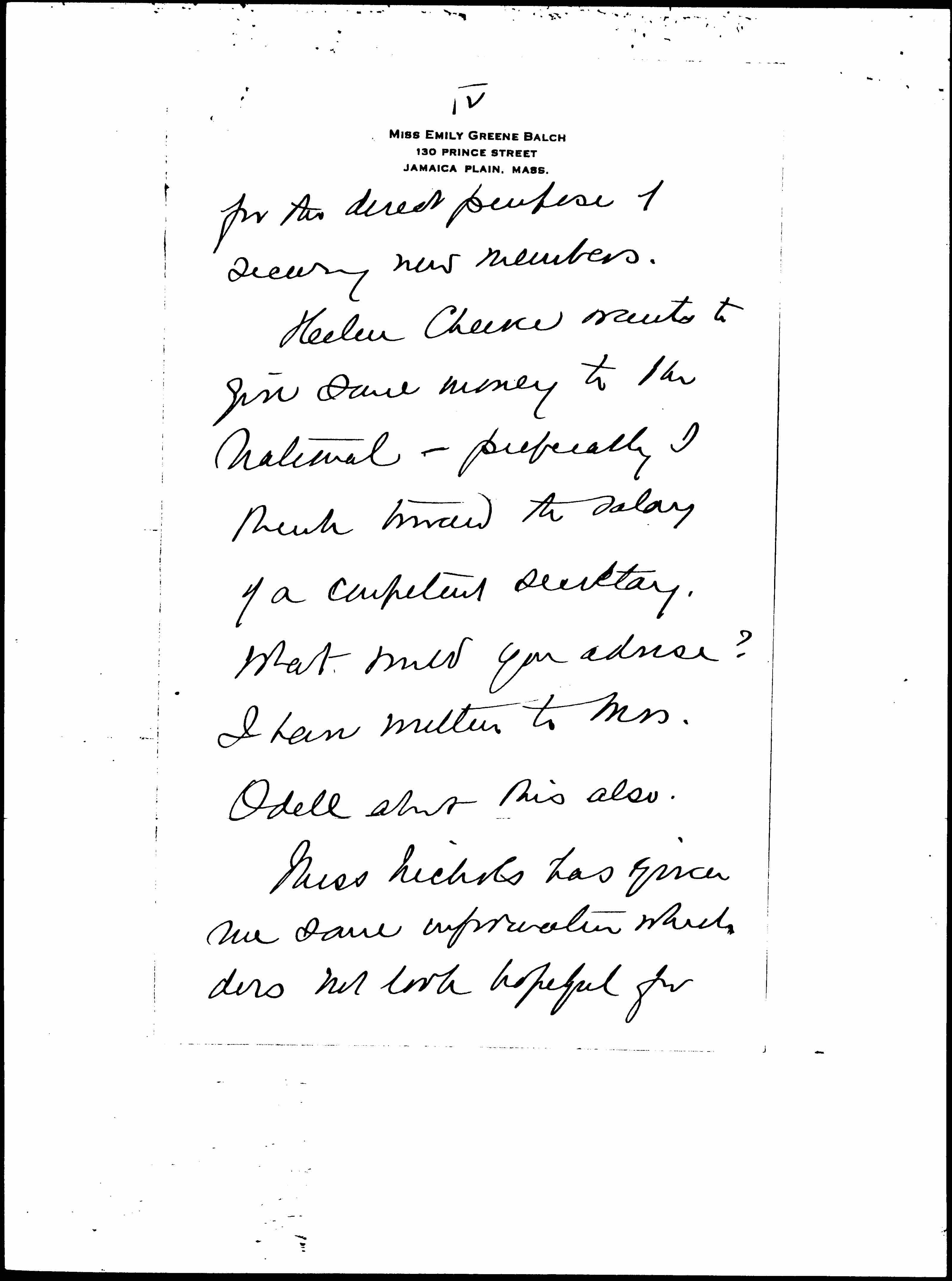 Helen Cheever wants to give some money to the National -- preferably I think toward the salary of a competent secretary. What would you advise? I have written to Mrs Odell about this also.