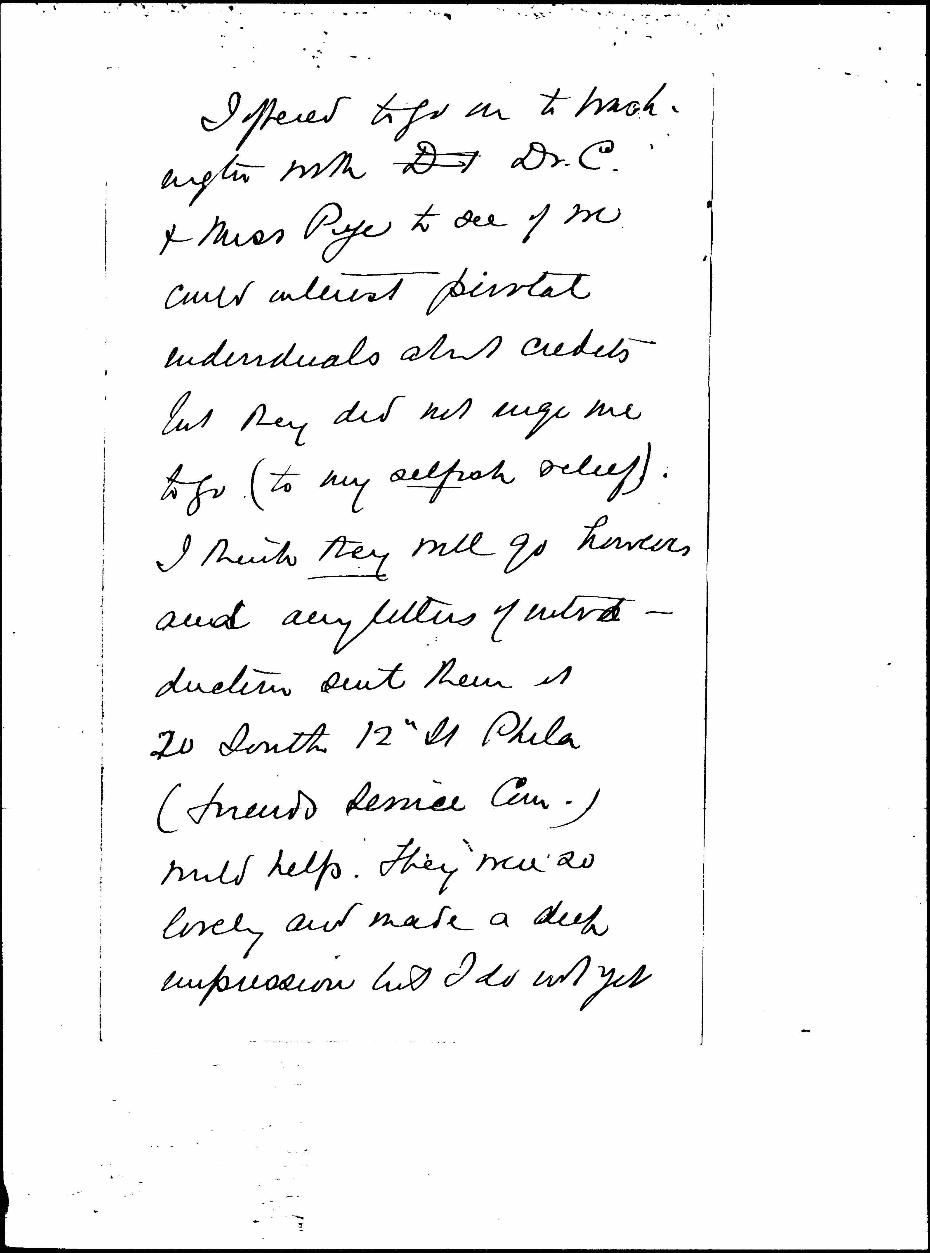 I offered to go on to Washington with D Dr. C. & Miss Pye to see if we could interest pivotal individuals about credits but they did not urge me to go (to my selfish relief). I think they will go however, and any letters of introduction sent them at 20 South 12" St Phila (Friends Service Com.) would help. They were so lovely and made a deep impression but I do not yet [page 11] know how much money we got for them.