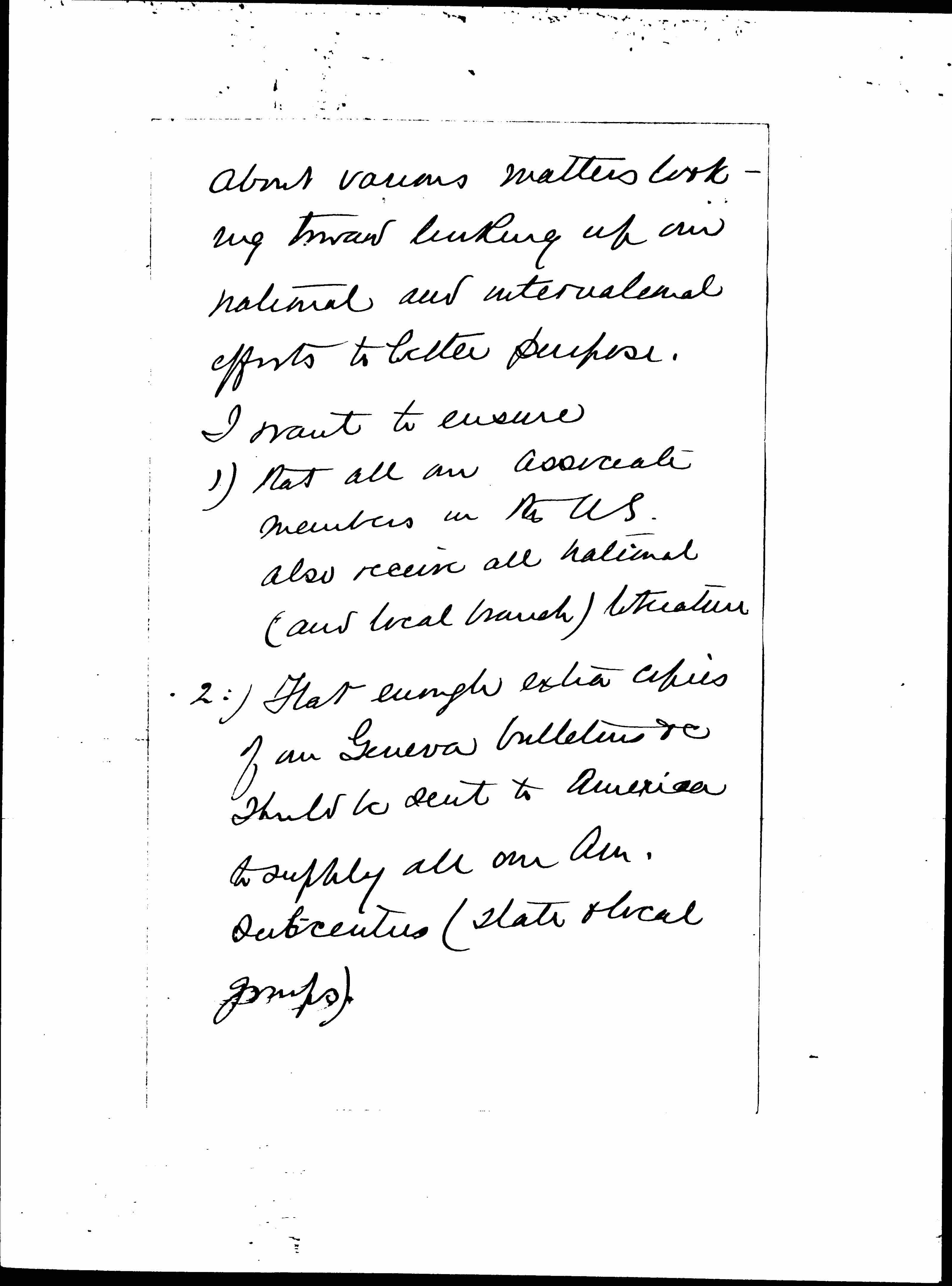 2:) That enough extra copies of our Geneva bulletins [etc.] should be sent to America to supply all our Am. subcenters (state & local groups). [page 3]