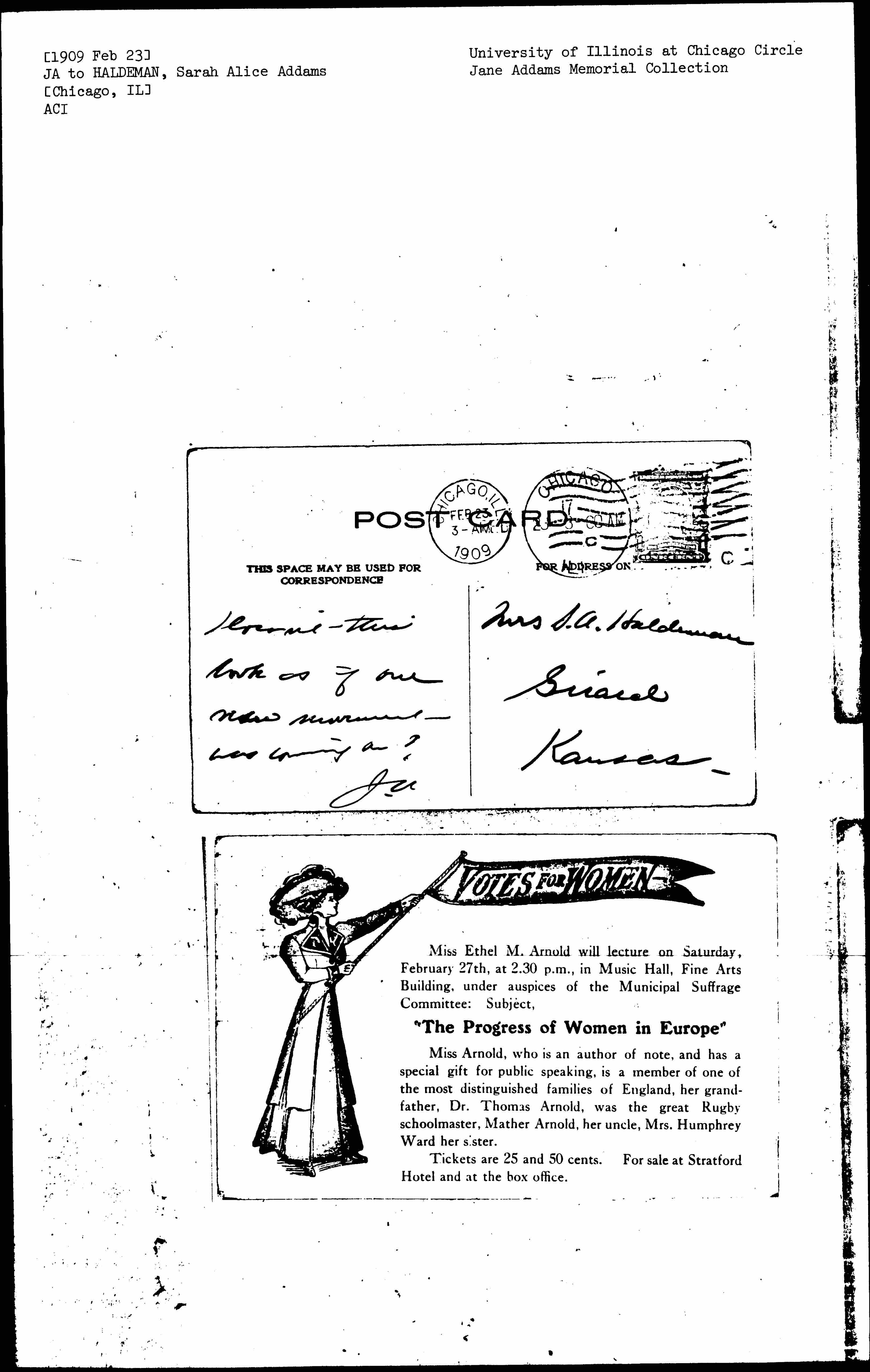 Miss Ethel M. Arnold will lecture on Saturday, February 27th, at 2:30 p.m., in Music Hall, Fine Arts Building, under auspices of the Municipal Suffrage Committee: Subject,
