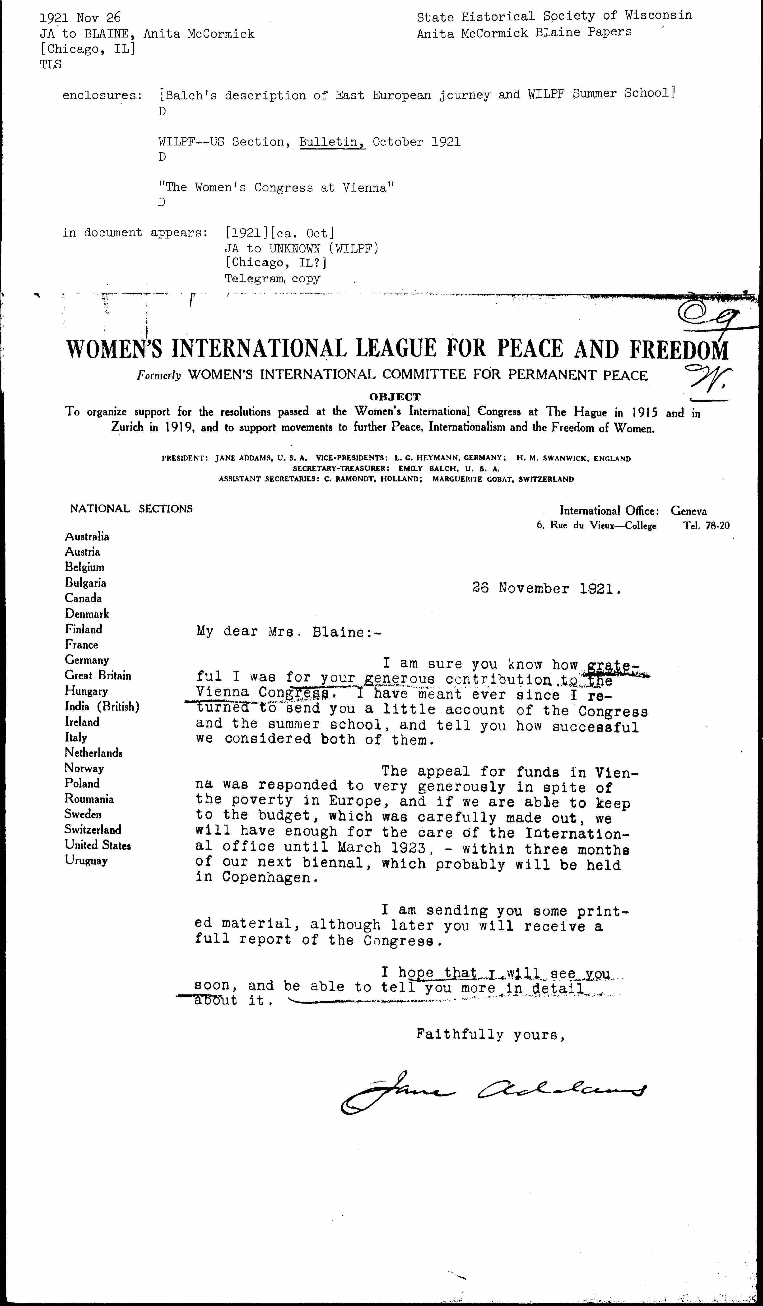 The appeal for funds in Vienna was responded to very generously in spite of the poverty in Europe, and if we are able to keep to the budget, which was carefully made out, we will have enough for the care of the International office until March 1923 - within three months of our next [biennial], which probably will be held in Copenhagen.