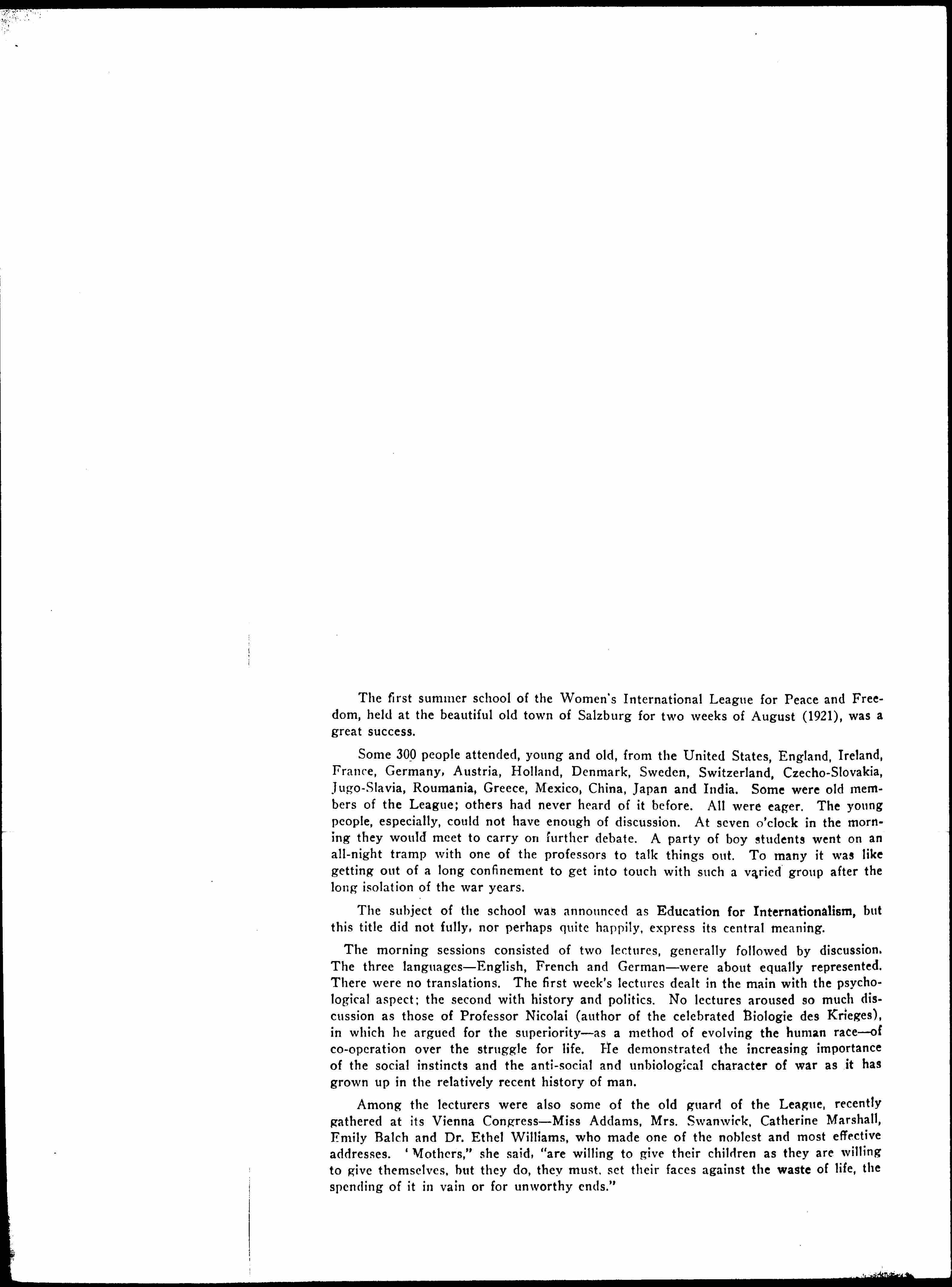 The morning sessions consisted of two lectures, generally followed by discussion. The three languages -- English, French, and German -- were about equally represented. There were no translations. The first week's lectures dealt in the main with the psychological aspect; the second with history and politics. No lectures aroused so much discussion as those of Professor Nicolai (author of the celebrated Biologie des Krieges), in which he argued for the superiority -- as a method of evolving the human race -- of [cooperation] over the struggle for life. He demonstrated the increasing importance of the social instincts and the anti-social and unbiological character of war as it has grown up in the relatively recent history of man.