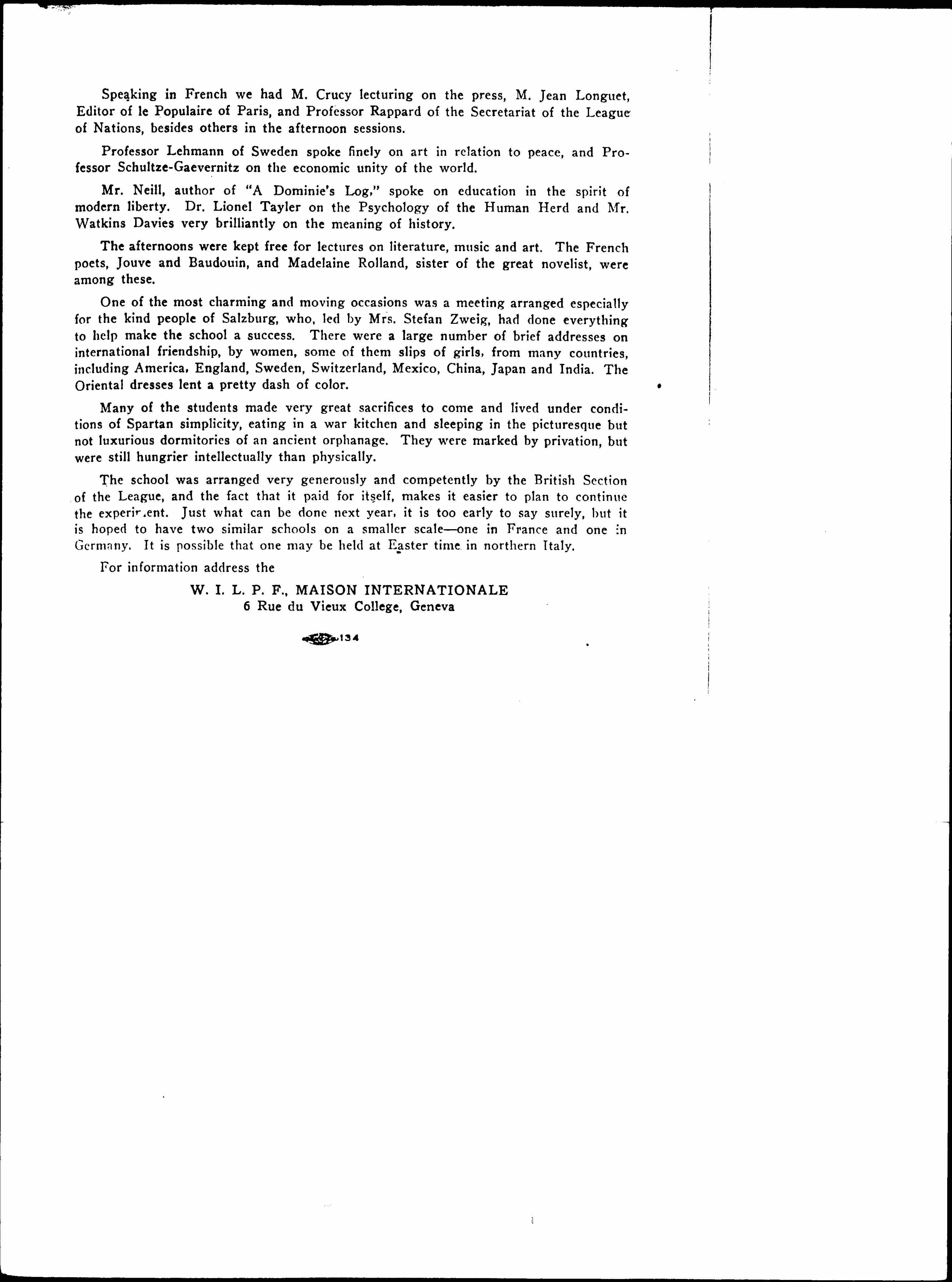 One of the most charming and moving occasions was a meeting arranged especially for the kind people of Salzburg, who, led by Mrs. Stefan Zweig, had done everything to help made the school a success. There were a large number of brief addresses on international friendship, by women, some of them slips of girls, from many countries, including America, England, Sweden, Switzerland, Mexico, China, Japan and India. The Oriental dresses lent a pretty dash of color.