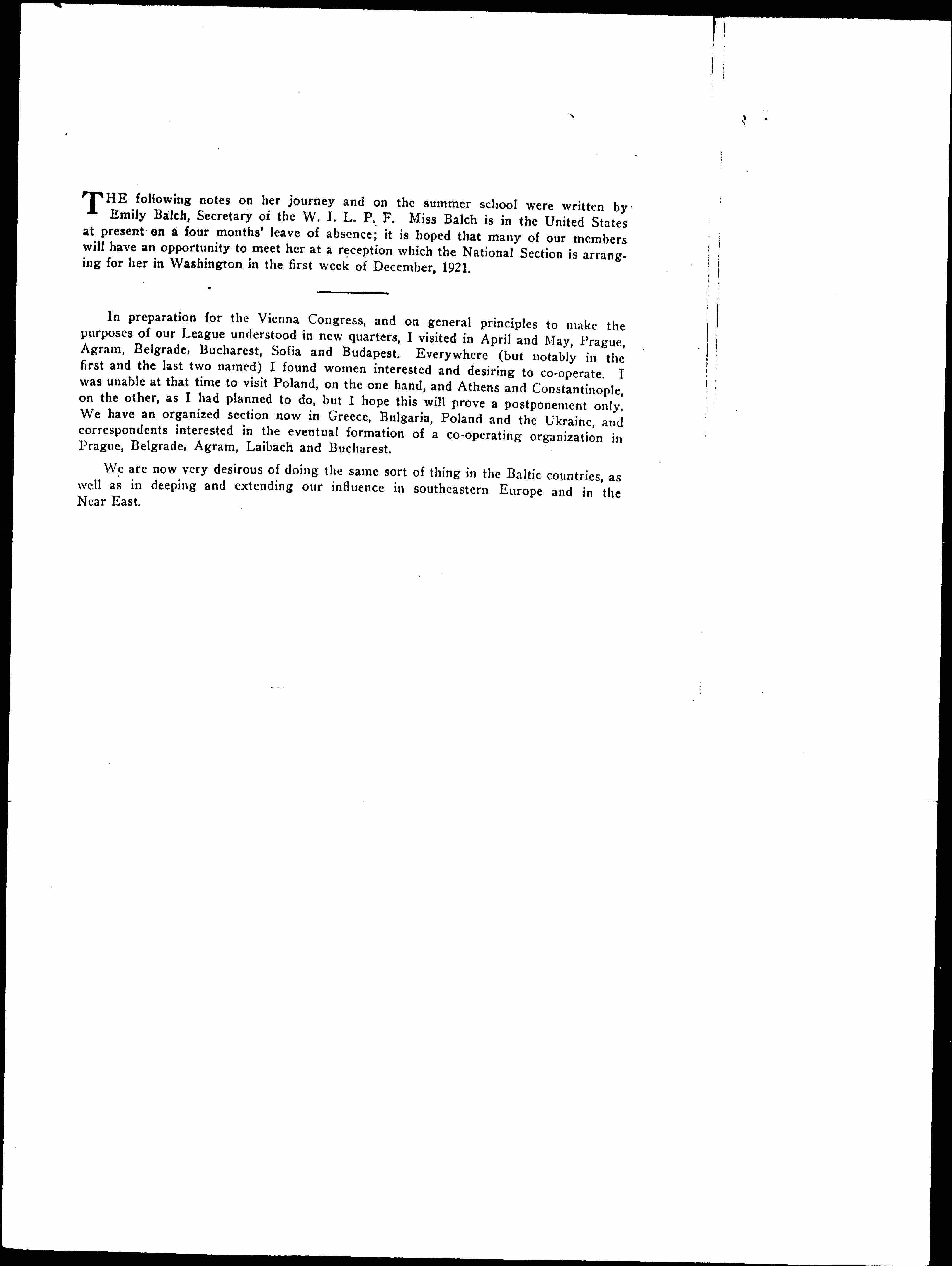 In preparation for the Vienna Congress, and on general principles to make the purposes of our League understood in new quarters, I visited in April and May, Prague, Agram, Belgrade, Bucharest, Sofia and Budapest. Everywhere (but notably in the first and the last two named) I found women interested and desiring to [cooperate]. I was unable at that time to visit Poland, on the one hand, and Athens and Constantinople, on the other, as I had planned to do, but I hope this will prove a postponement only. We have an organized section now in Greece, Bulgaria, Poland and the Ukraine, and correspondents interested in the eventual formation of a [cooperating] organization in Prague, Belgrade, Agram, Laibach and Bucharest.