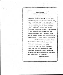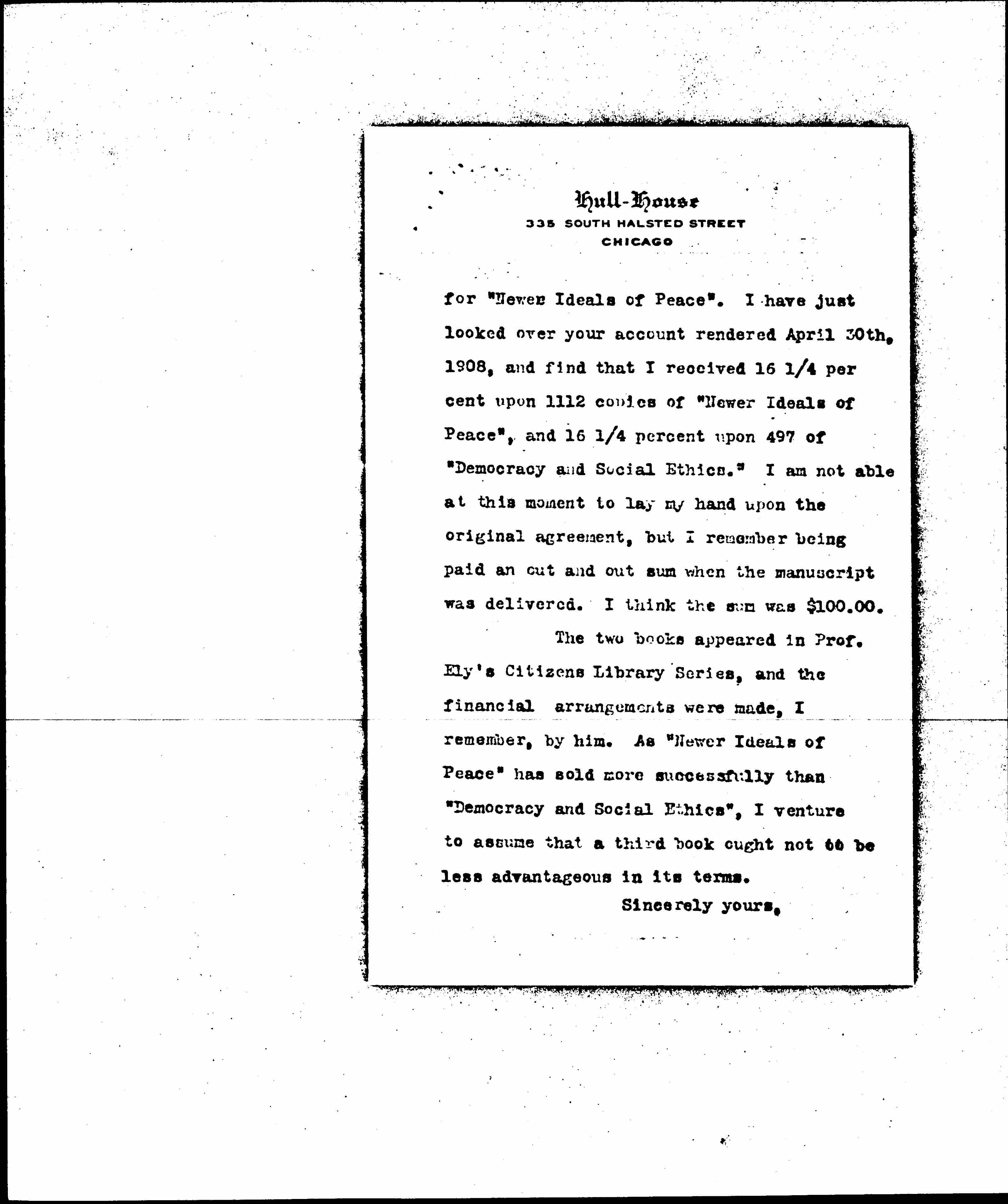 The terms you suggest are not as advantageous as those your company gave me [page 2] for "Newer Ideals of Peace". I have just looked over your account rendered April 30th, 1908, and find that I received 16 1/4 per cent upon 1112 copies of "Newer Ideals of Peace," and 16 1/4 percent upon 497 of "Democracy and Social Ethics." I am not able at this moment to lay my hand upon the original agreement, but I remember being paid an out and out sum when the manuscript was delivered. I think the sum was $100.00.