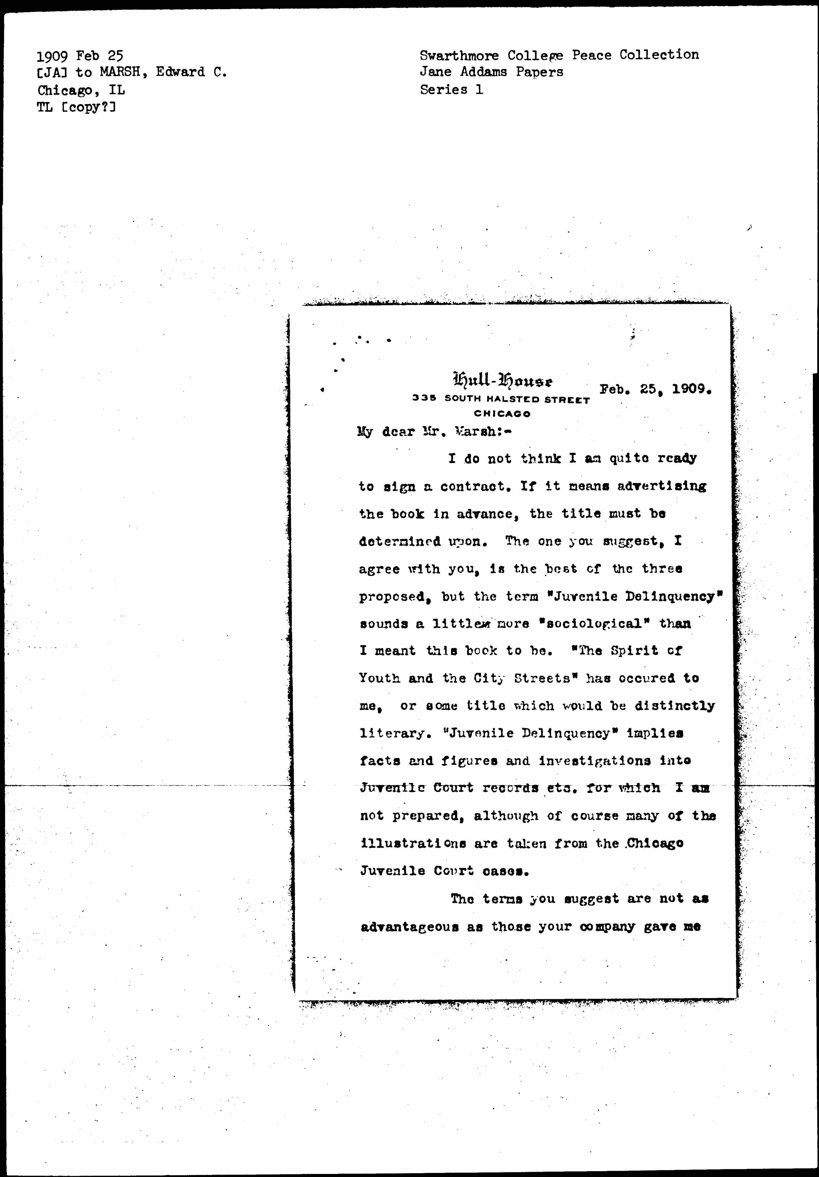 I do not think I am quite ready to sign a contract. If it means advertising the book in advance, the title must be determined upon. The one you suggest, I agree with you, is the best of the three proposed, but the term "Juvenile Delinquency" sounds a little more "sociological" than I meant this book to be. "The Spirit of Youth and the City Streets" has occurred to me, or some title which would be distinctly literary. "Juvenile Delinquency" implies facts and figures and investigations into Juvenile Court records, etc. for which I am not prepared, although of course many of the illustrations are taken from the Chicago Juvenile Court cases.